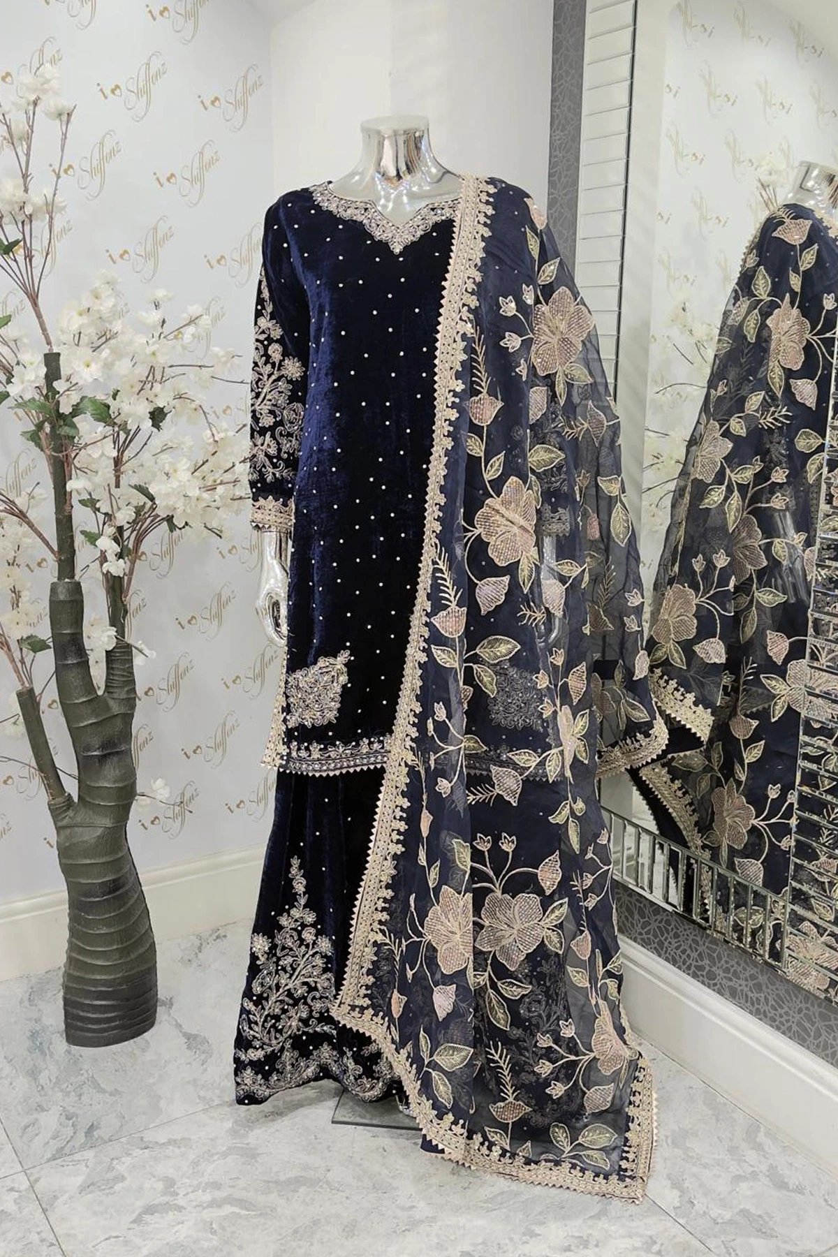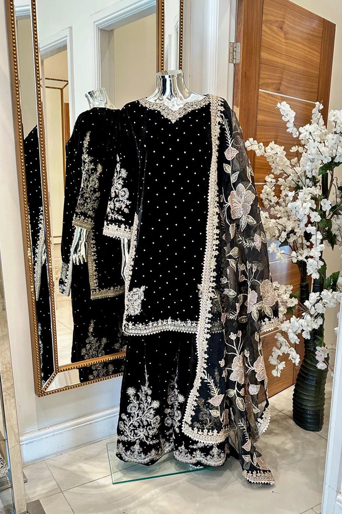 This beautiful 3 piece velvet suit features a straight shirt with luxury dori work embroidered neckline and border with scattered diamante throughout, finished with embroidered full length sleeves. Paired with an embroidered plazo and the look is finished with an embroidered organza dupatta.