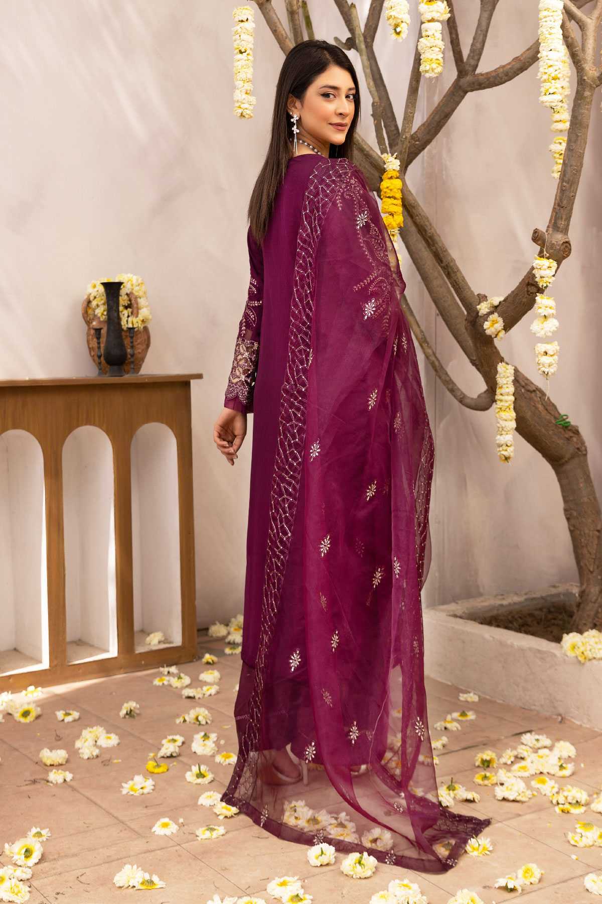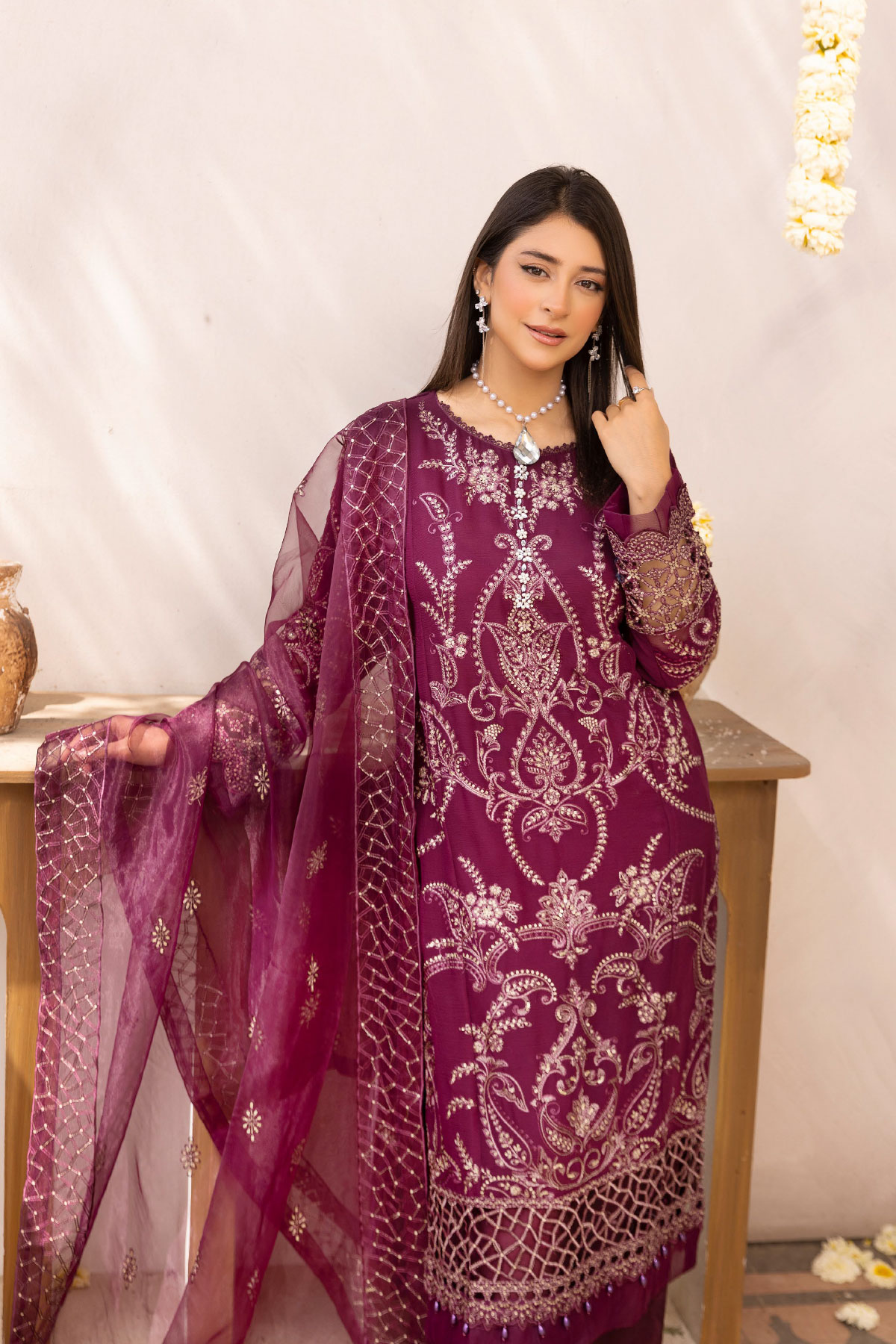 This beautiful 3 piece Nazish lux collection features a straight shirt with luxury thread work embroidery with bead embellishment on the front neckline and border, finished with full length embroidered sleeves. Paired with straight leg crepe trousers. The look is finished with an embroidered organza dupatta. Perfect mother and daughter partywear collection for this Eid.