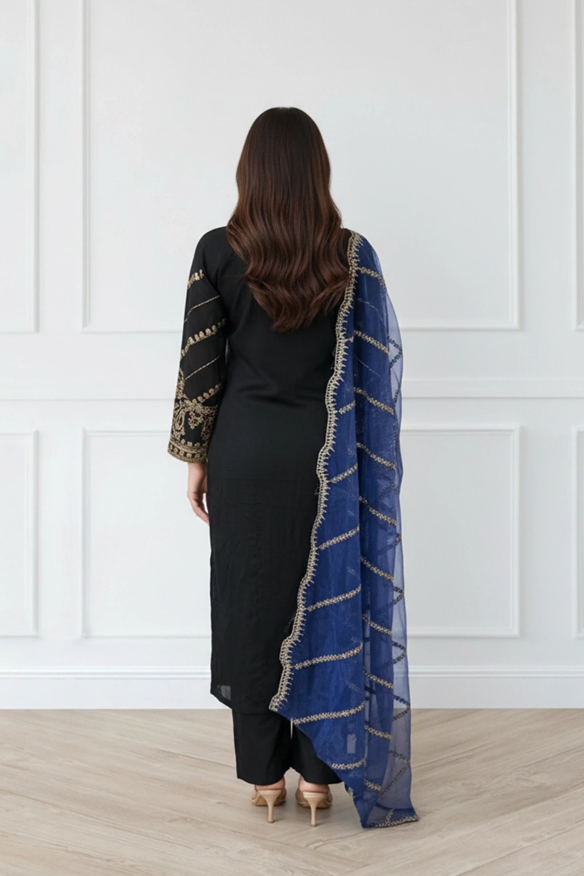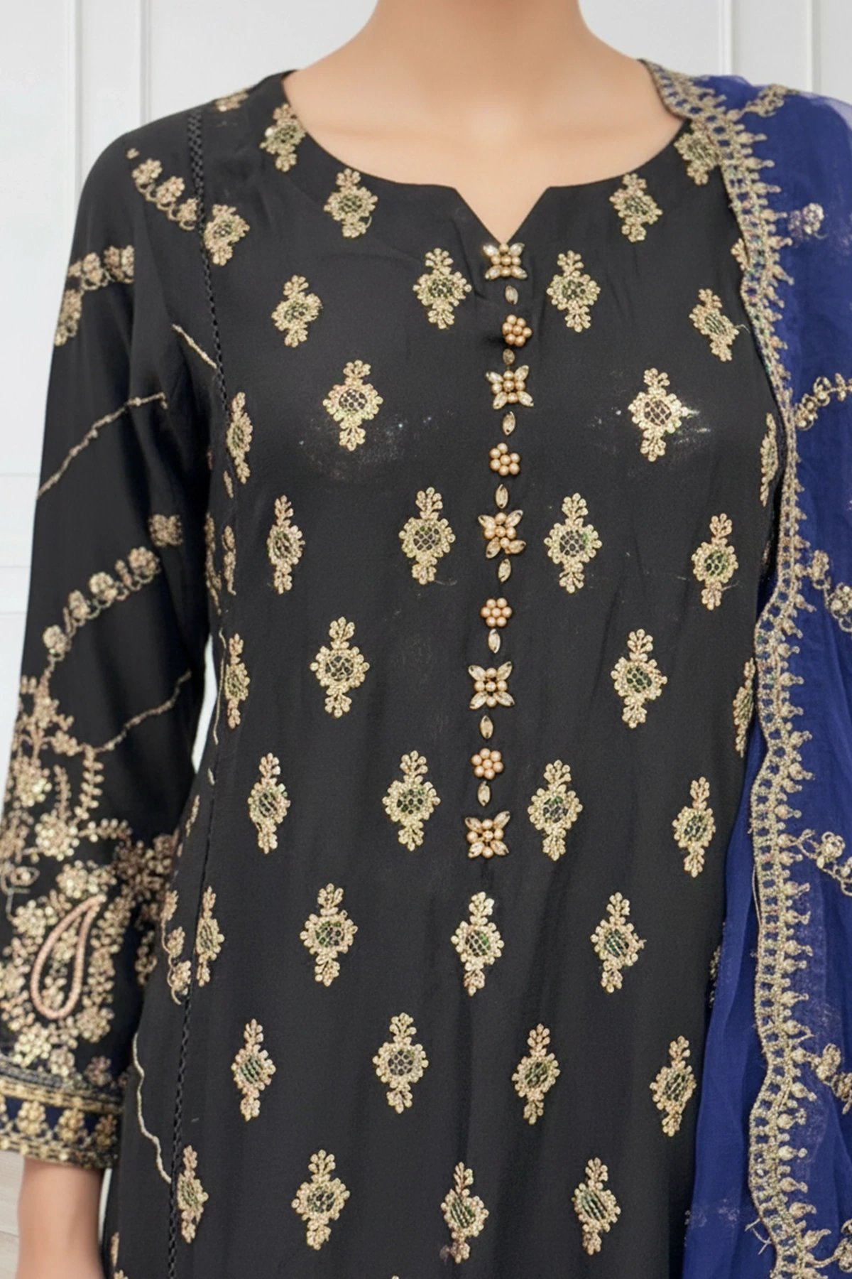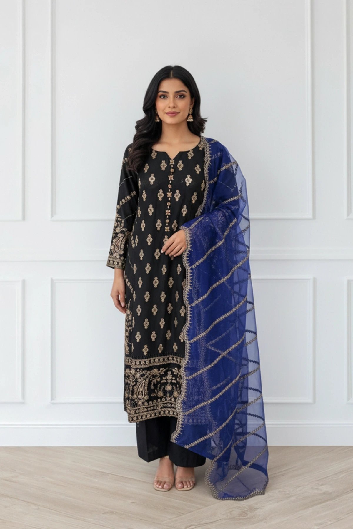 This beautiful 3 piece Nazish lux collection features a straight shirt with luxury sequence embroidered patterns with thread and tilla work embellishments on the border, finished with full length embroidered sleeves. Paired with plazo crepe trousers. The look is finished with an embroidered organza contrasted dupatta. Perfect mother and daughter partywear collection for this Eid.
