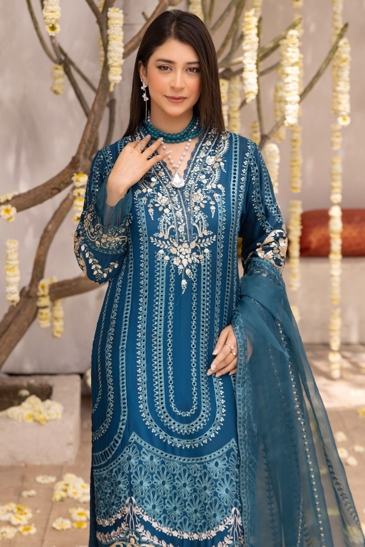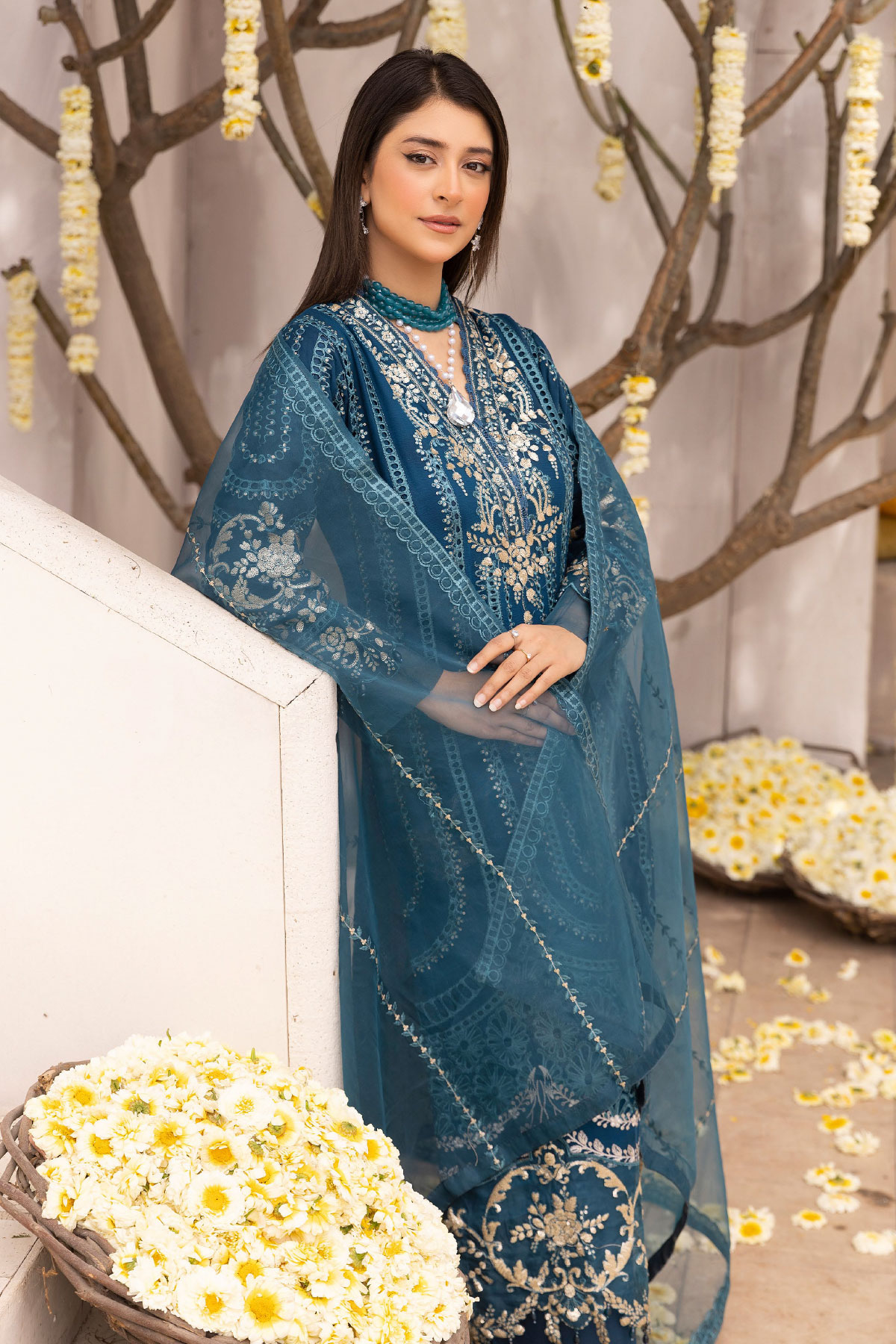 This beautiful 3 piece Nazish lux collection features a straight shirt with luxury thread work embroidery with sequence embellishment on the front neckline and border, finished with full length embroidered sleeves. Paired with straight leg crepe trousers. The look is finished with an embroidered organza dupatta. Perfect mother and daughter partywear collection for this Eid.