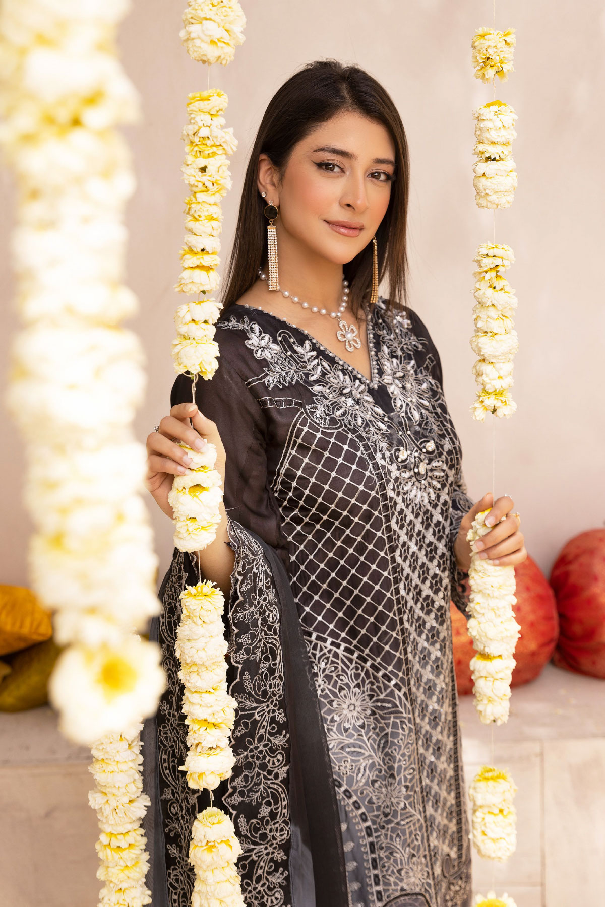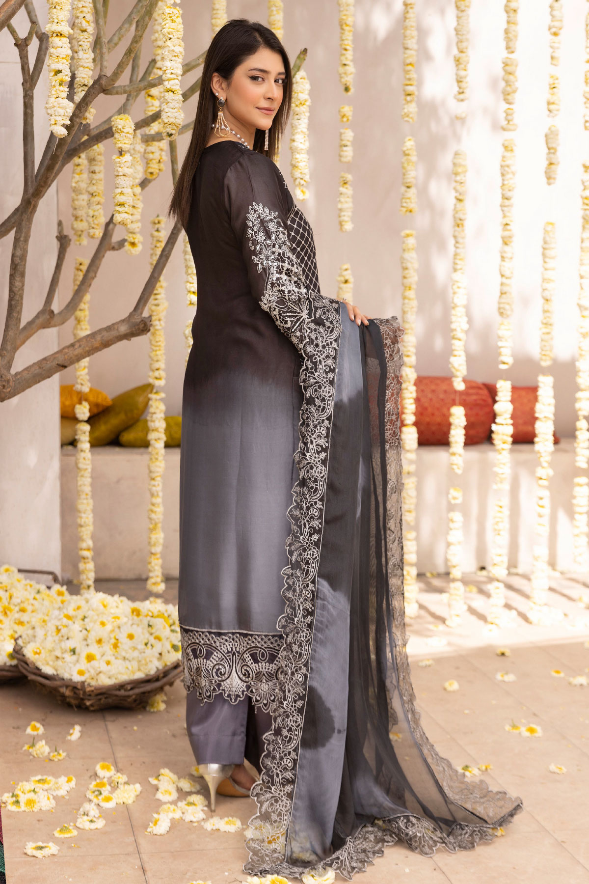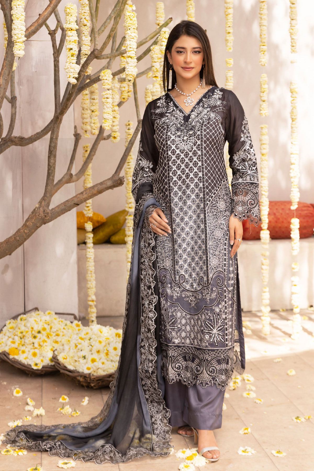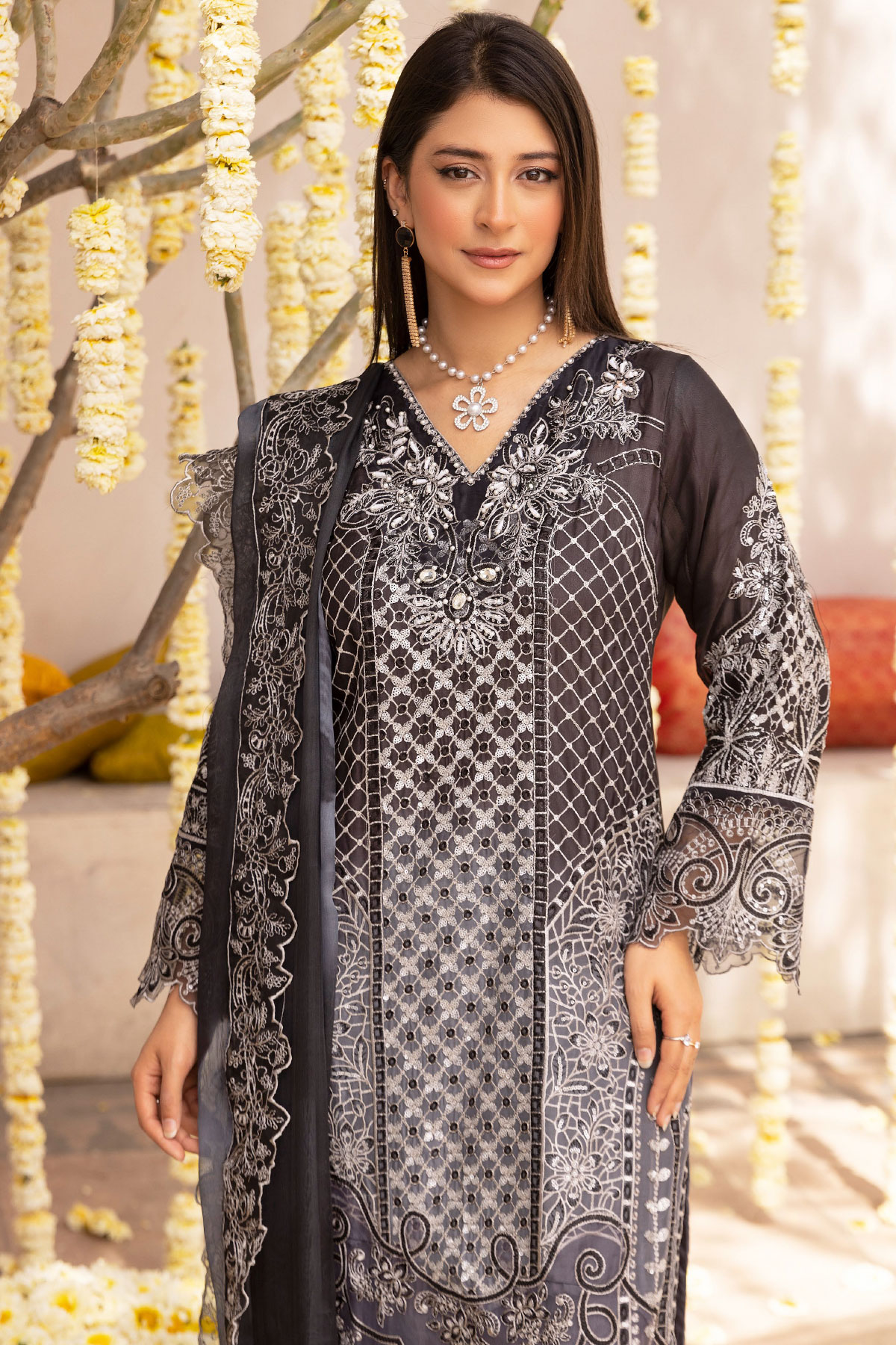 This beautiful 3 piece Nazish lux collection features a straight shirt with luxury thread work embroidery throughout with a cut work embellished border, finished with full length embroidered sleeves. Paired with straight leg crepe trousers. The look is finished with an embroidered chiffon dupatta. Perfect mother and daughter partywear collection for this Eid.
