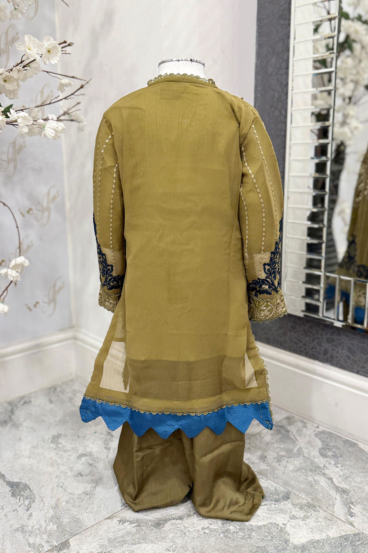 This beautiful 3 piece Nazish lux kids collection features a straight shirt with luxury thread work embroidery with bead embellishment on the border, finished with full length embroidered sleeves. Paired with straight leg crepe trousers. The look is finished with an embroidered chiffon dupatta. Perfect mother and daughter partywear collection for this Eid.