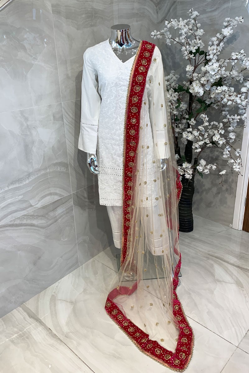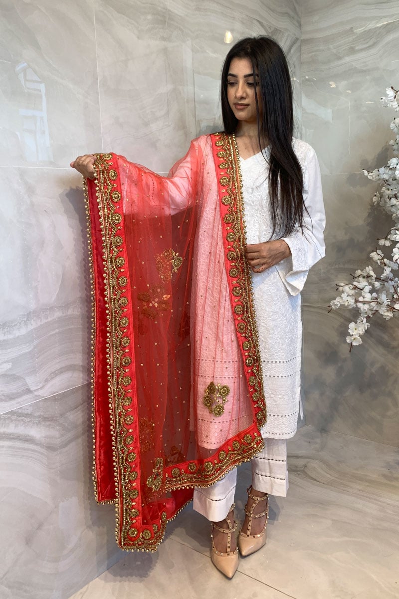 Add a touch of elegance to your wardrobe with this exquisite piece of splendid net dupatta. Swathed with embroidery and delicate bead work, finished with a contrasted bead embroiderd border, this versatile stunner is a must in your collection.