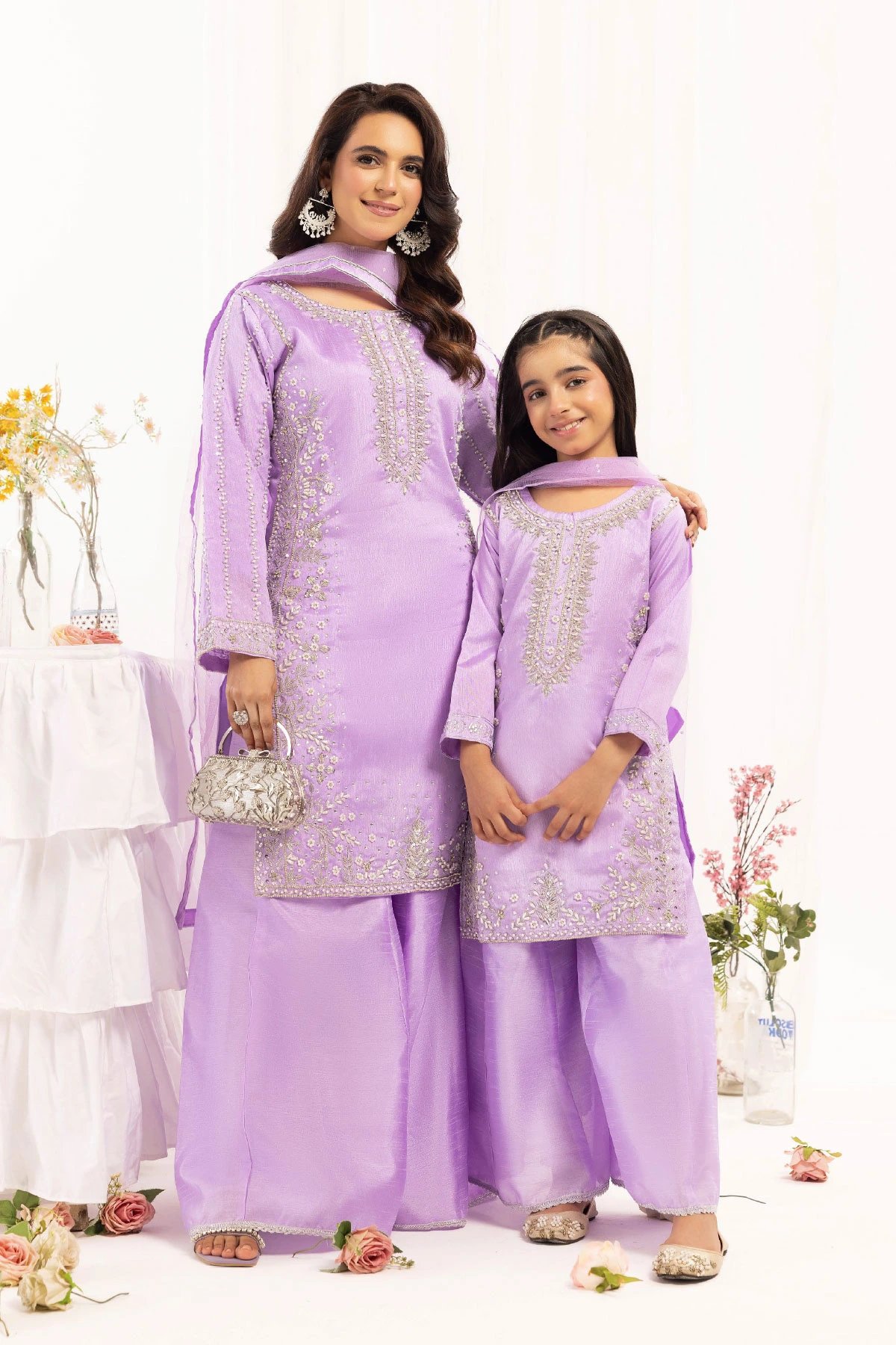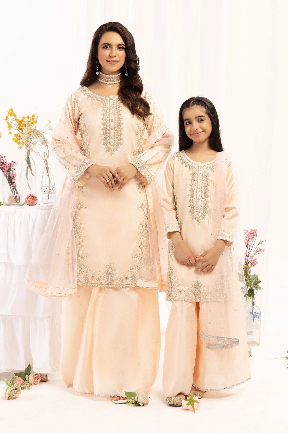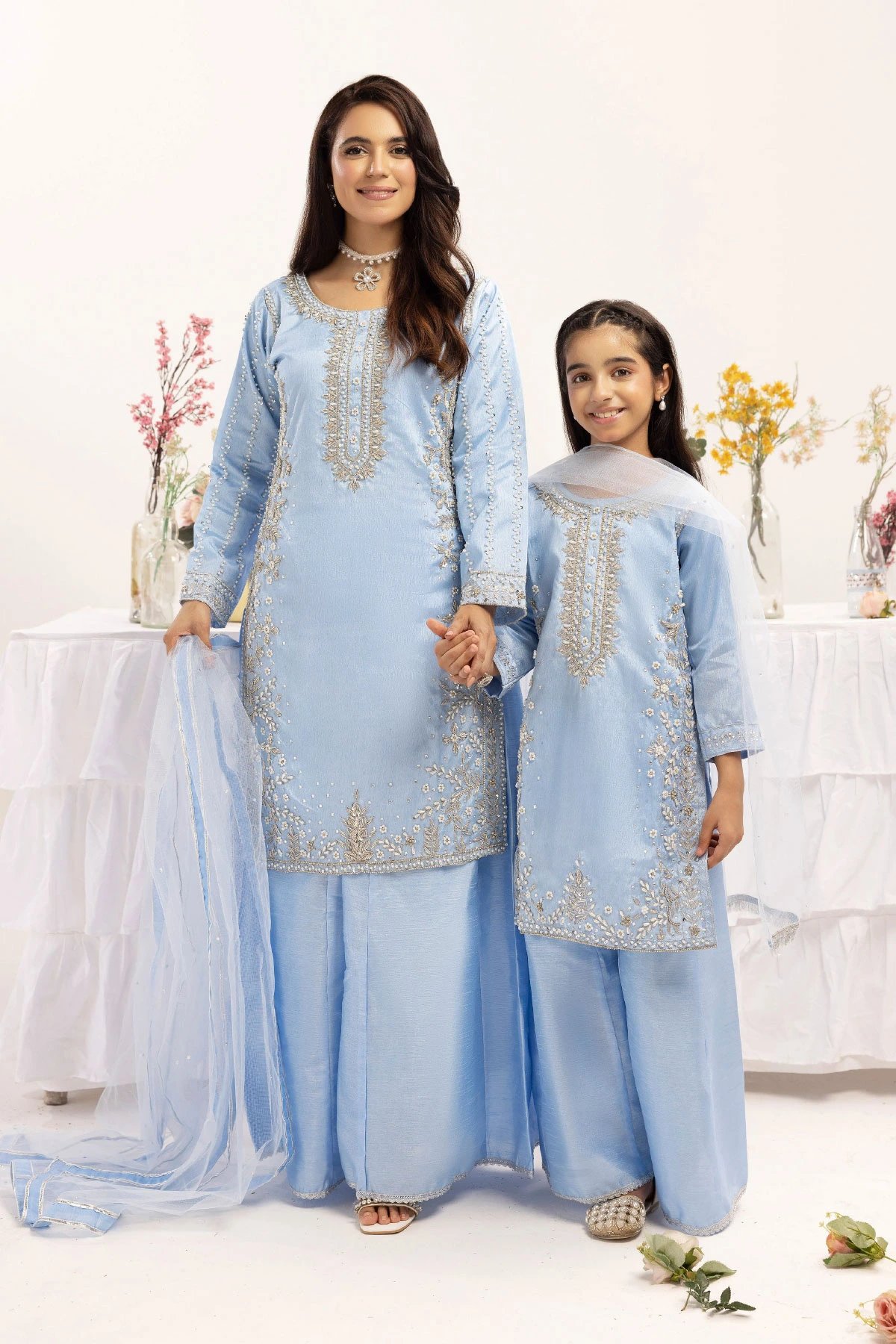 This beautiful 3 piece kids mother and daughter collection features a raw silk straight shirt with embroidered beaded work with full length embroidered sleeves. Paired with an embroidered plated plazo and the look is finished with a net dupatta. Perfect mother and daughter collection for this wedding season.