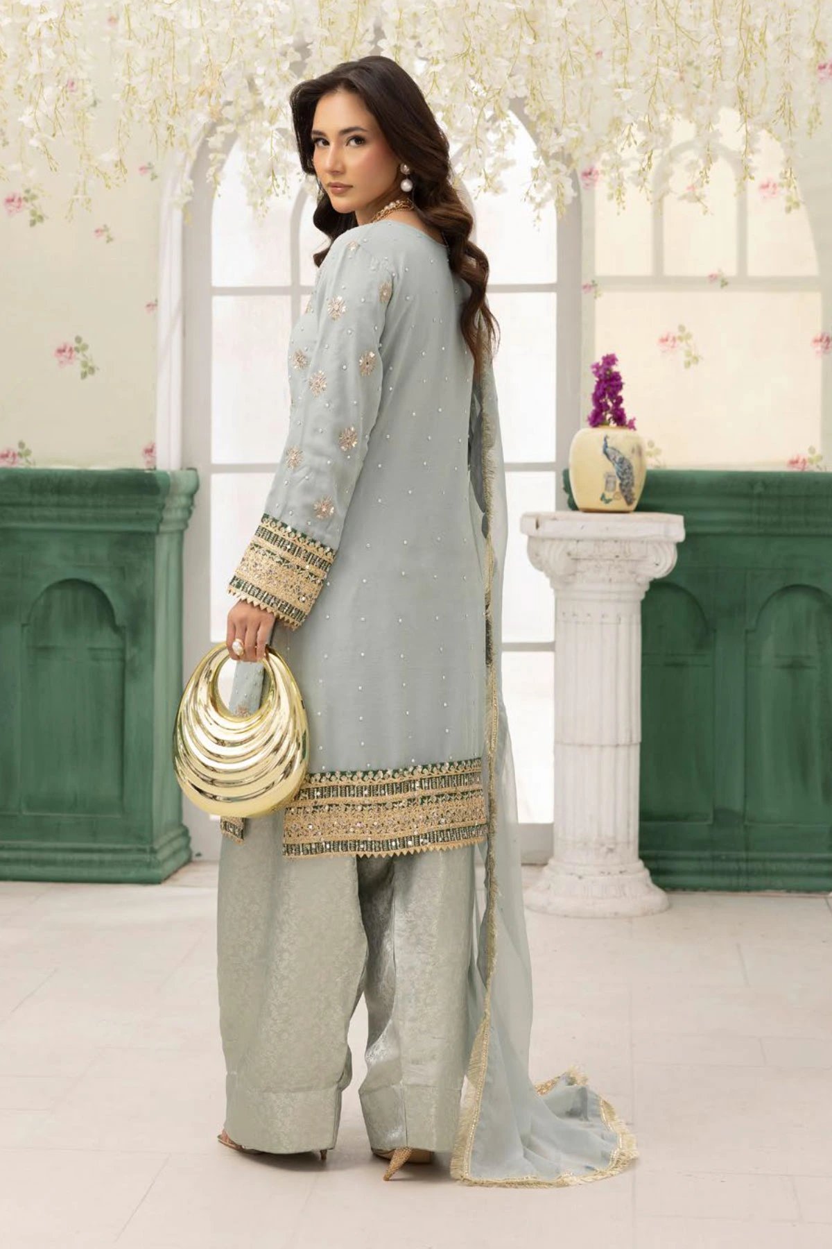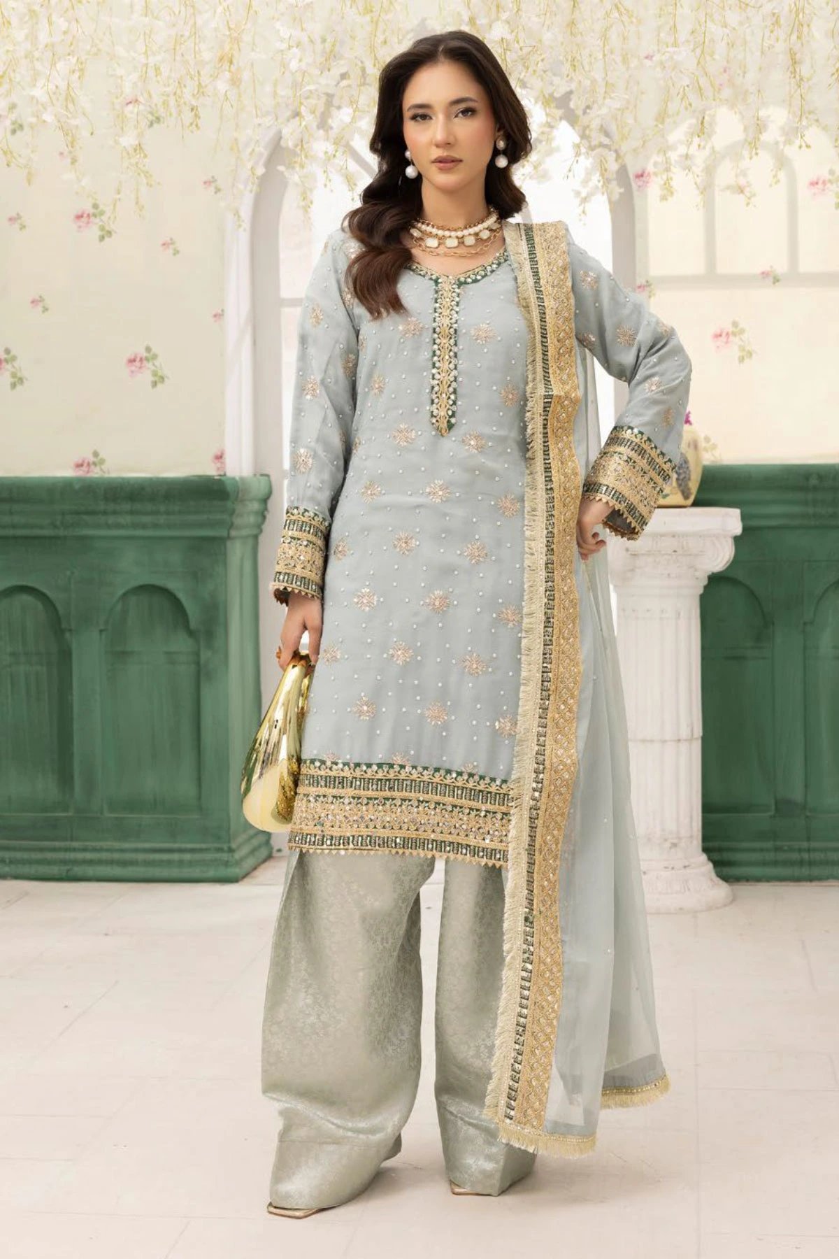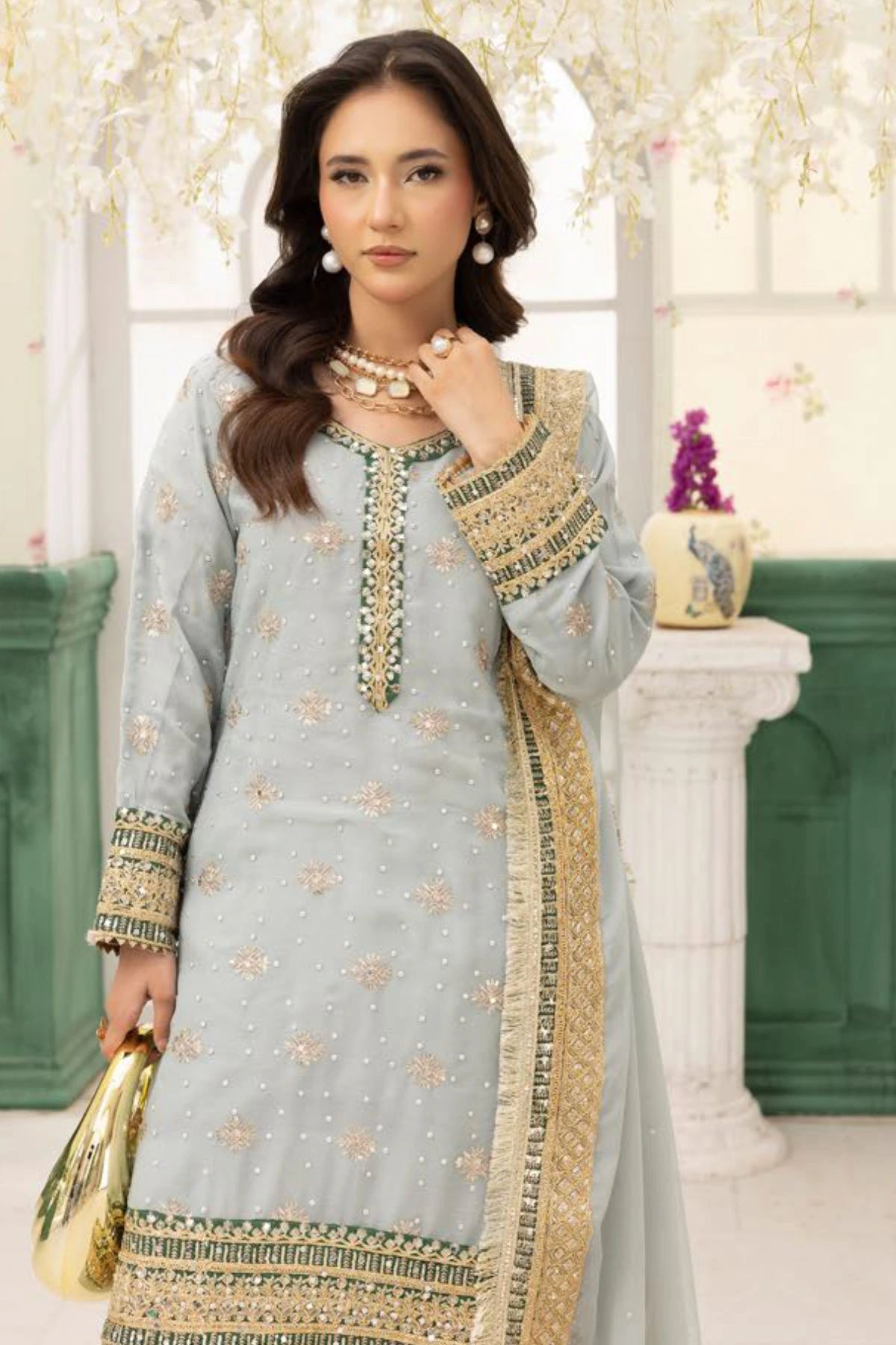This beautiful 3 piece chiffon suit features a straight shirt with luxury thread work embroidery throughout with scattered diamantés, finished with full length embroidery sleeves. Paired with a jamawar farshi shalwar. The look is finished with a chiffon embroidered dupatta.