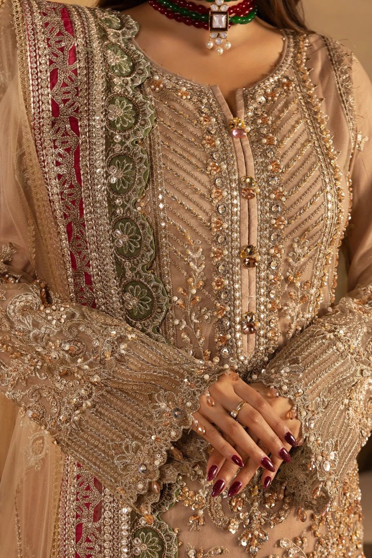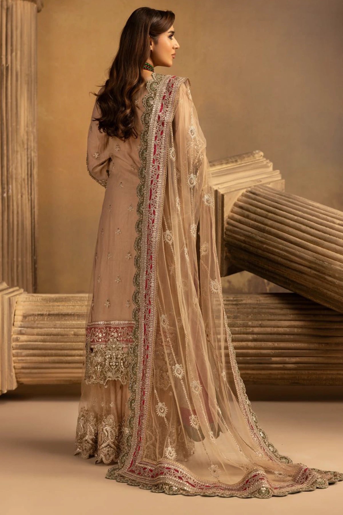 This beautiful 3 piece suit features a straight shirt with luxury thread work embroidery with motif and sequence embellishments with full length embroidered sleeves. Paired with a net embroidered sharara and the look is finished with a net embroidered dupatta.