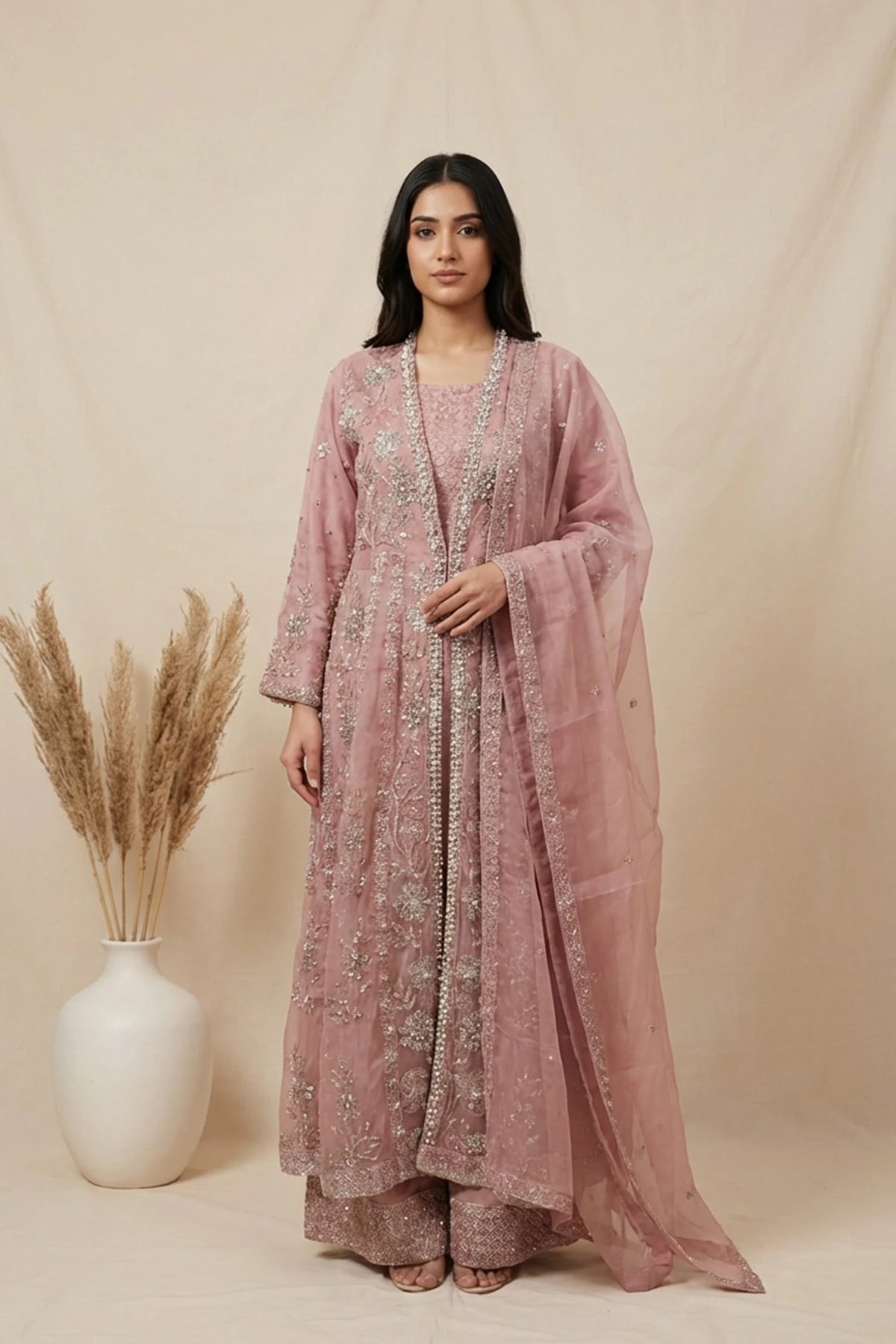 This beautiful 3 piece Ivana suit features an organza maxi dress with luxury thread work embroidery with scattered diamantes, finished with full length embroidered sleeves and a sleeveless inner gown with an embroidered top and border. It comes with a straight leg trouser and the look is finished with an embroidered organza dupatta.