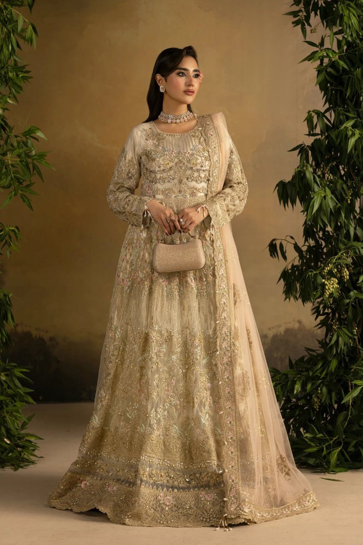 This beautiful 3 piece suit features a long gown with luxury thread work embroidery along with beads and motif embellishments throughout finished with full length embroidered sleeves with dangling beads on the cuffs. Paired with straight leg crepe trousers and the look is finished with a contrasted net embroidered dupatta with tassel embellishments on the border.