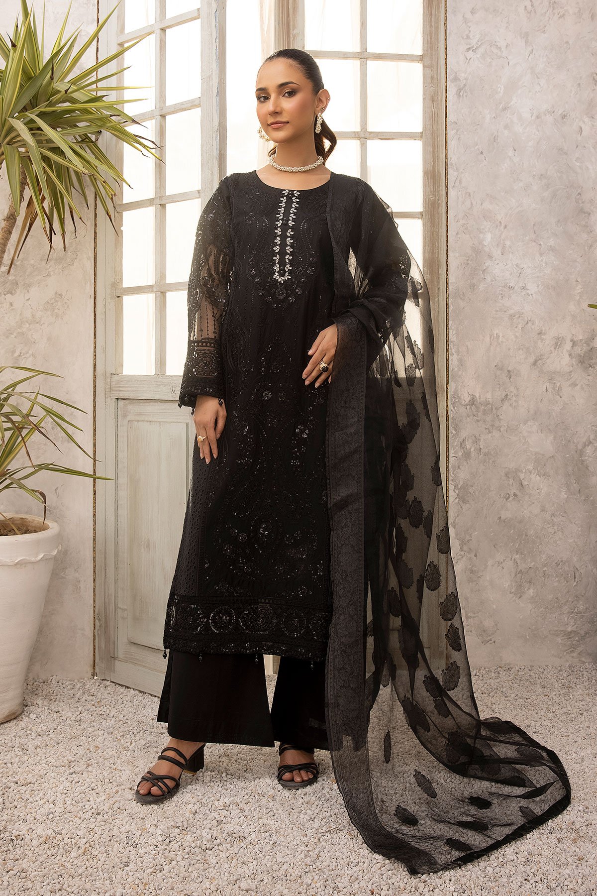 This beautiful 3 piece Noor collection features a straight shirt with luxury thread work embroidery throughout with sequence embellishment, finished with bead embellishment on the neckline. It comes with full length embroidered sleeves and straight leg trousers. The look is finished with a jacquard printed organza dupatta.