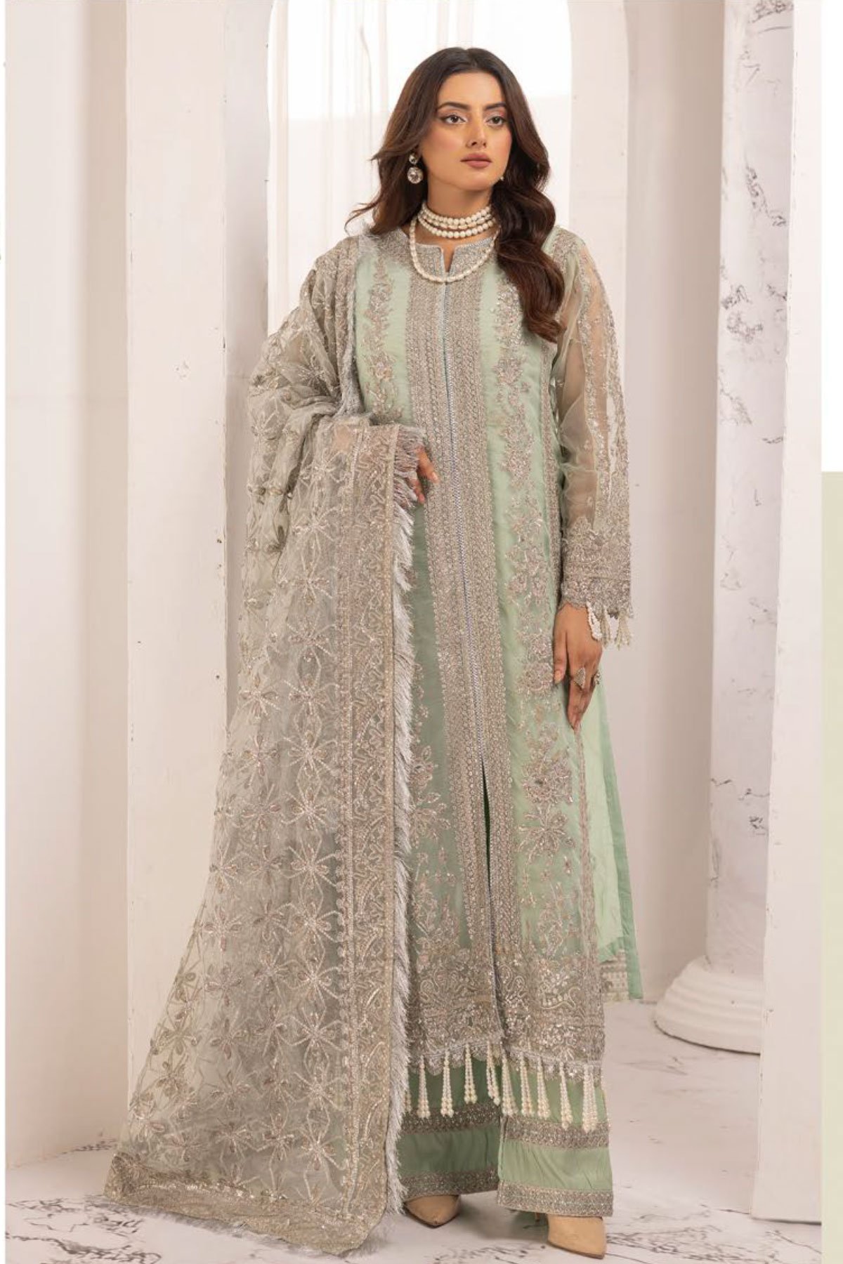 This beautiful 3 piece Noori collection suit features a straight open style shirt with luxury thread work embroidery throughout with sequence embellishment, finished with pearl dangling bead embellishment on the border as well as full length embroidered sleeves. It comes with wide leg embroidered trousers and the look is finished with a net embroidered dupatta.