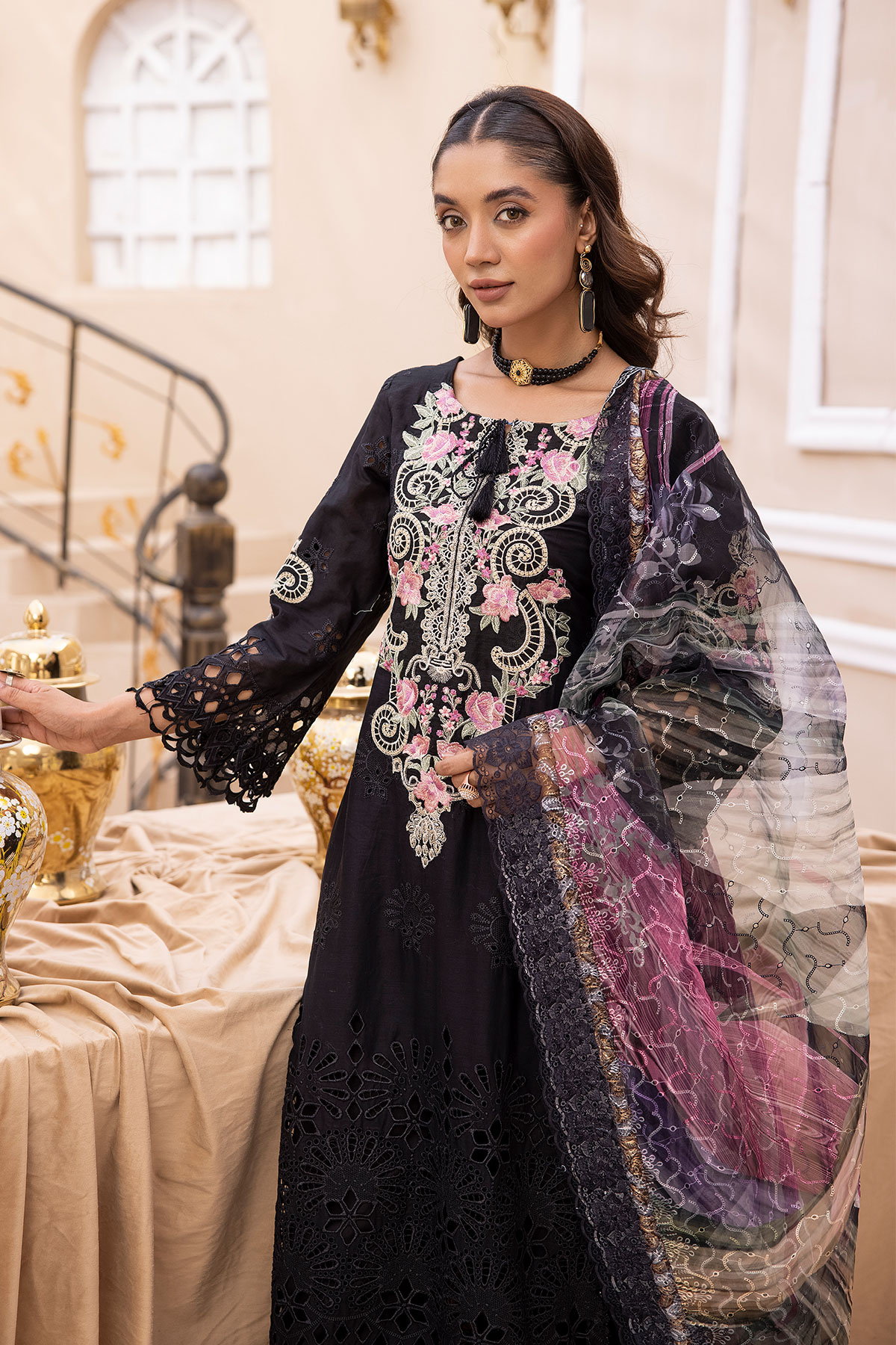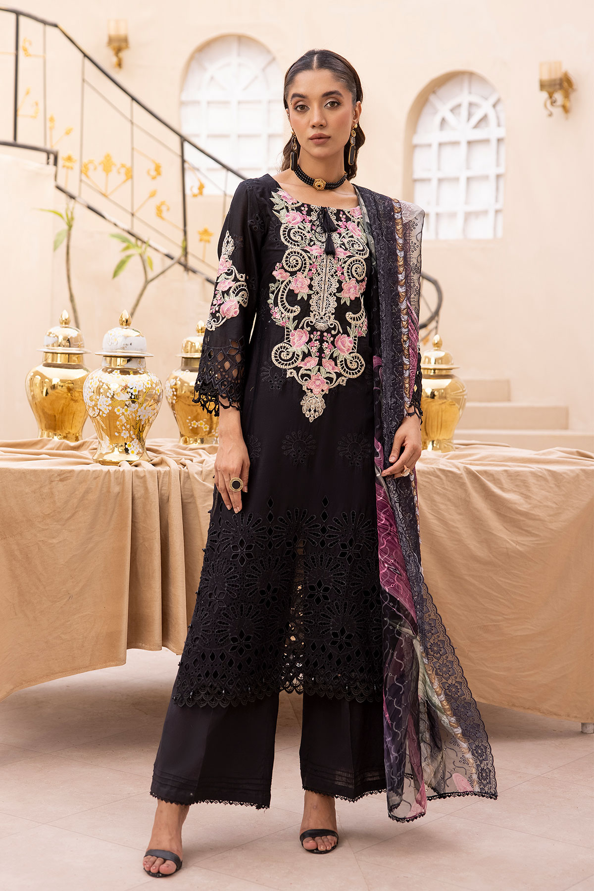This beautiful 3 piece Noori chikan kari suit features a straight shirt with thread floral embroidered front, finished with lace embellished border and full length embroidered sleeves. Paired with wide leg trousers with piping embellishments and the look is finished with a printed organza dupatta.