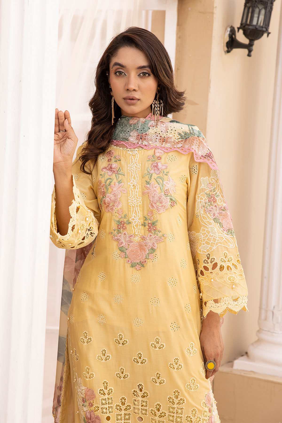 This beautiful 3 piece Noori chikan kari suit features a straight shirt with thread floral embroidered front, finished with lace embellished border and full length embroidered sleeves. Paired with wide leg trousers with piping embellishments and the look is finished with a printed silk dupatta.