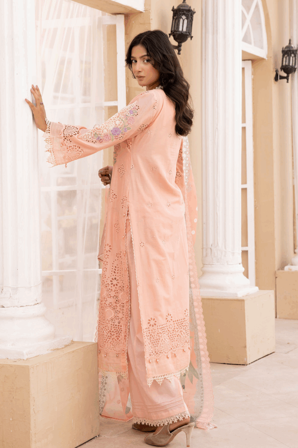 This beautiful 3 piece Noori chikan kari suit features a straight shirt with thread floral embroidered front, finished with lace embellished border and full length embroidered sleeves. Paired with wide leg trousers with piping embellishments and the look is finished with a printed organza dupatta.