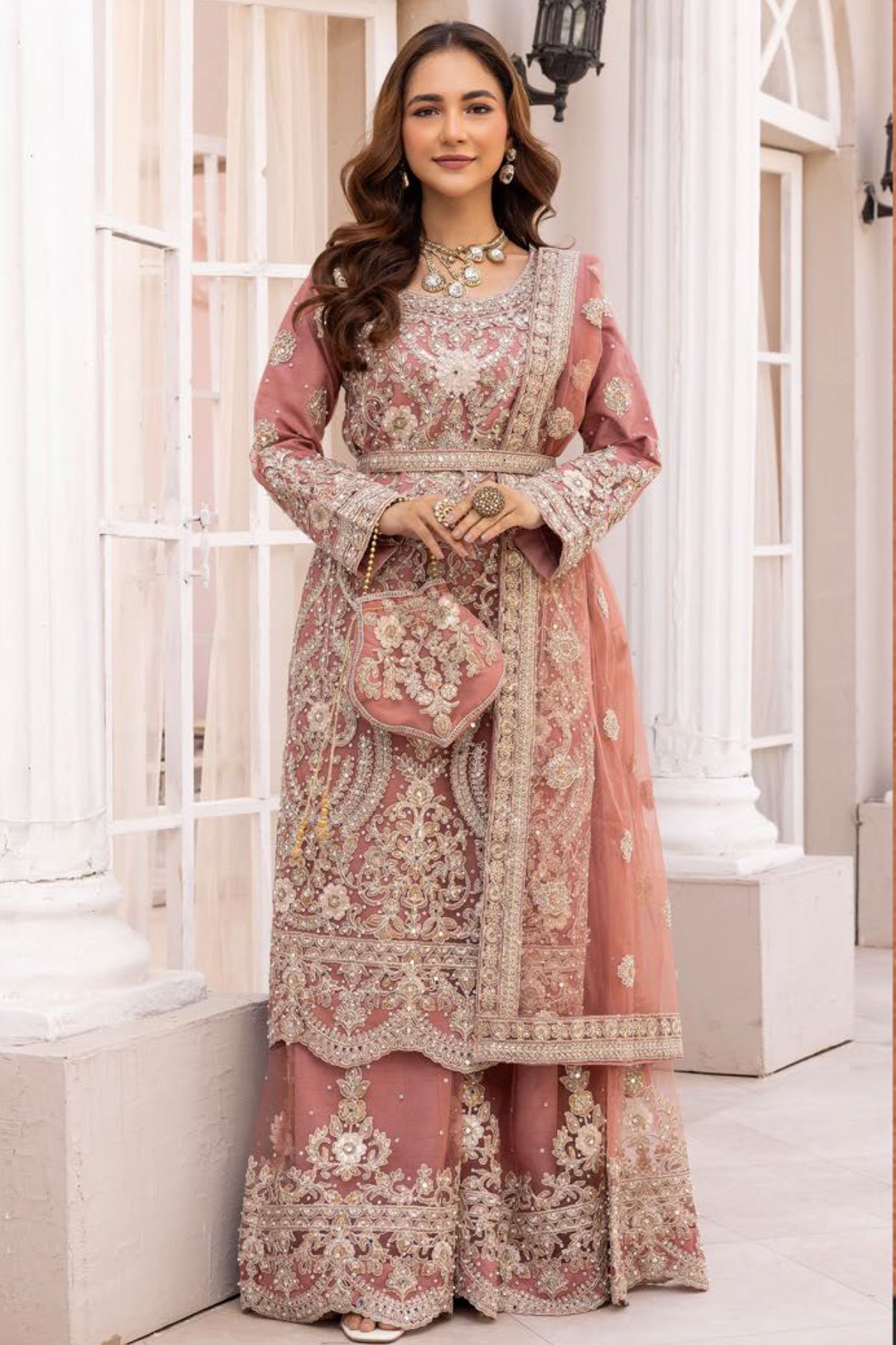 This beautiful 3 piece Shiffonz pari lux collection features a straight shirt with luxury dori work embroidery throughout with scattered diamantés, finished with full length embroidered sleeves. It comes with a luxury embroidered plazo and net embroidered dupatta. An embroidered belt is included to enhance the waist and a potli bag to complete the look.