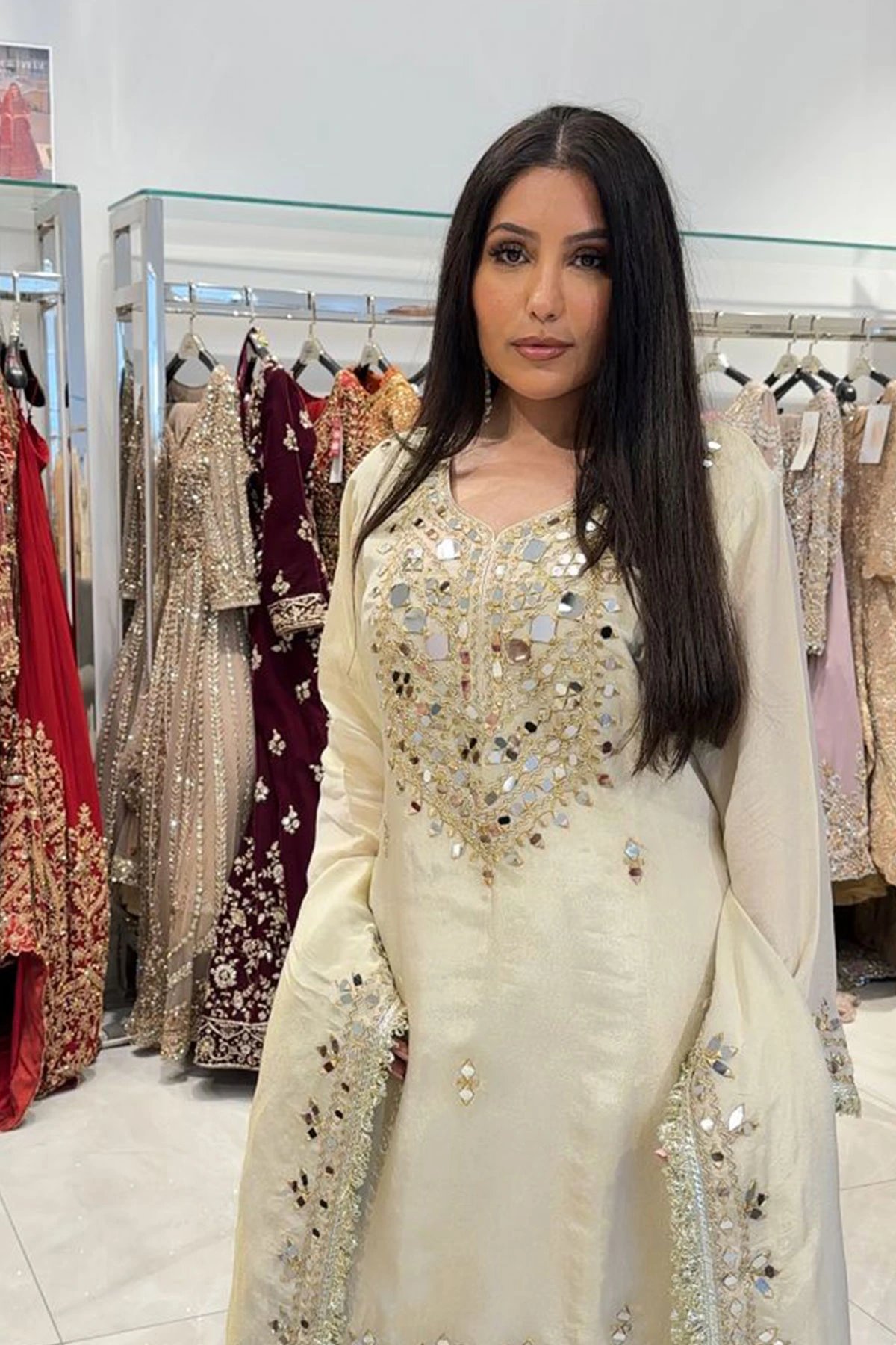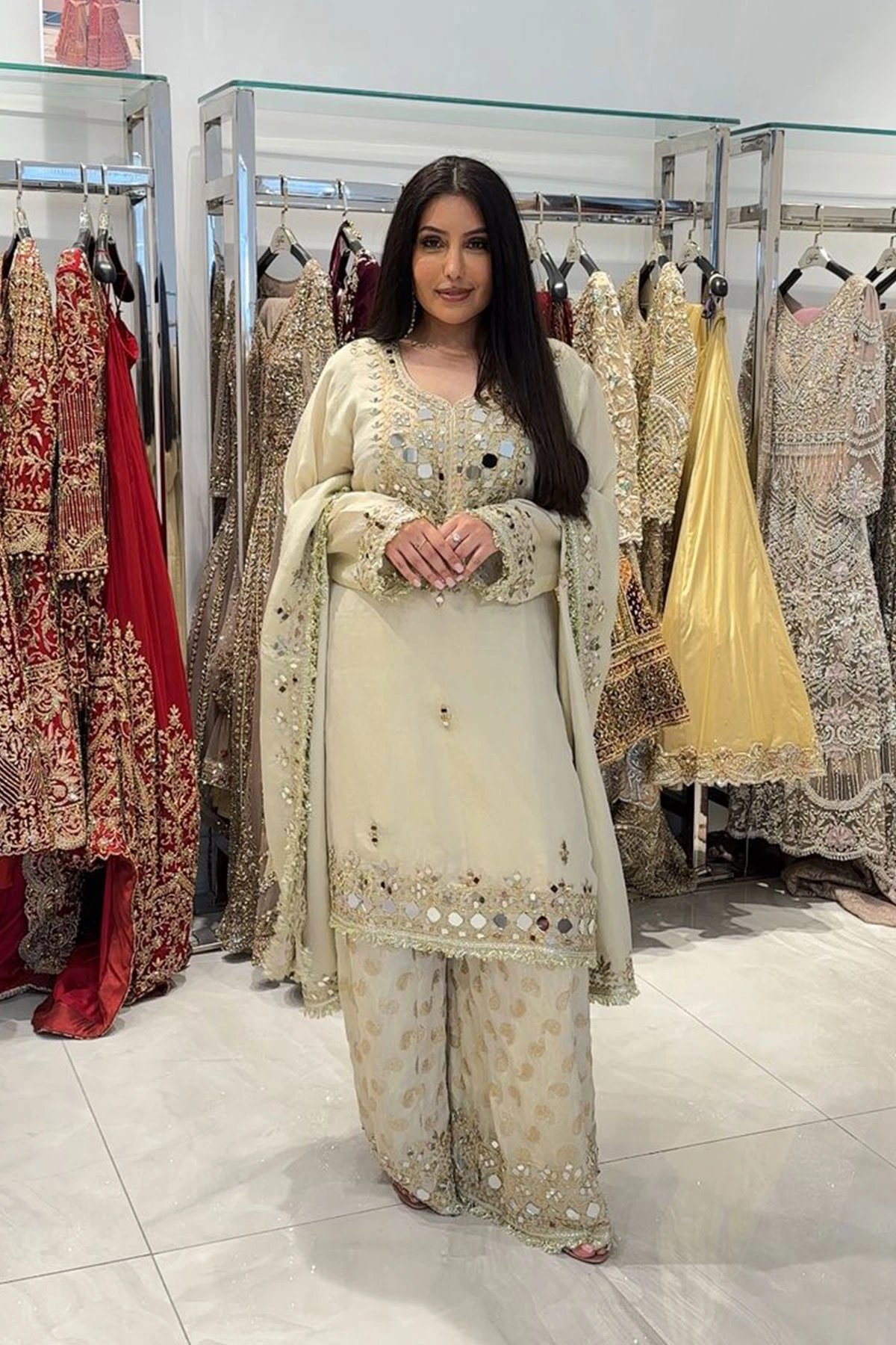 This beautiful 3 piece suit features a straight shirt with luxury thread work and mirror embellishment on the neckline and border, finished with full length embroidered sleeves. Paired with a shimmer printed plazo with mirror embellished border. The look is finished with an embroidered dupatta. Note: the banarsi print on the plazo may vary in all pieces.