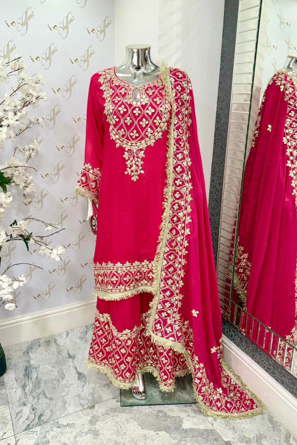 This beautiful 3 piece suit is crafted from luxurious pure chiffon fabric, adorned with intricate gotta work for an exquisite touch. It is paired with matching pure chiffon sharara with a gotta work embroidered border creating a sophisticated and effortlessly stylish look finished with an embroidered chiffon dupatta. Perfect for special occasions, this ensemble blends elegance with modern charm.