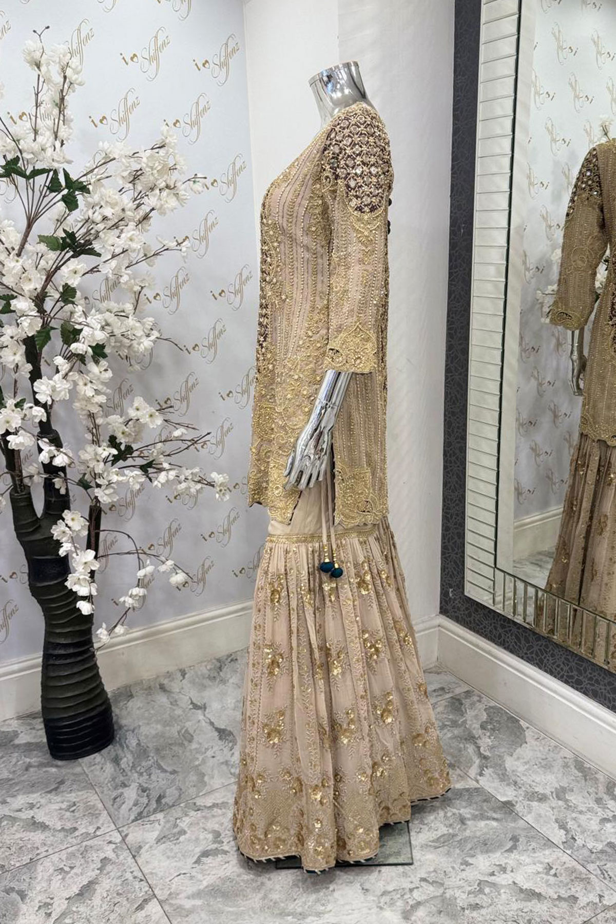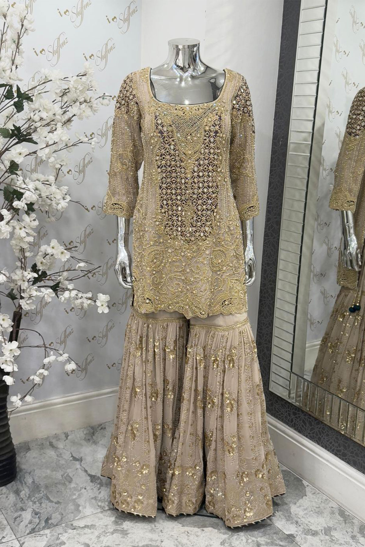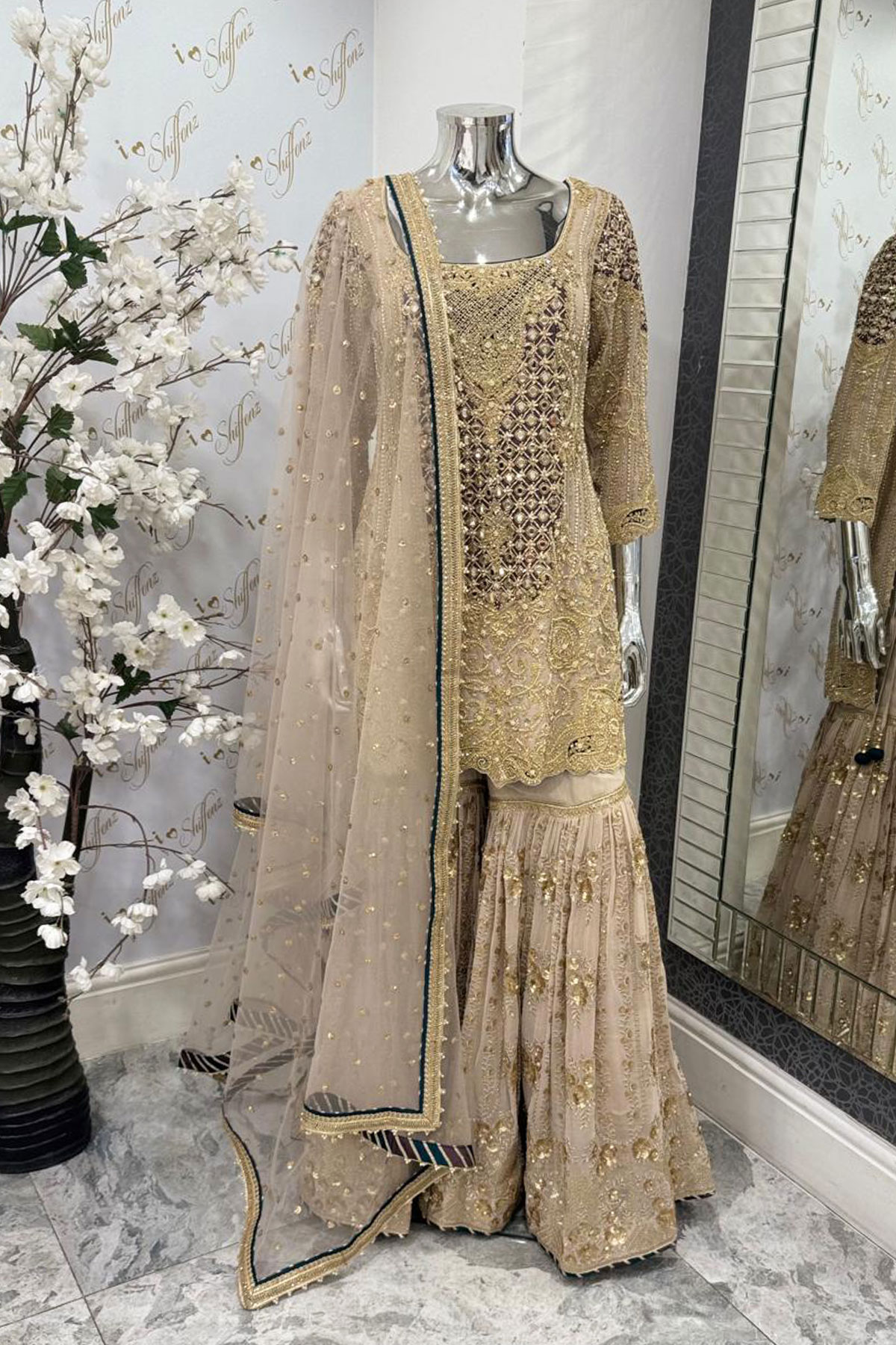 This beautiful 3 piece chiffon suit features a straight shirt with luxury thread work embroidery throughout with sequins, bead and mirror embellishments throughout, finished with full length embroidered sleeves. Paired with a luxury embroidered gharara and the look is finished with a chiffon embroidered dupatta.