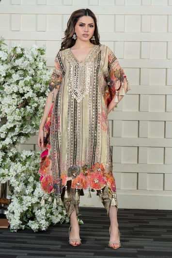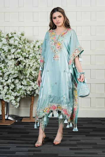 This beautiful 2-piece kaftan suit is crafted from luxurious shimmer fabric, adorned with intricate threadwork for an exquisite touch on the front with mirror embellishments. It is paired with matching shimmer gharara, creating a sophisticated and effortlessly stylish look, finished with a potli embroidered bag. Perfect for special occasions, this ensemble blends elegance with modern charm.