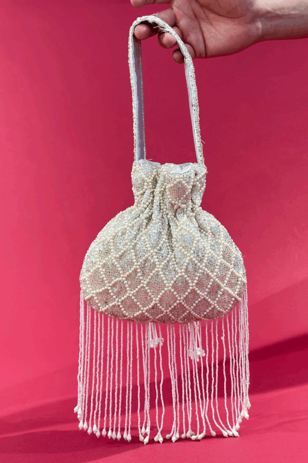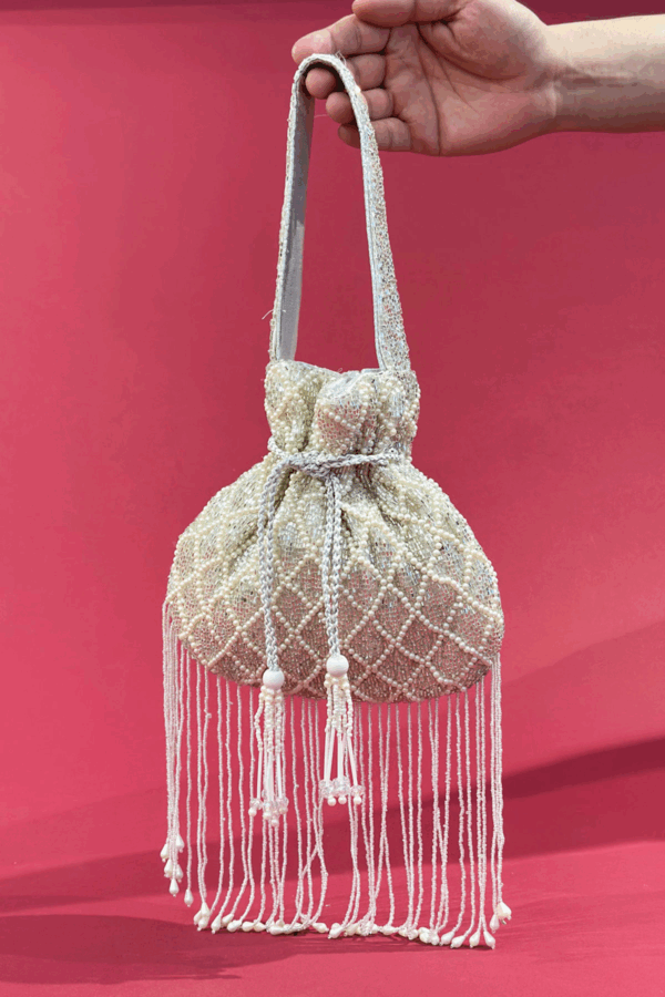 This luxurious bag is offered in the potli pattern and features an embroidered strap for convenient use. It is available in the perfect dimensions and is a beautiful illustration of high-level craftsmanship of pearl embellishments, finished on dangling tassels which makes it look much more appealing, this exquisite clutch will give you a standout look in casual and party wear attires.