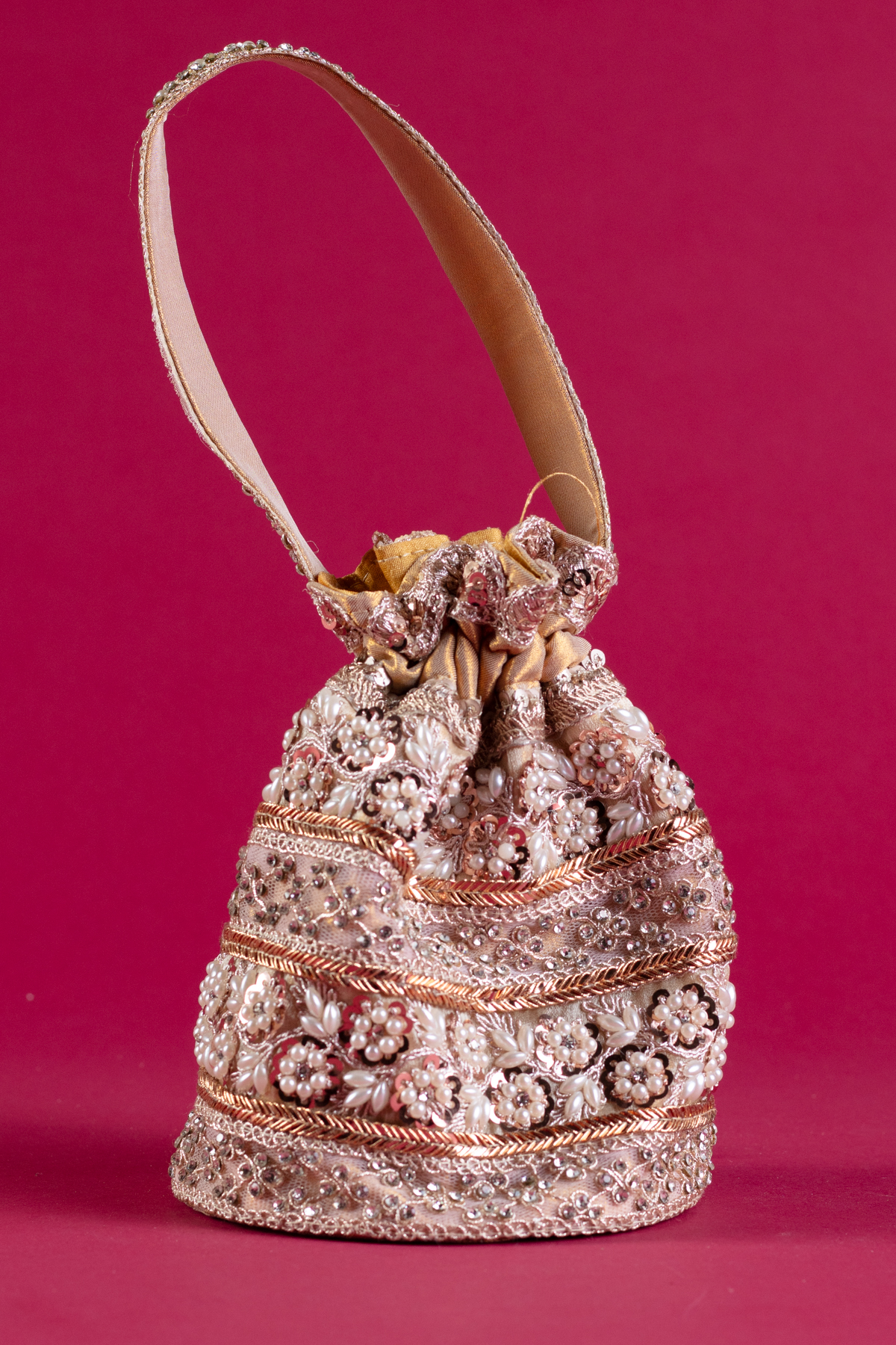 This beautiful handcrafted potli bag is made from premium crepe fabric, featuring intricate embellishments of pearls, crystals, and sequins. Designed with delicate embroidery and ornate detailing, it adds a touch of sophistication to any ensemble. The bag is secured with a drawstring closure, adorned with elegant tassels for a refined finish. Perfect for special occasions, it seamlessly blends tradition with luxury.