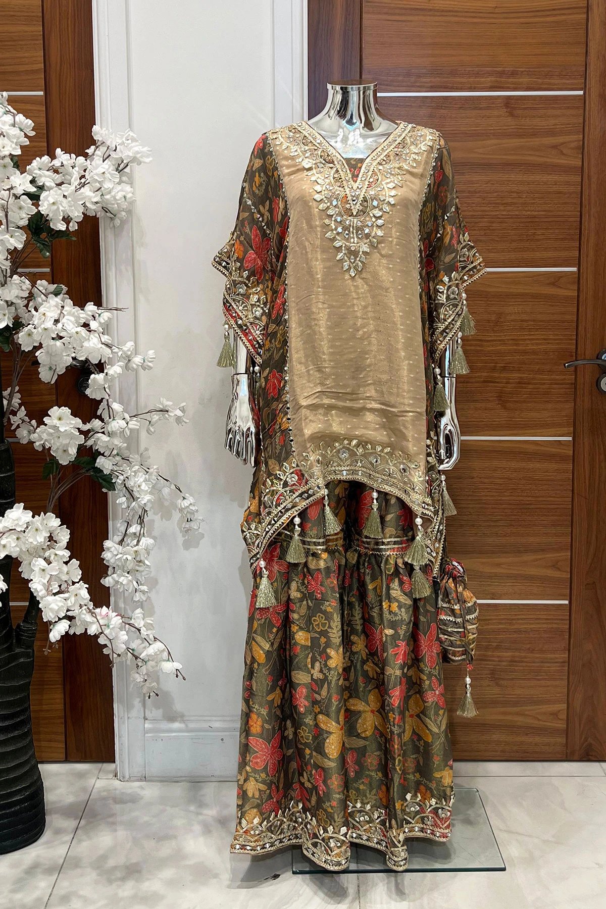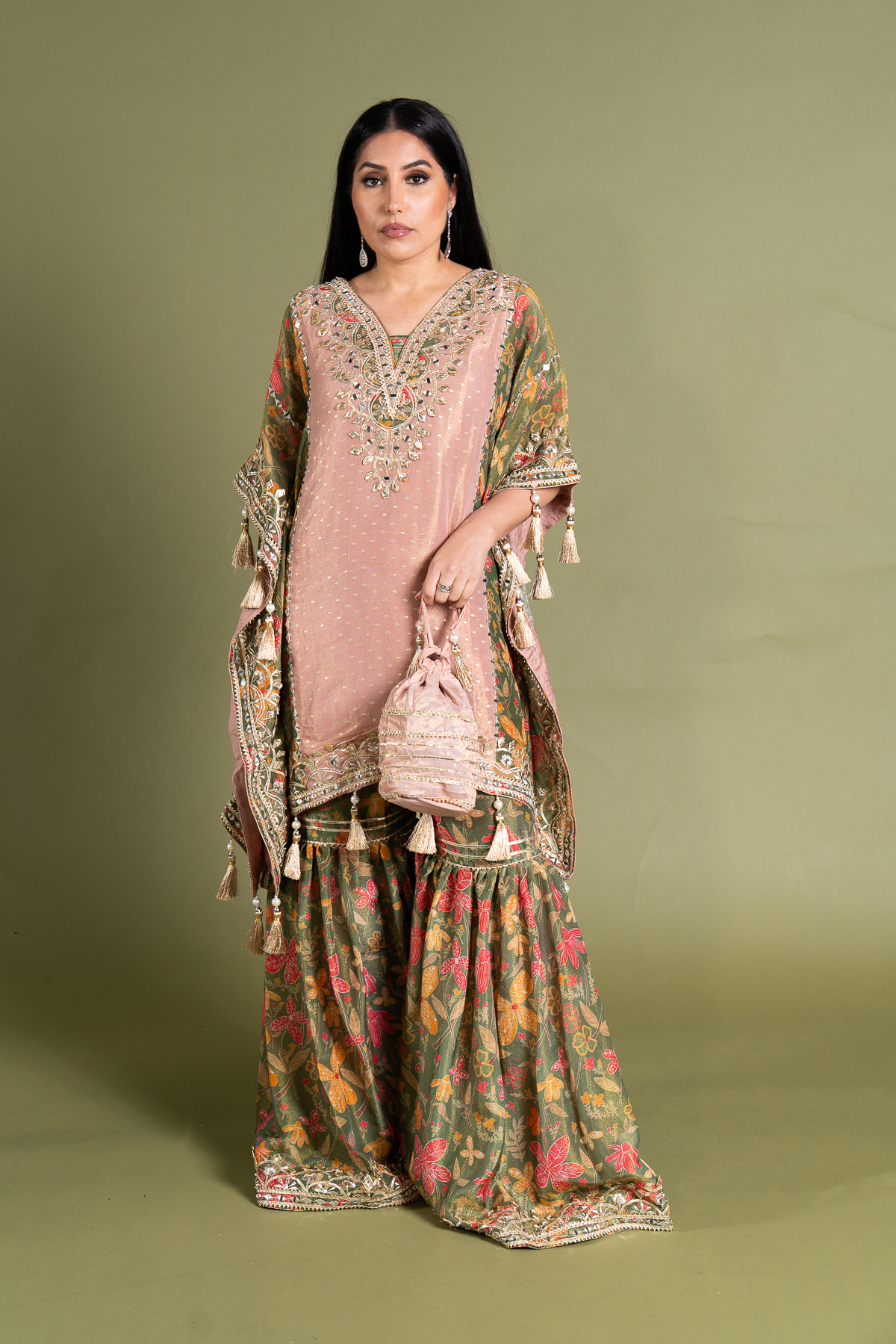 This beautiful 2-piece kaftan gharara suit is designed in luxurious pure shimmer fabric, adorned with intricate threadwork for a refined and elegant look. It is paired with a flowing chiffon gharara, adding a graceful and airy feel to the ensemble. This outfit also includes a matching bag, enhancing both style and convenience. Perfect for special occasions, this ensemble blends traditional elegance with contemporary charm. Note: The potli shown in the picture may vary in design and colour. Please refer to the last picture to the actual potli it comes with.