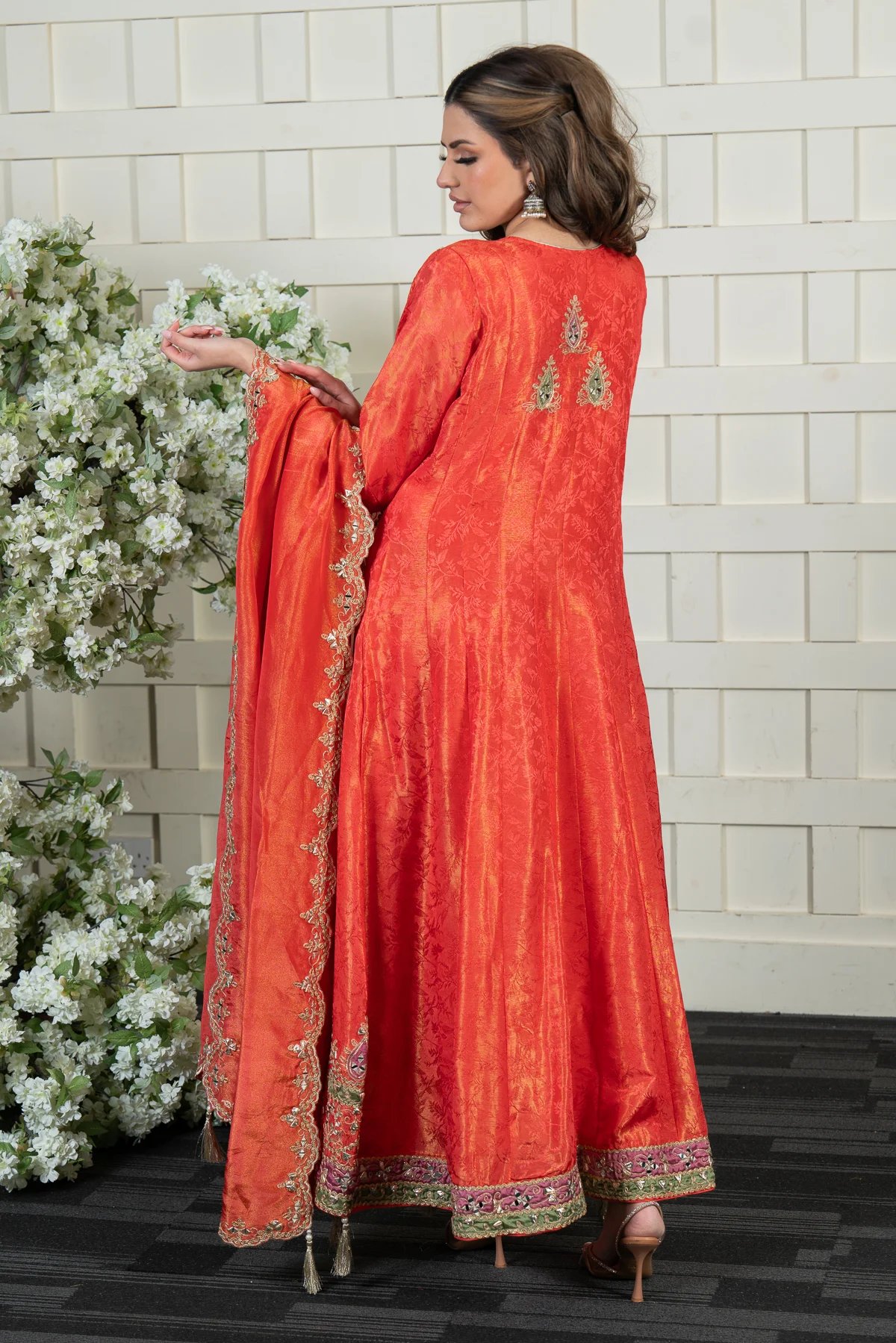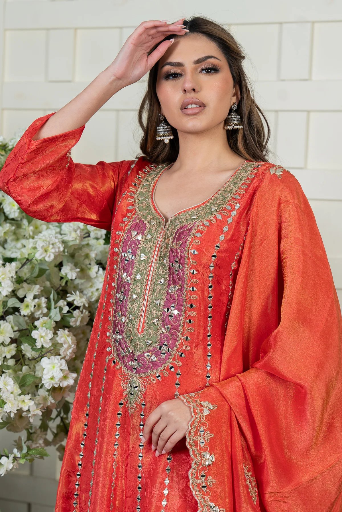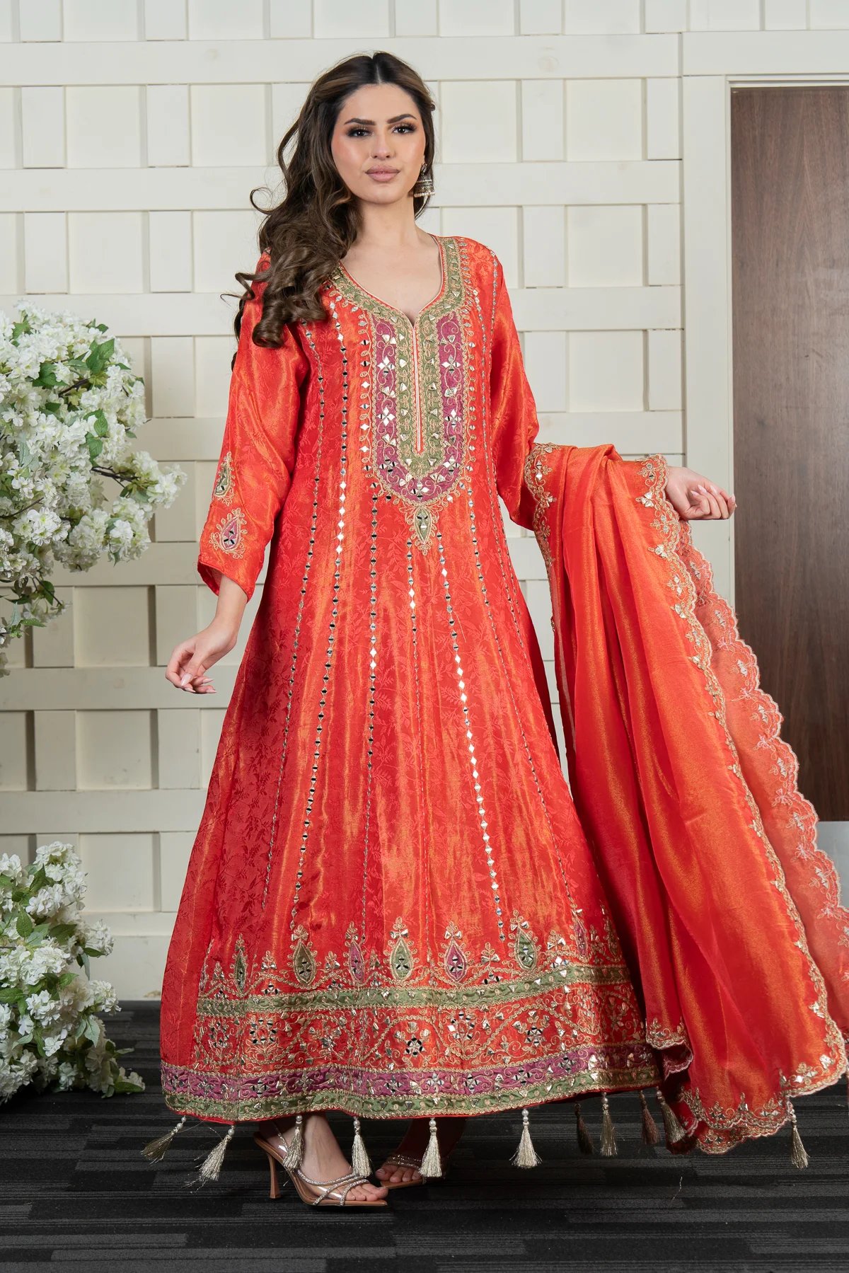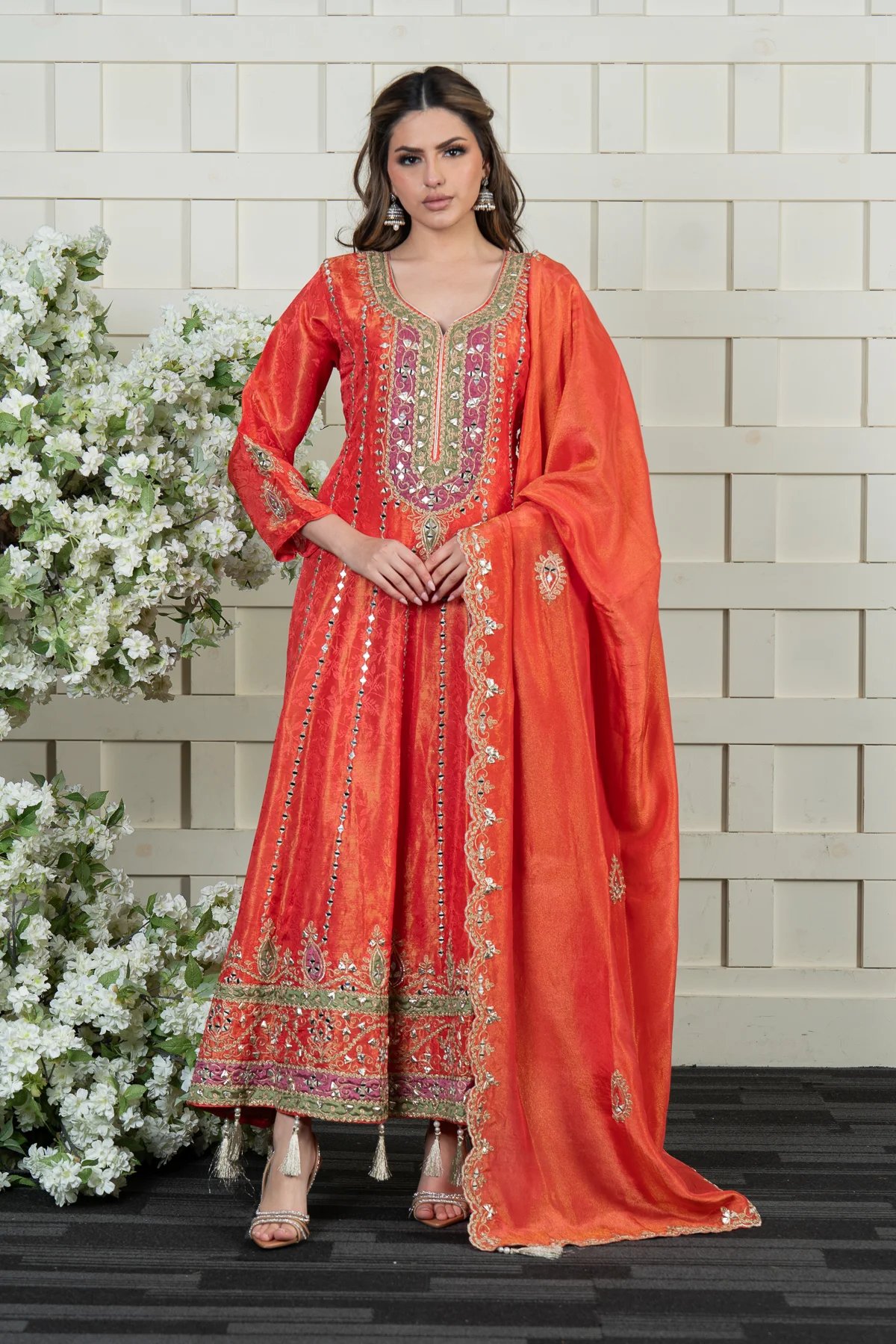 This beautiful 2-piece anarkali suit is crafted from luxurious masoori fabric, adorned with intricate embroidery and shimmering sequin work for an elegant finish. It is paired with a matching masoori dupatta, featuring delicate embroidered borders that add a refined touch. Perfect for any special occasion, this ensemble exudes timeless grace and sophistication.