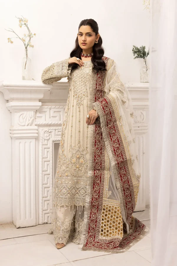 This beautiful 3-piece sharara suit features a net shirt adorned with intricate all-over beadwork, creating a refined and graceful look. The net sharara is designed with delicate threadwork on the top, adding a touch of sophistication. Completing the ensemble is a net dupatta, finished with a heavy border and exquisite threadwork for an elegant appeal. Please note: Images used are for reference only. The actual product may differ slightly in colour and design.