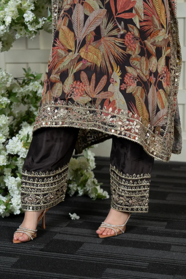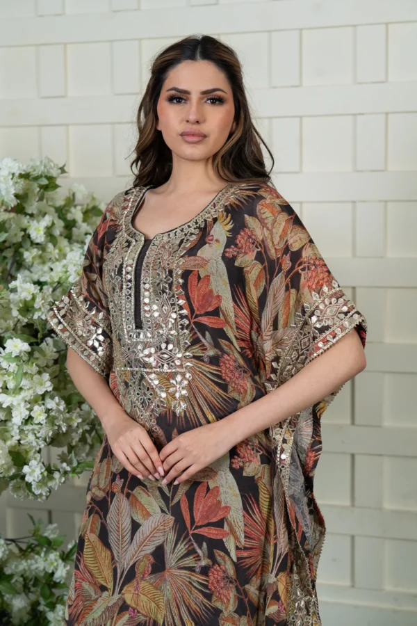 This beautiful 2-piece kaftan style outfit is designed for effortless elegance. The chiffon top features a stunning printed design, enhanced with delicate pressed lace work for a refined touch. Paired with raw silk trousers adorned with intricate border detailing, this ensemble offers both style and sophistication. Perfect for festive occasions and special gatherings.