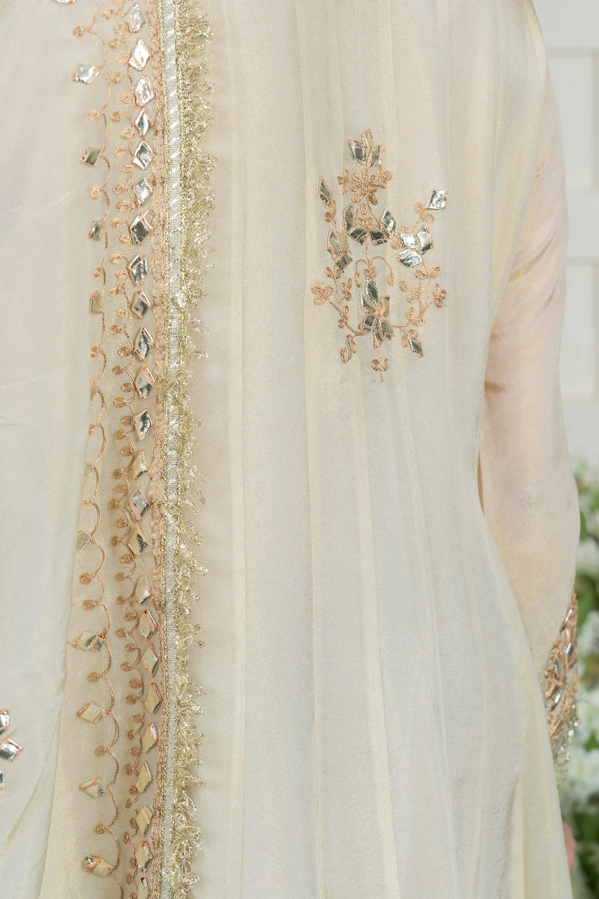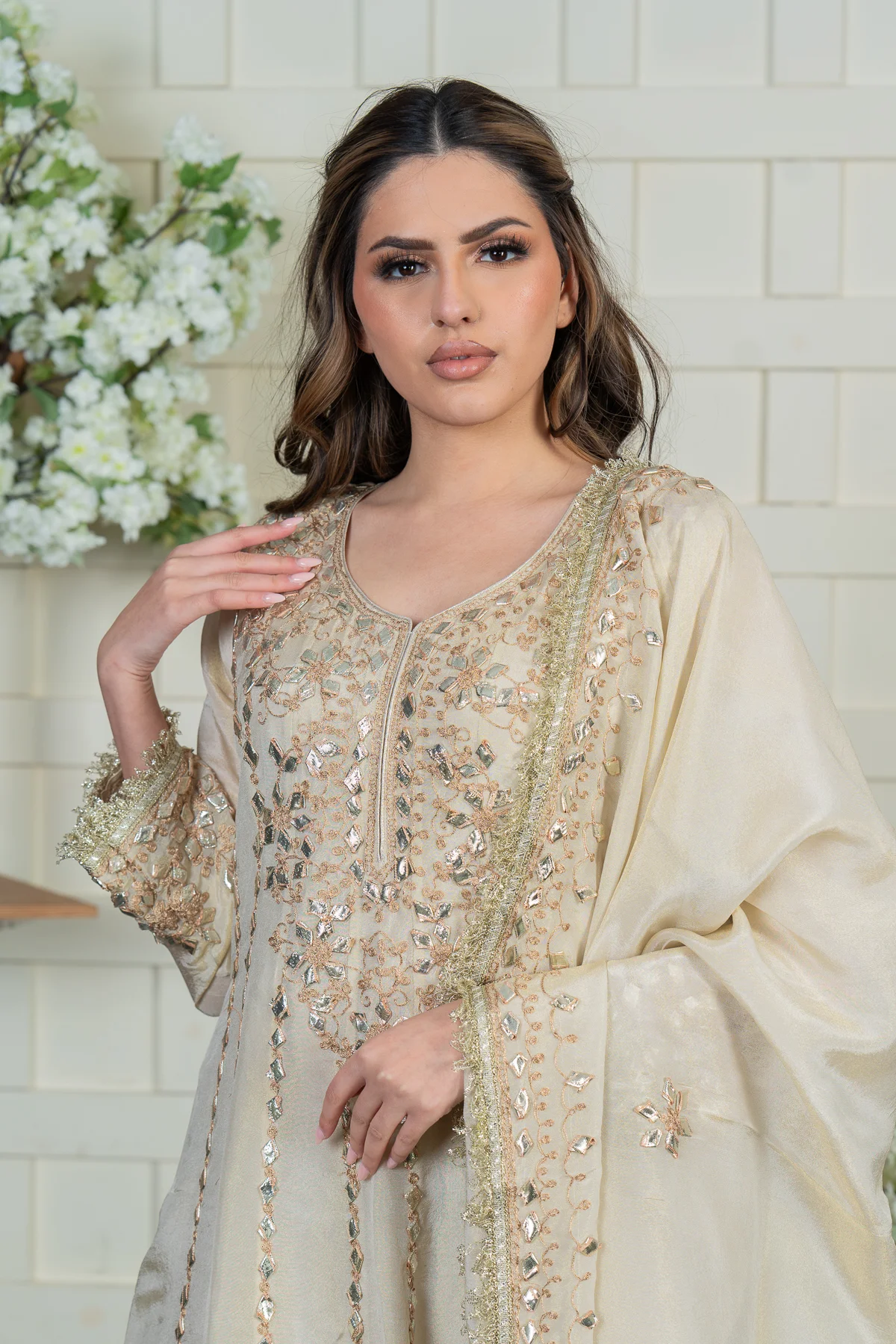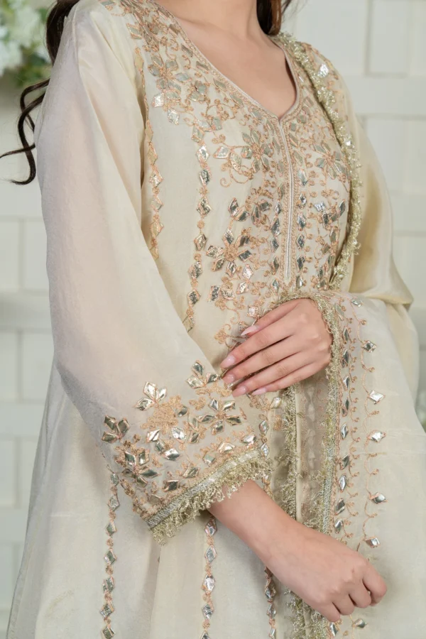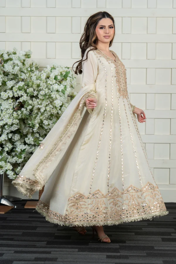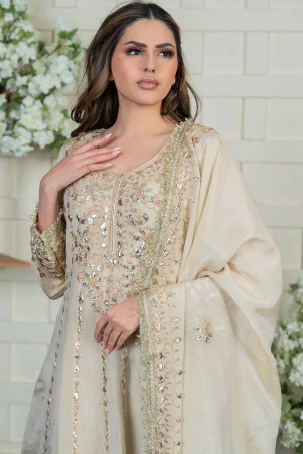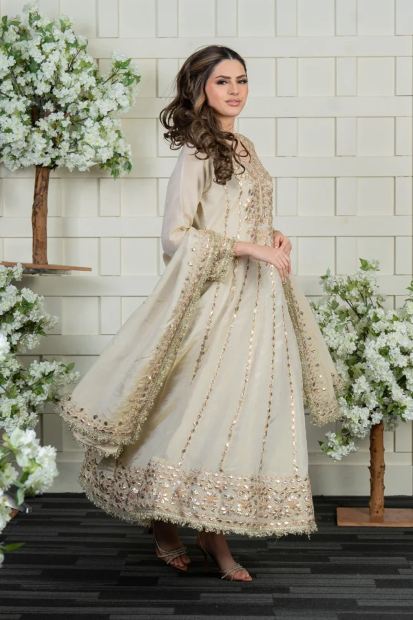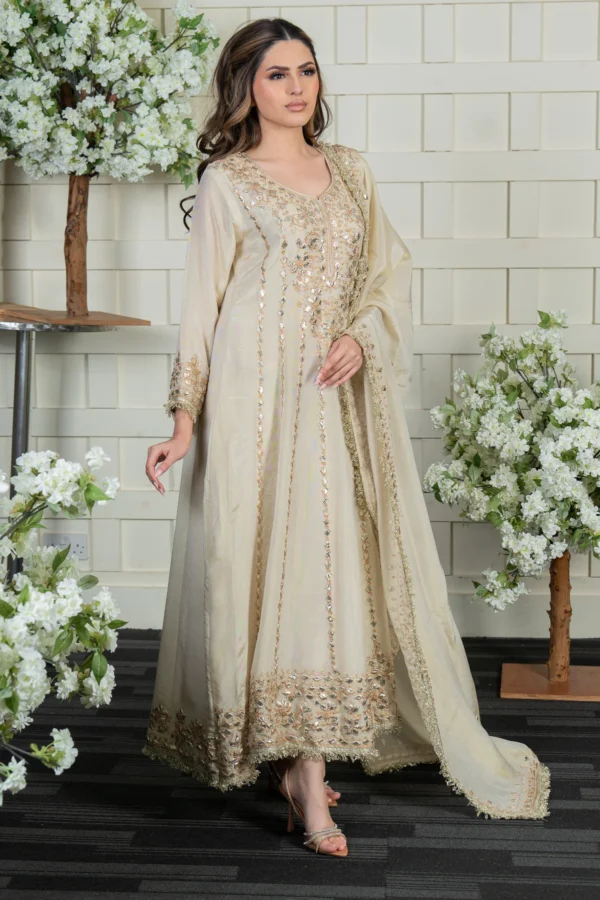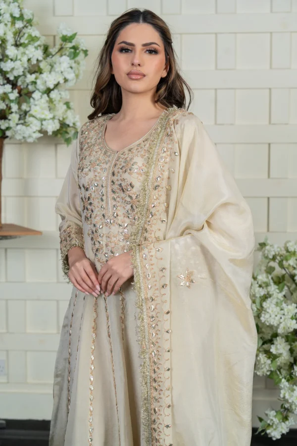 This beautiful gown is crafted from premium masori fabric, featuring pressed lace work and intricate threadwork embellishments on the top for a regal finish. The matching masori dupatta is adorned with delicate detailing, enhancing the overall elegance of the ensemble. A perfect choice for special occasions, this outfit blends luxury with timeless charm. Please note: Trousers aren’t included.