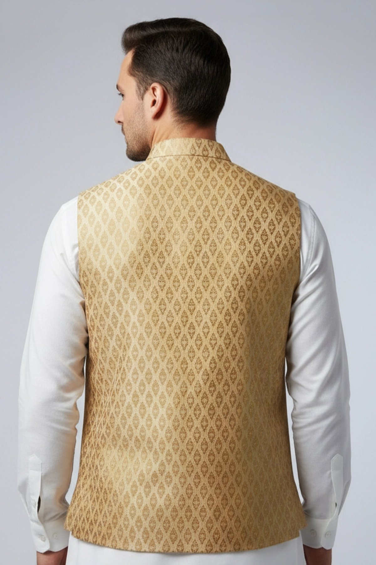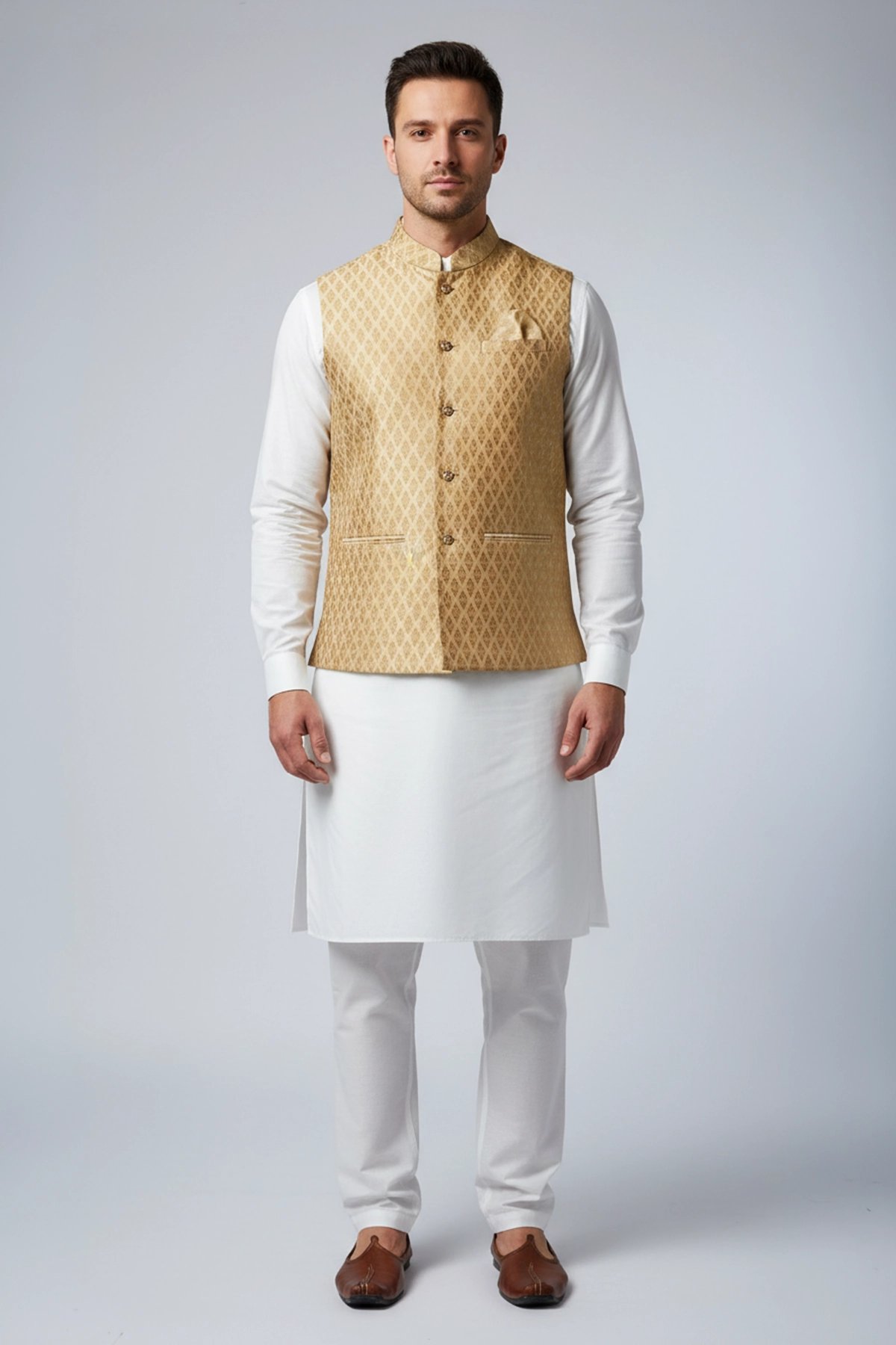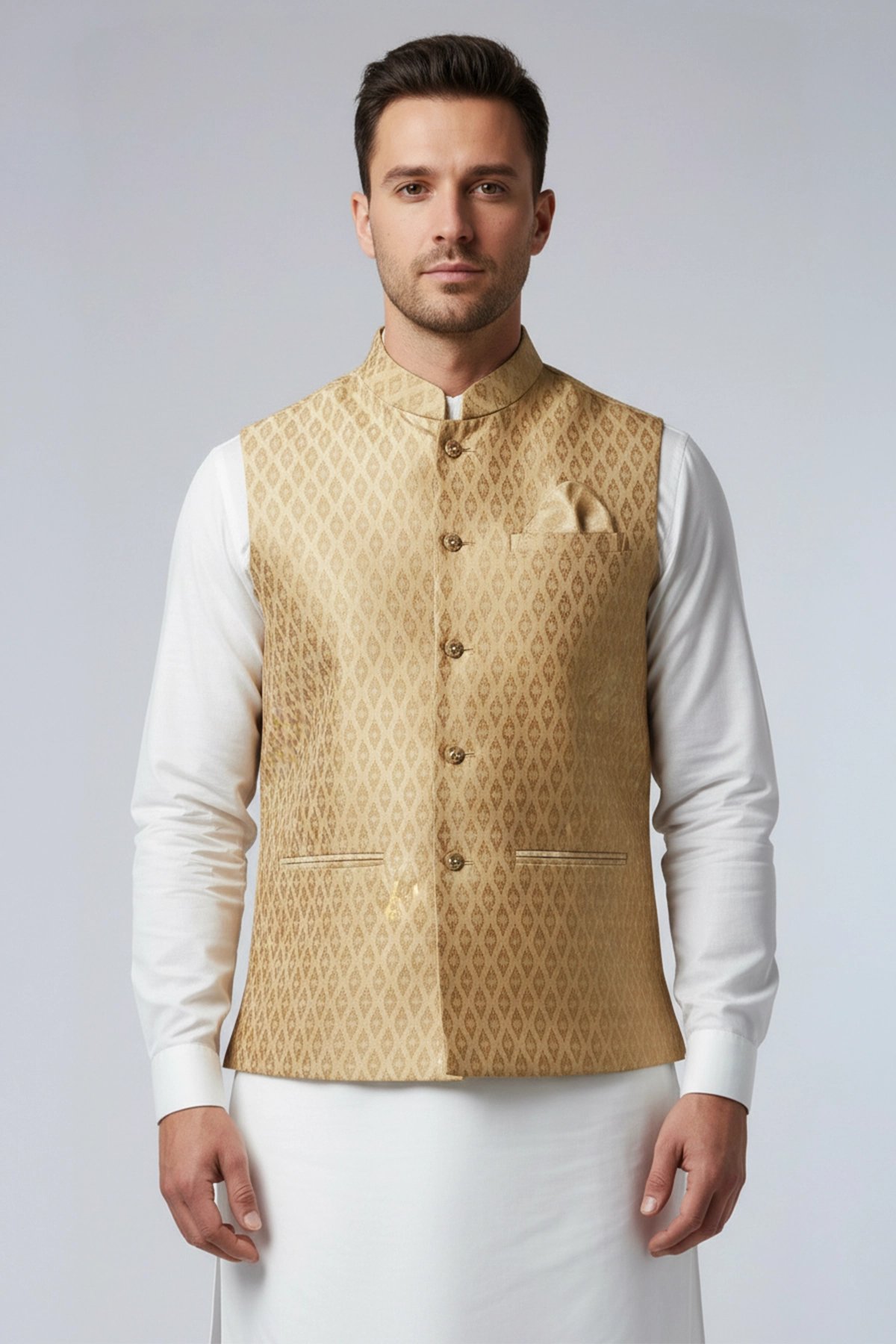 This elegant waistcoat is crafted from premium brocade fabric, featuring a refined diamond‑patterned weave that adds depth and richness to the design. It is finished with moulded buttons and a classic mandarin collar, complemented by a straight cut that sits comfortably across the chest before tapering slightly at the waist to create a broad‑shoulder, slim‑waist silhouette. Perfect for formal occasions or for layering over simple traditional attire, this waistcoat delivers a sophisticated and timeless look. Note: Kurta pyjama shown in the picture is not included. This image is used for reference, slight design variants may occur.