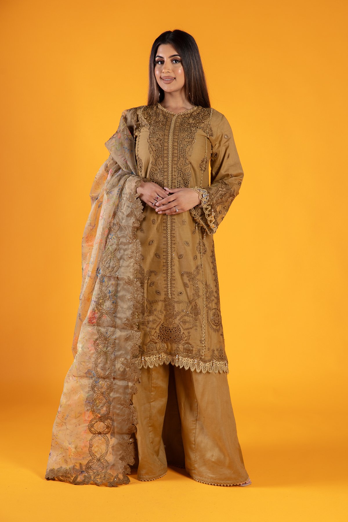 This beautiful 3 piece Qalamkaar inspired suit features a straight chikan kari embroidered shirt with lace embellishment on the border, finished with full length sleeves. It comes with wide leg plazo trousers and the look is finished with digital printed organza dupatta.