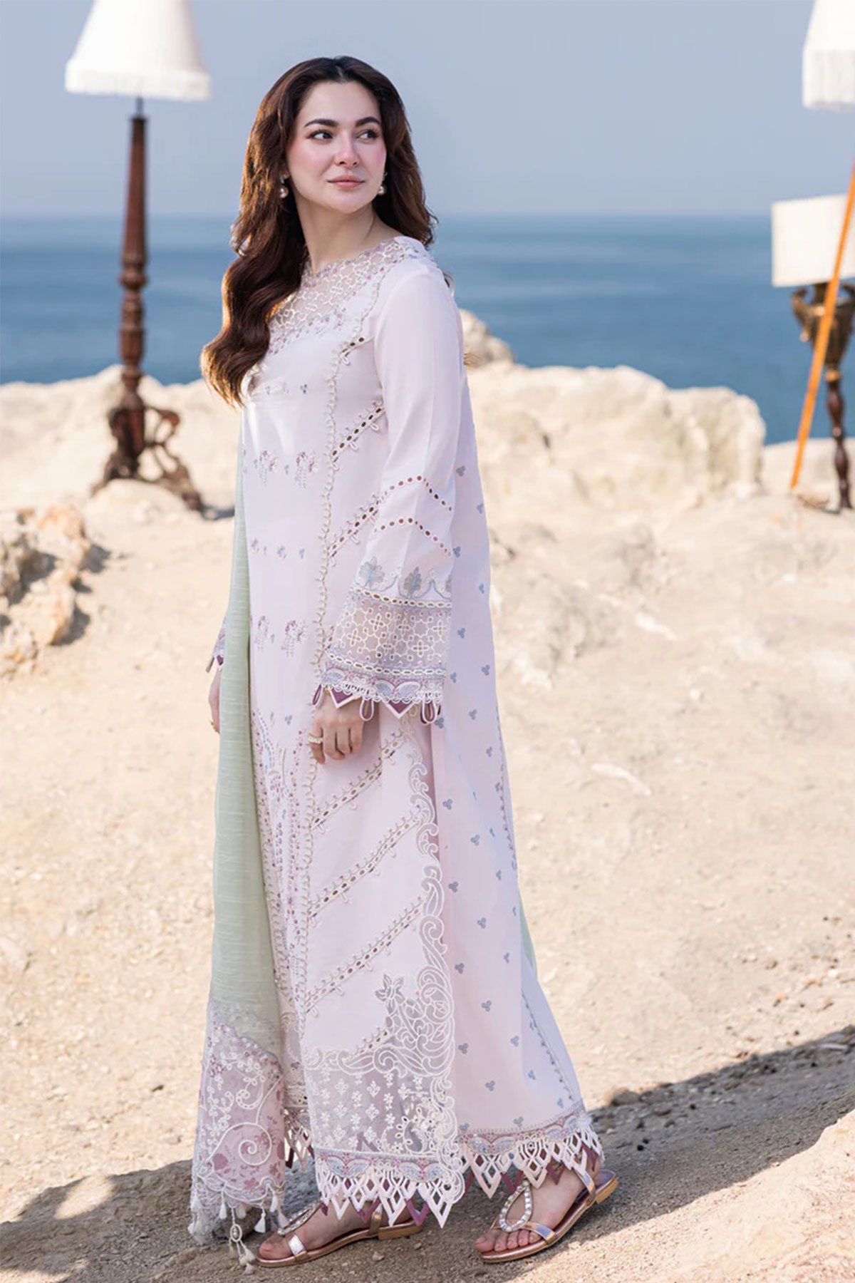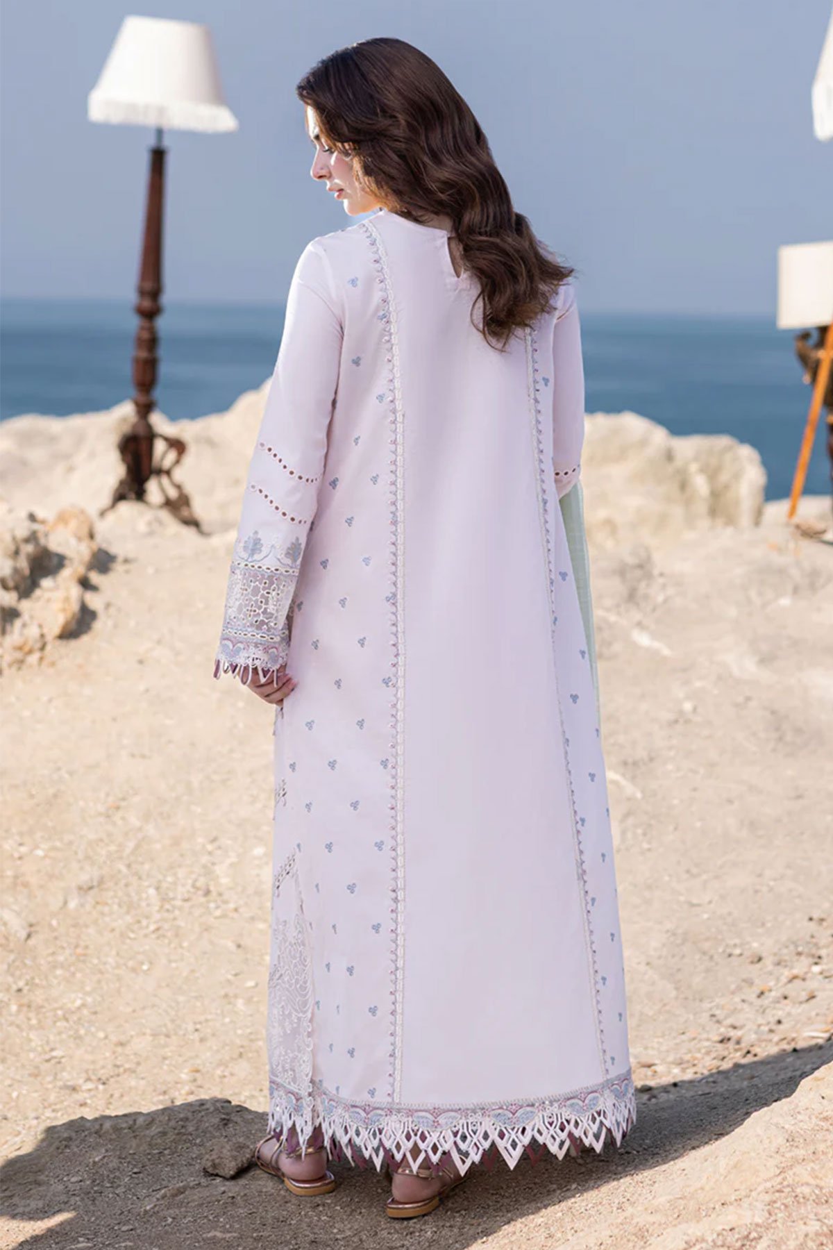 This beautiful 3 piece Qalamkar inspired suit features a straight chikankari embroidered shirt with full length embroidered sleeves. It comes with straight leg trousers and the look is finished with a contrasted embroidered organza dupatta.