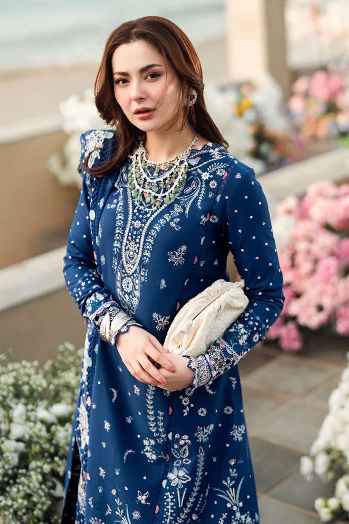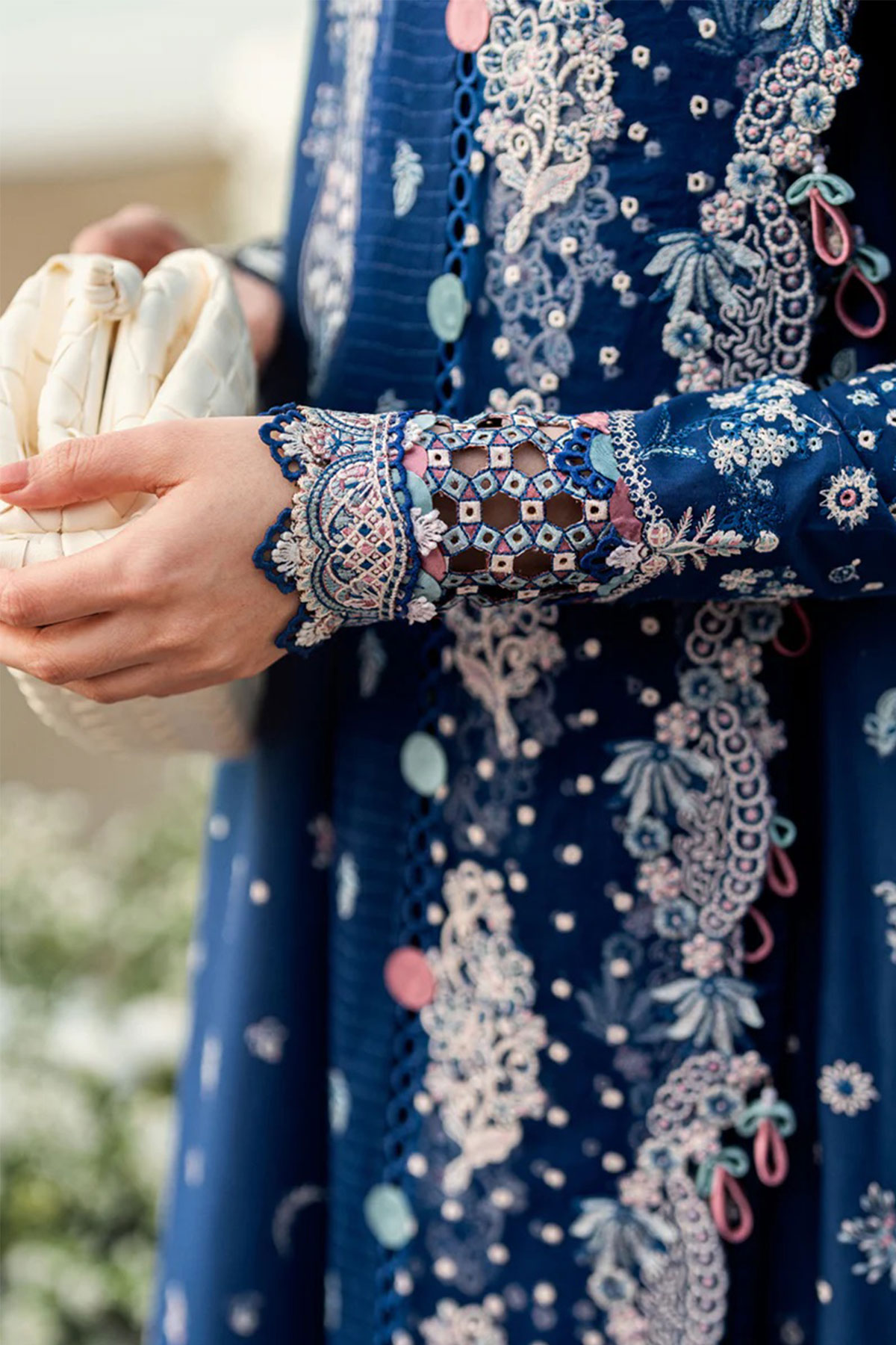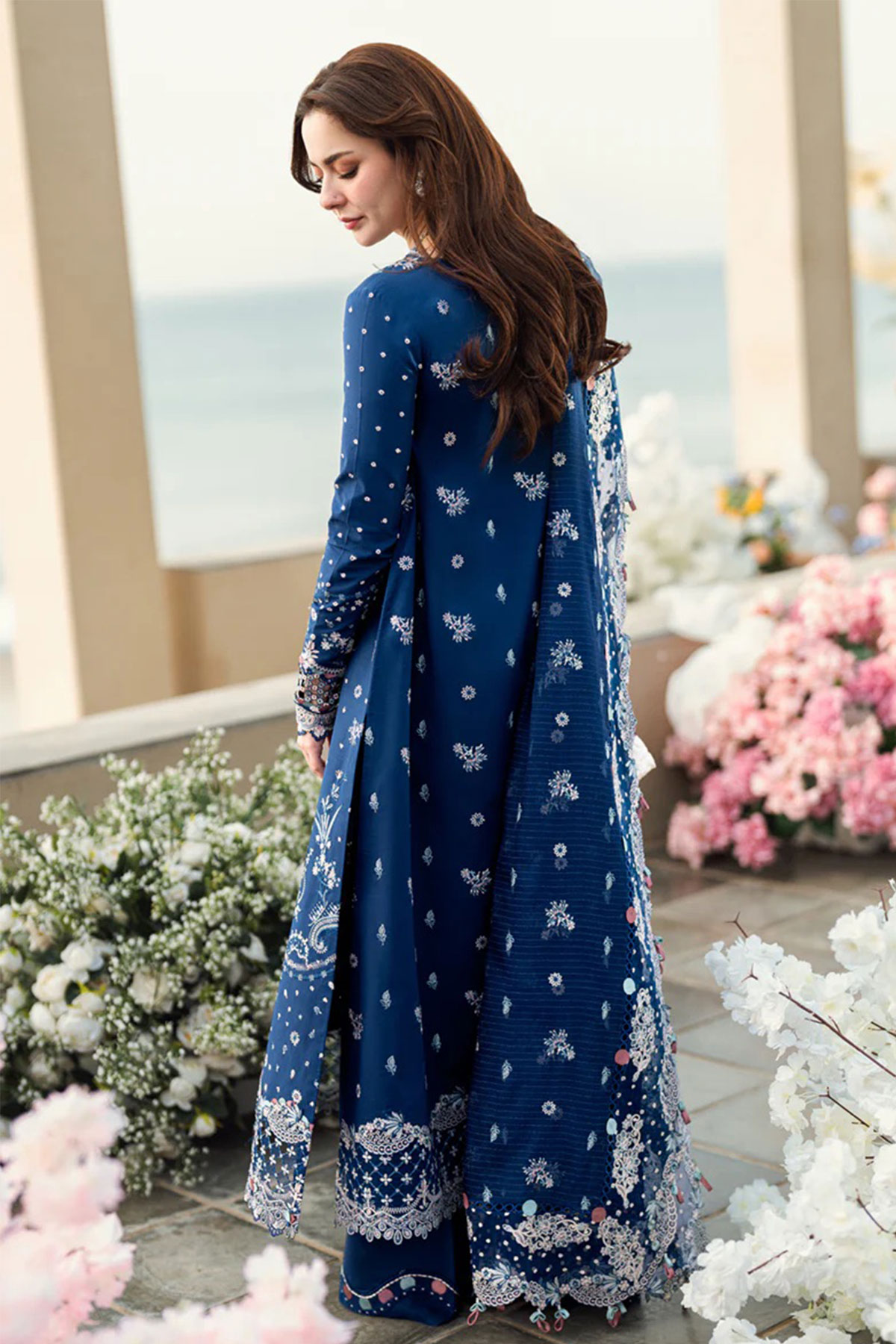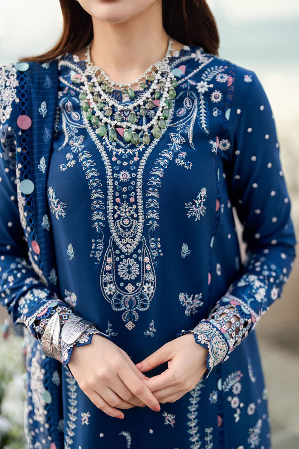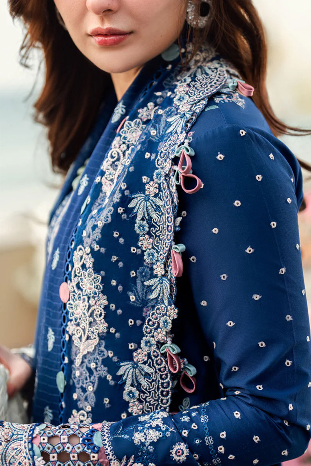 This beautiful 3 piece Qalamkar inspired collection features a straight shirt with luxury chikan kari embroidery throughout with full length embroidered sleeves. Paired with straight leg lawn trousers and the look is finished with a jacquard weaved embroidered dupatta. Perfect embroidered collection for this Eid. Note: Above catalogue pictures are for design reference only, embroidery and embellishments will vary.