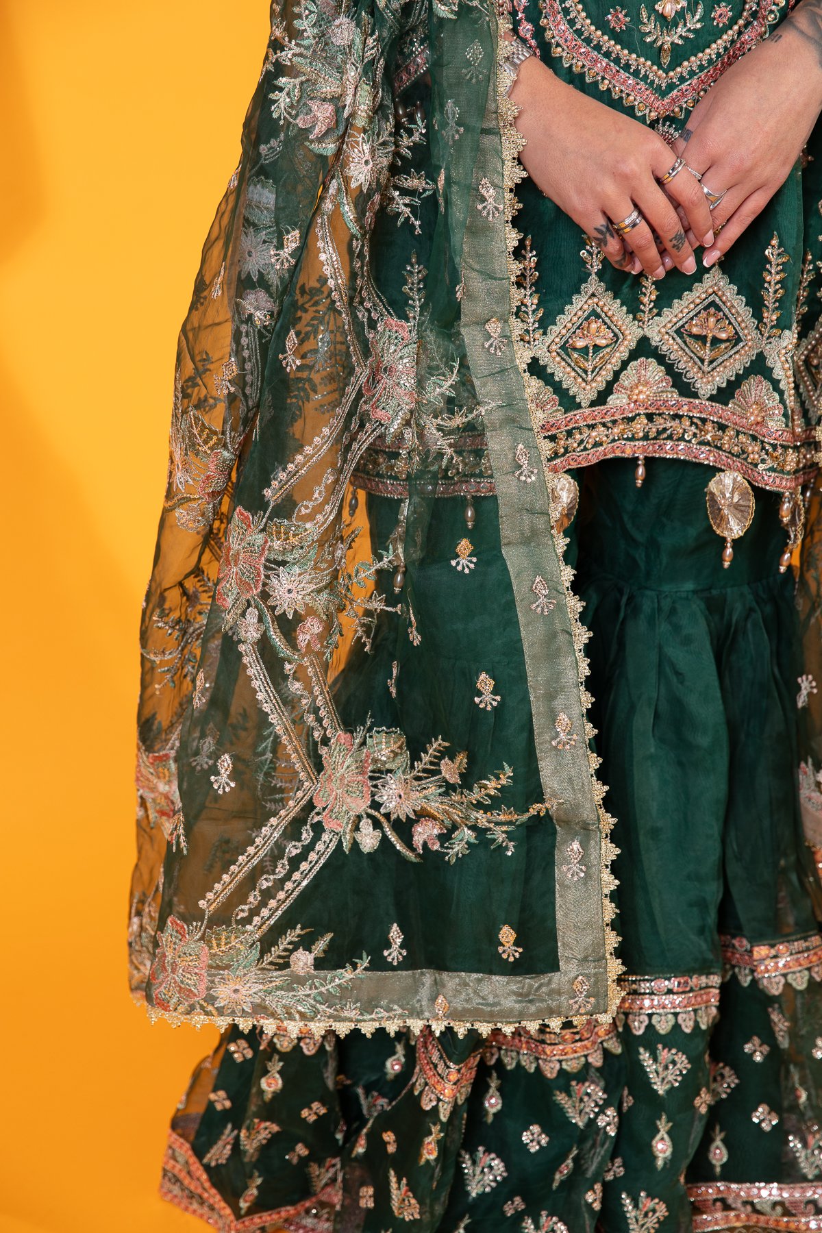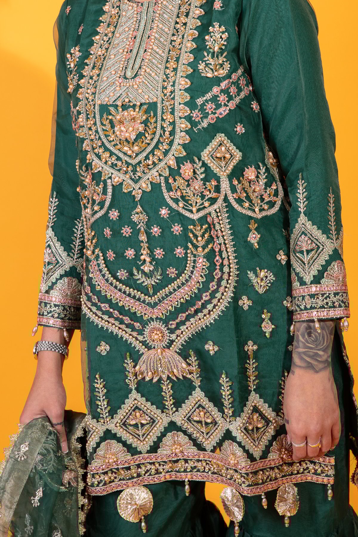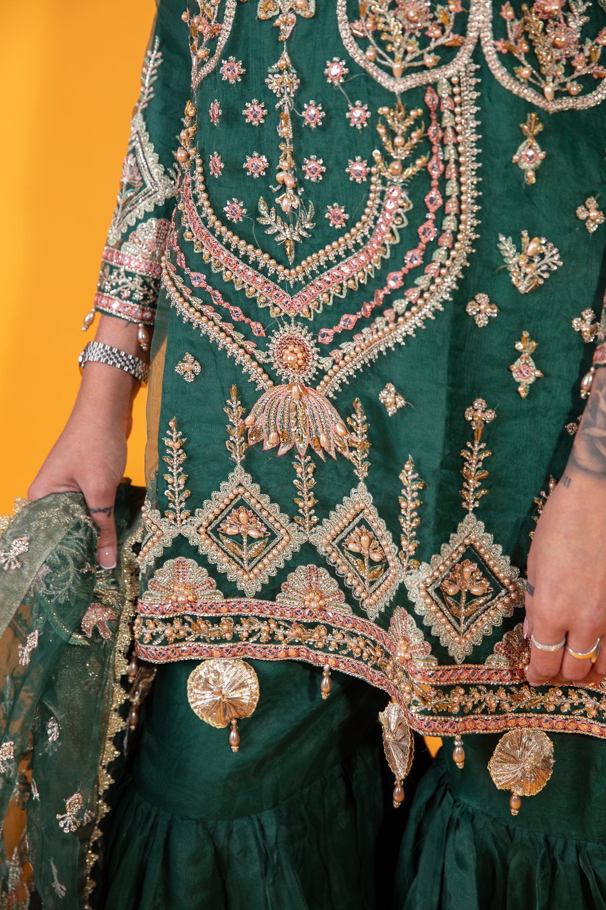 This beautiful 3 piece Qalamkar suit features a straight shirt with luxury thread work embroidery throughout finished with bauble tassels on the border. It comes with full length sleeves with embroidered cuffs along with dangling beads. The look is finished with an embroidered organza gharara and dupatta.