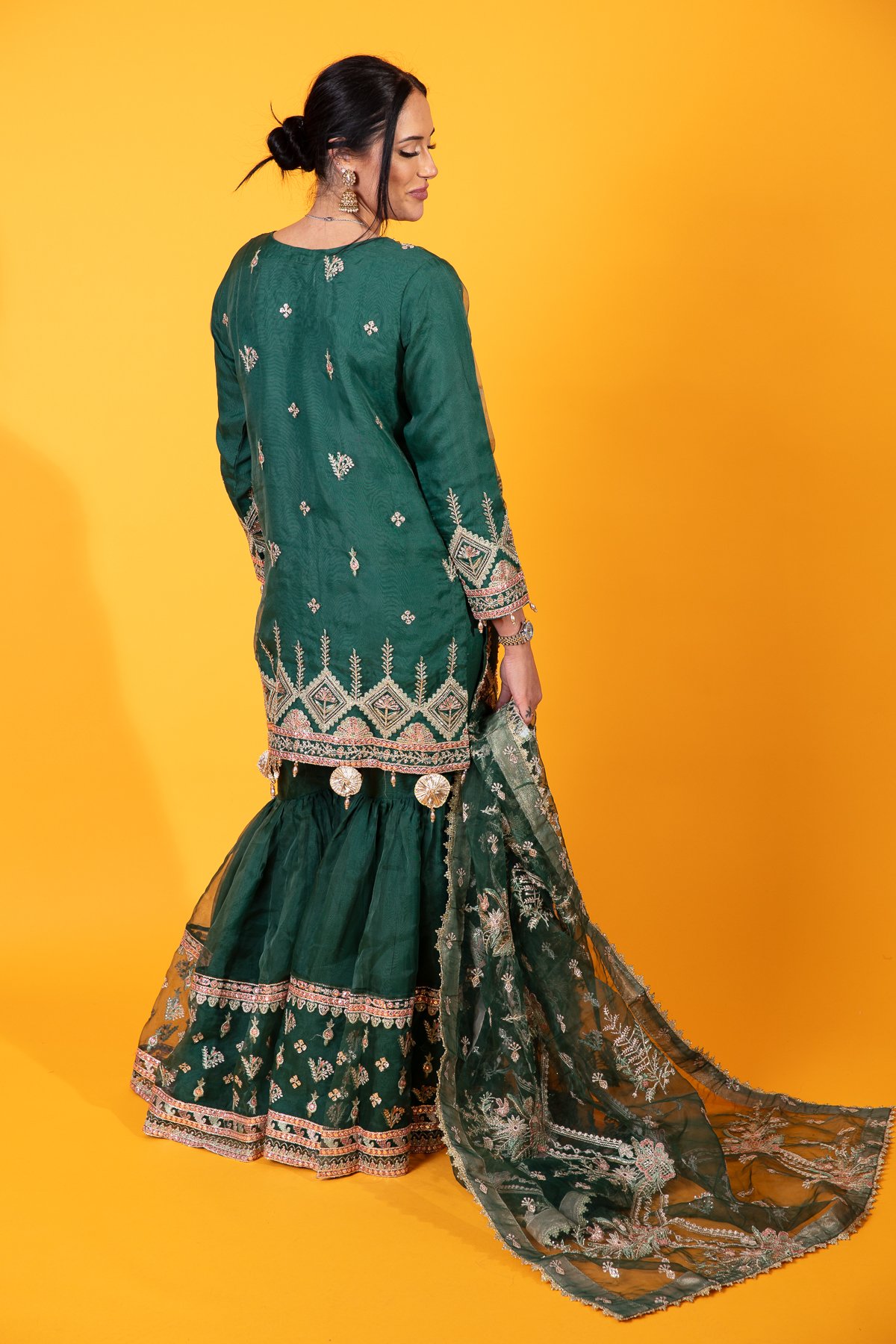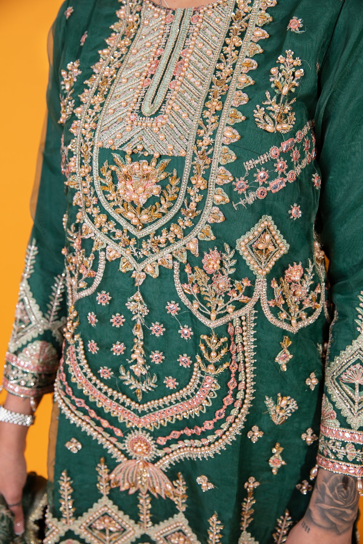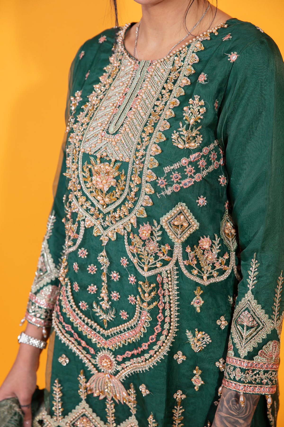 This beautiful 3 piece Qalamkar suit features a straight shirt with luxury thread work embroidery throughout finished with bauble tassels on the border. It comes with full length sleeves with embroidered cuffs along with dangling beads. The look is finished with an embroidered organza gharara and dupatta.
