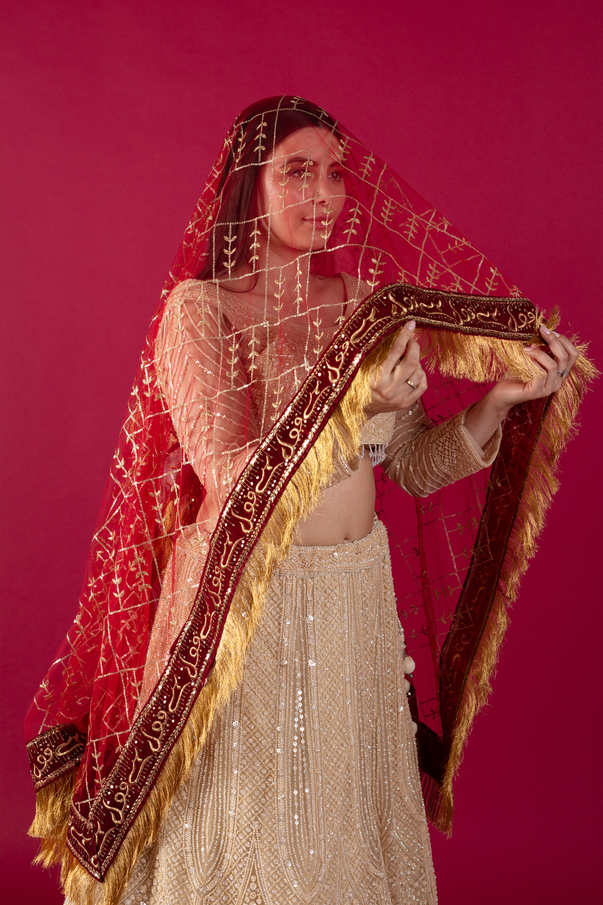 Add a touch of elegance to your bridal attire with this exquisite piece crafted from lightweight, net material that offers a delicate drape with embroidered qubool hai written on the borders. They elevate any bridal outfit for nikkah.