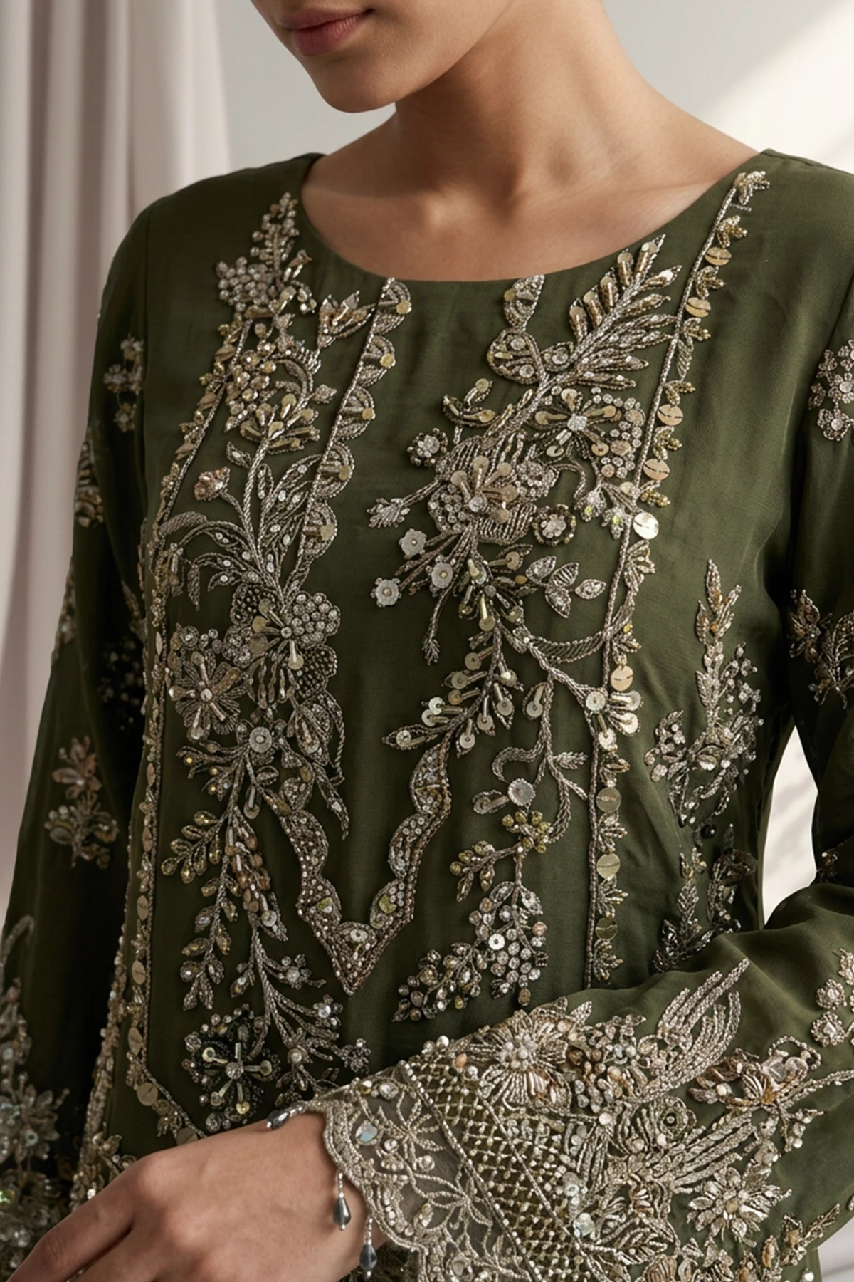 Full‑Length Embroidered Sleeves Elegant full sleeves with intricate embroidery, adding a polished and timeless finish.