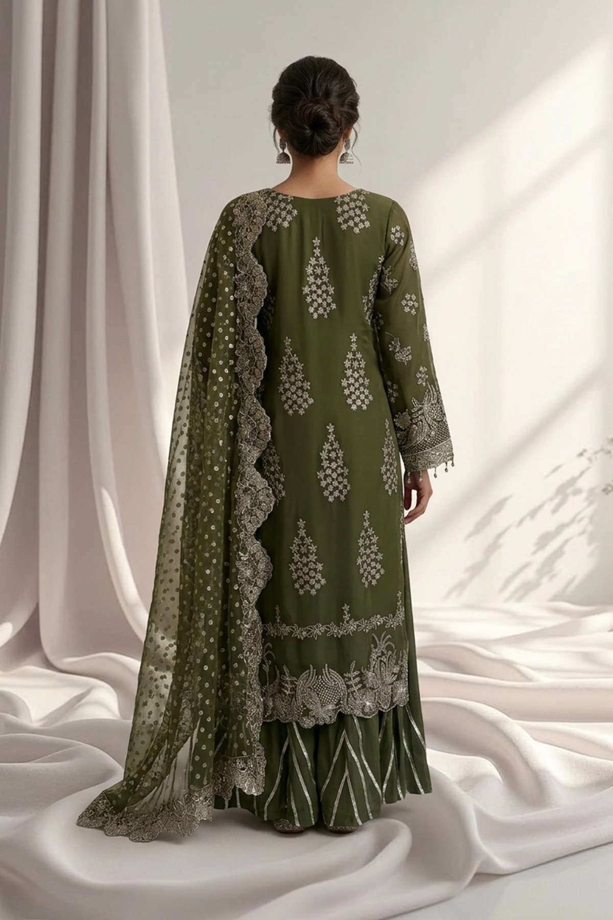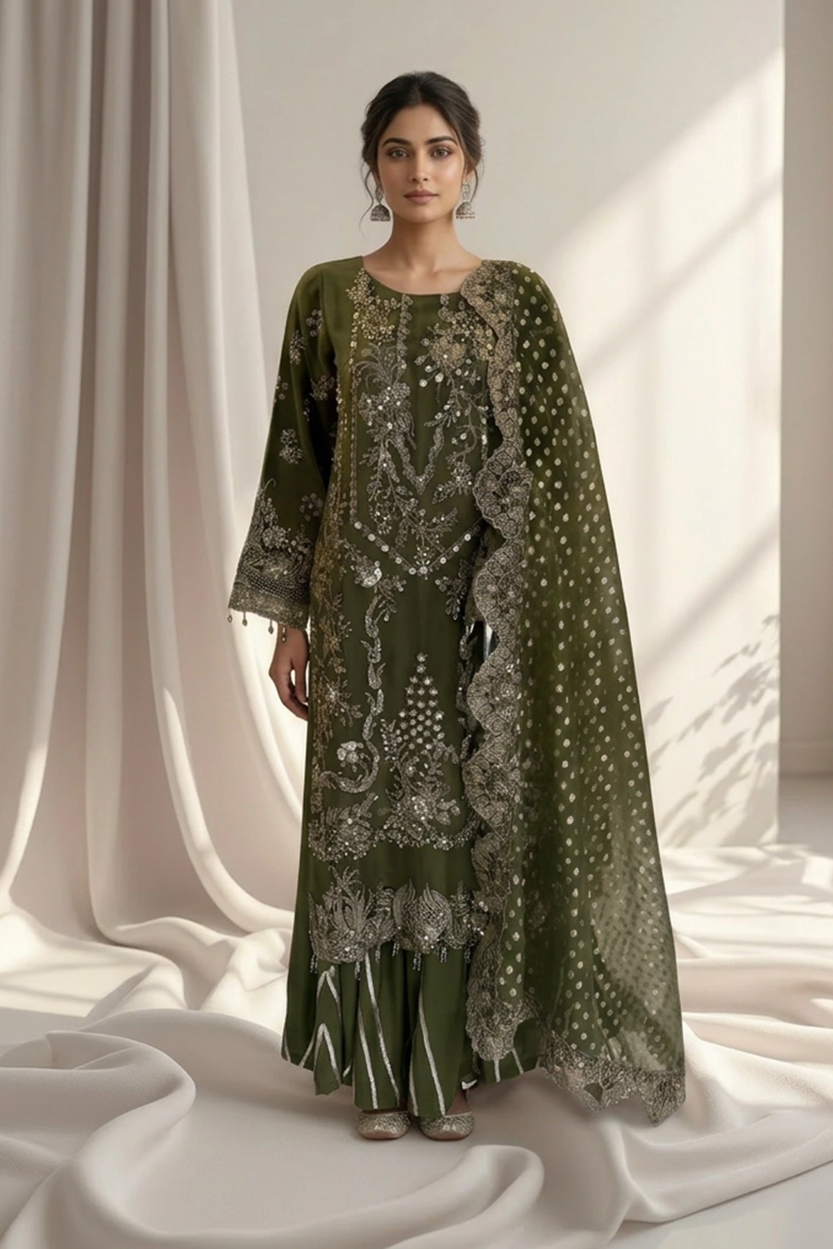 Embroidered Organza Dupatta The look is completed with an embroidered organza dupatta, adding texture, depth, and a beautifully refined finish.