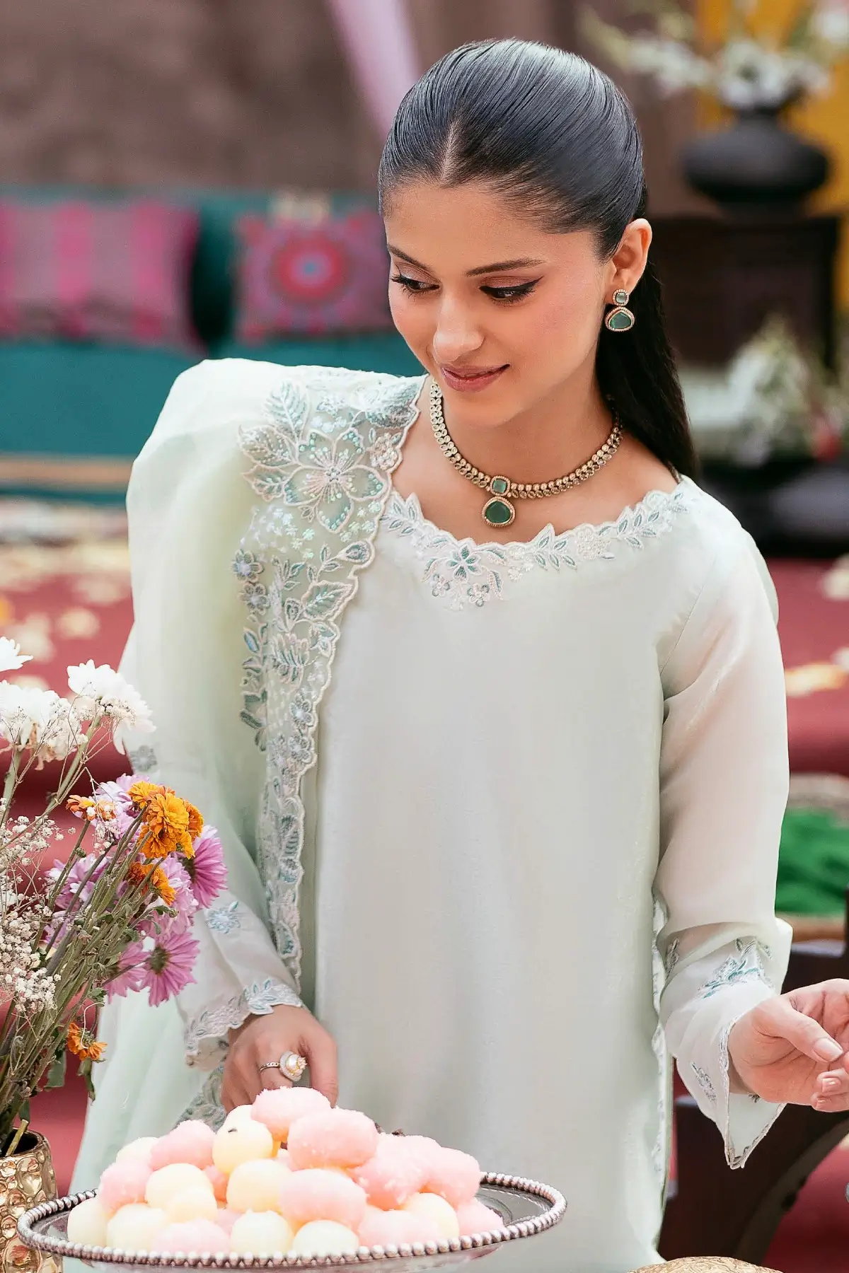 Embroidered Organza Dupatta The look is completed with an embroidered organza dupatta, adding lightness, texture, and a delicately refined touch.
