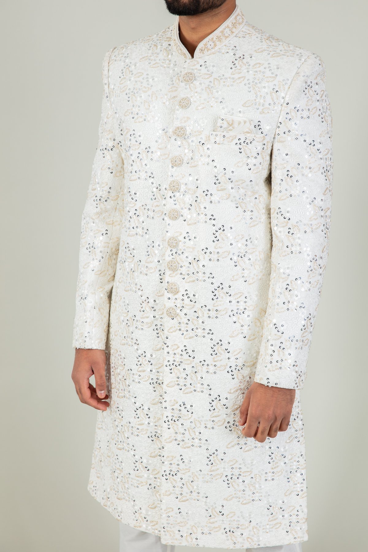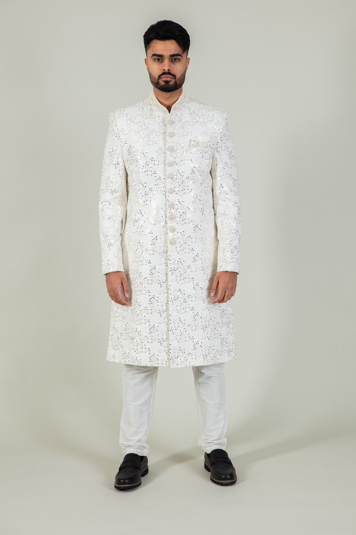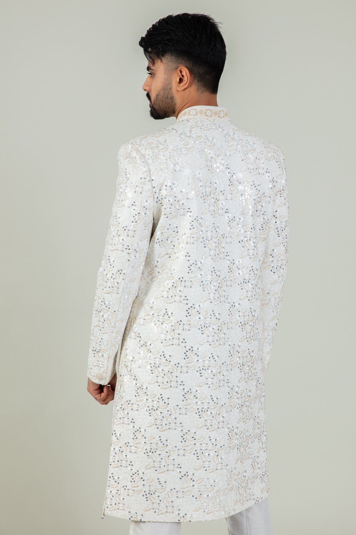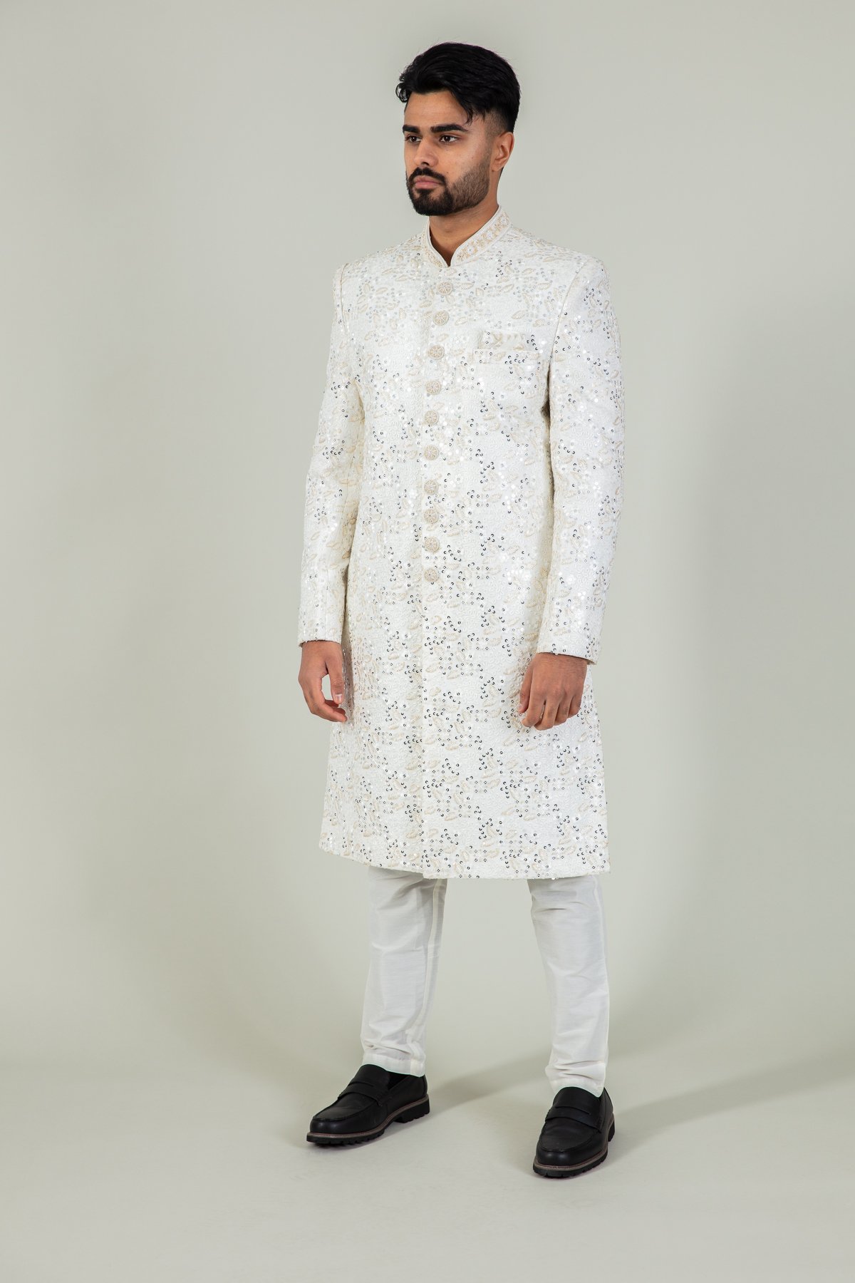 This beautiful men’s raw silk sherwani features a long coat all closed upto the collar and below the knee lengthwise, embellished with buttons on the front and an embroidered collar. It is designed with beautiful thread-work embroidered detailing all over the front and full length sleeves with sequence embellishments. The look is finished with churidaar trousers.