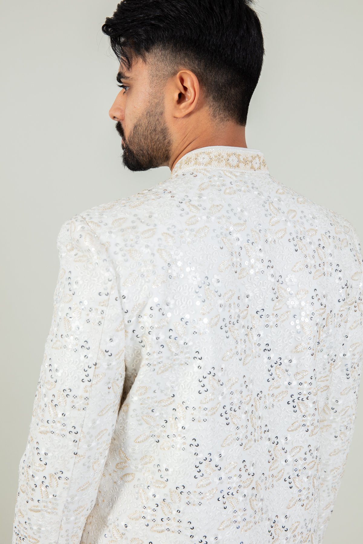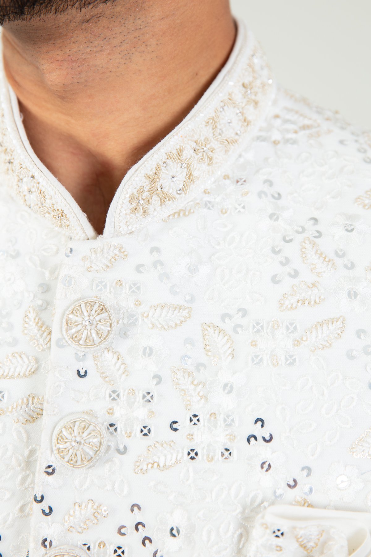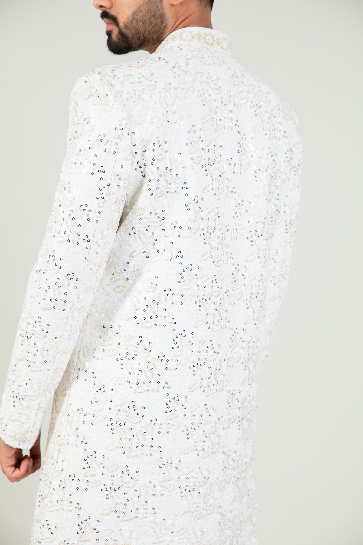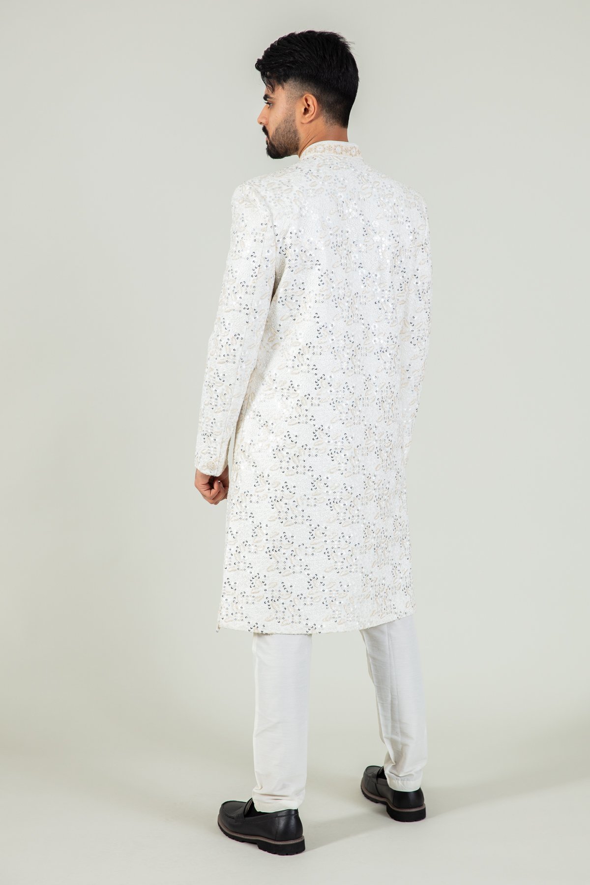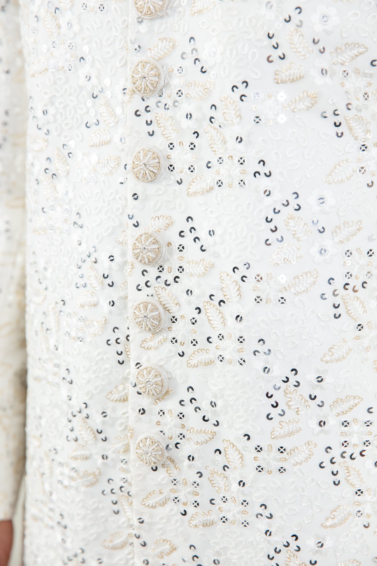 This beautiful men’s raw silk sherwani features a long coat all closed upto the collar and below the knee lengthwise, embellished with buttons on the front and an embroidered collar. It is designed with beautiful thread-work embroidered detailing all over the front and full length sleeves with sequence embellishments. The look is finished with churidaar trousers.