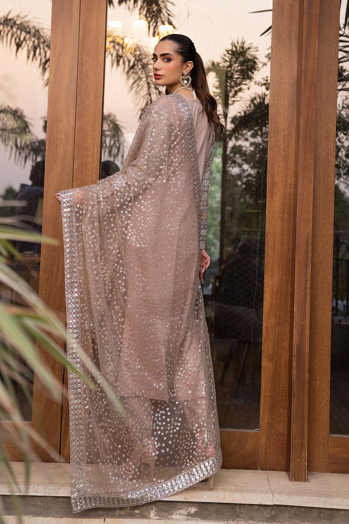 This beautiful 3 piece cut features a straight shirt with v-designed embroidered front, finished with full length embroidered sleeves. It comes with straight leg trousers and the look is finished with a luxury embroidered organza dupatta.