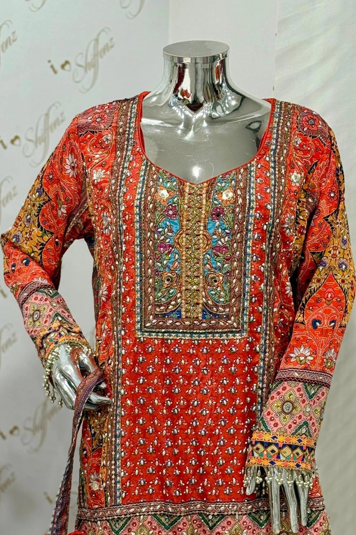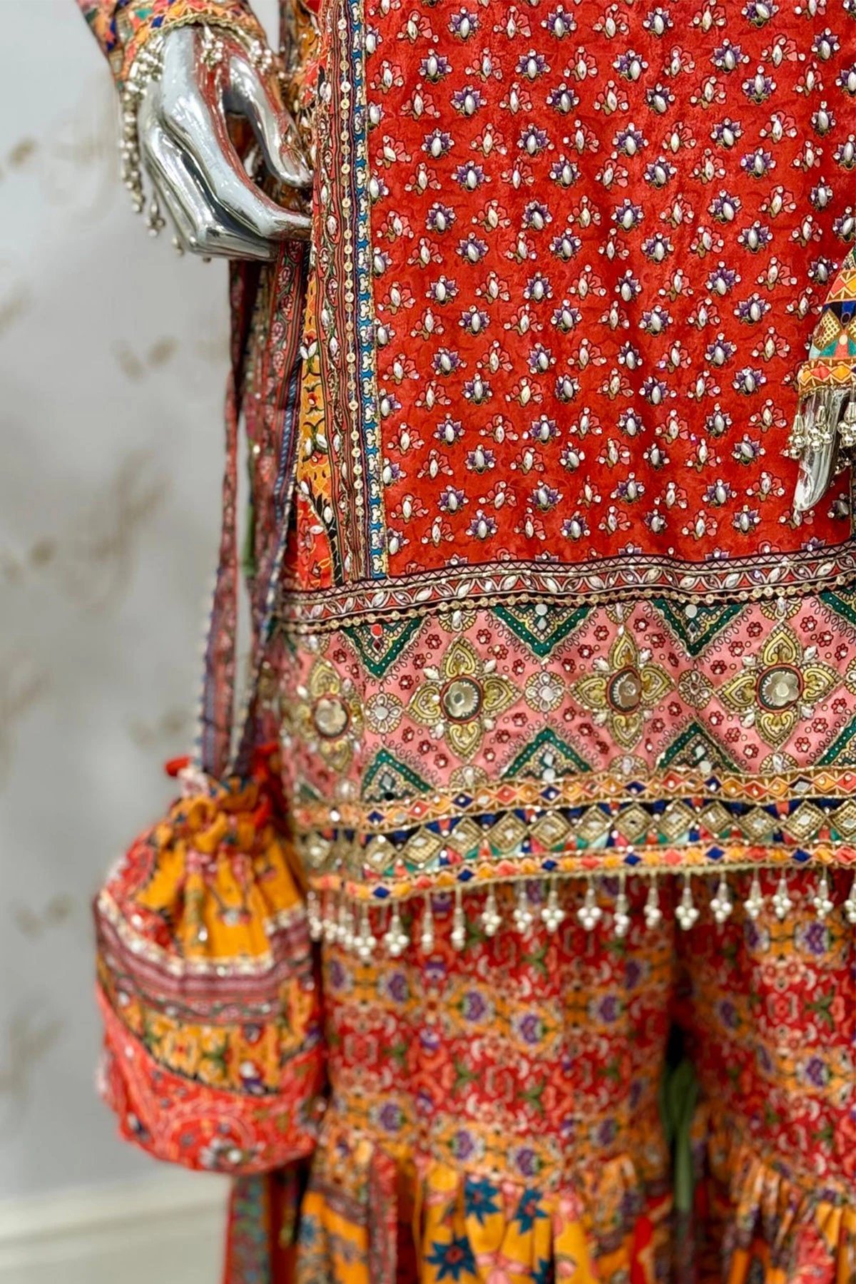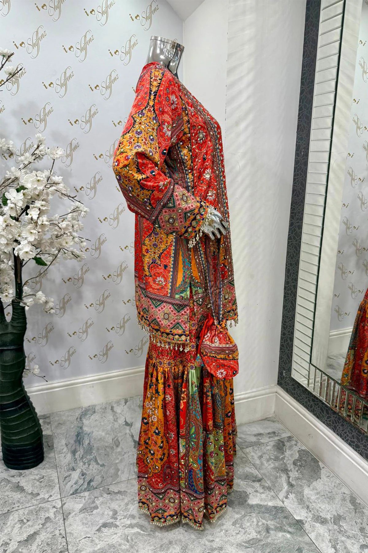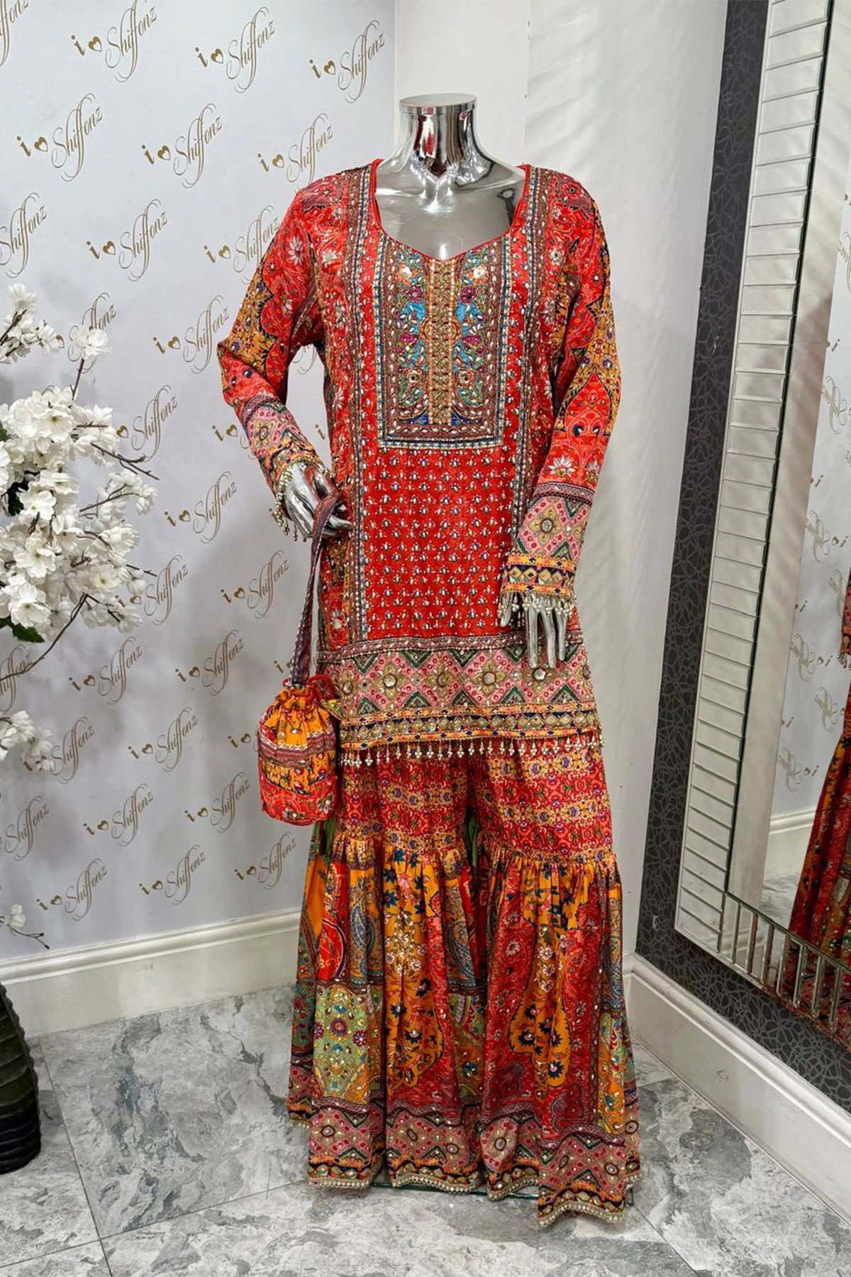 This beautiful 3 piece suit features a straight luxury printed shirt with pearl and sequence embellishments throughout with full length embroidered sleeves with dangling beads on the cuffs. Paired with an embroidered gharara and the look is finished with a chiffon embroidered dupatta. Potli embroidered bag is also included.