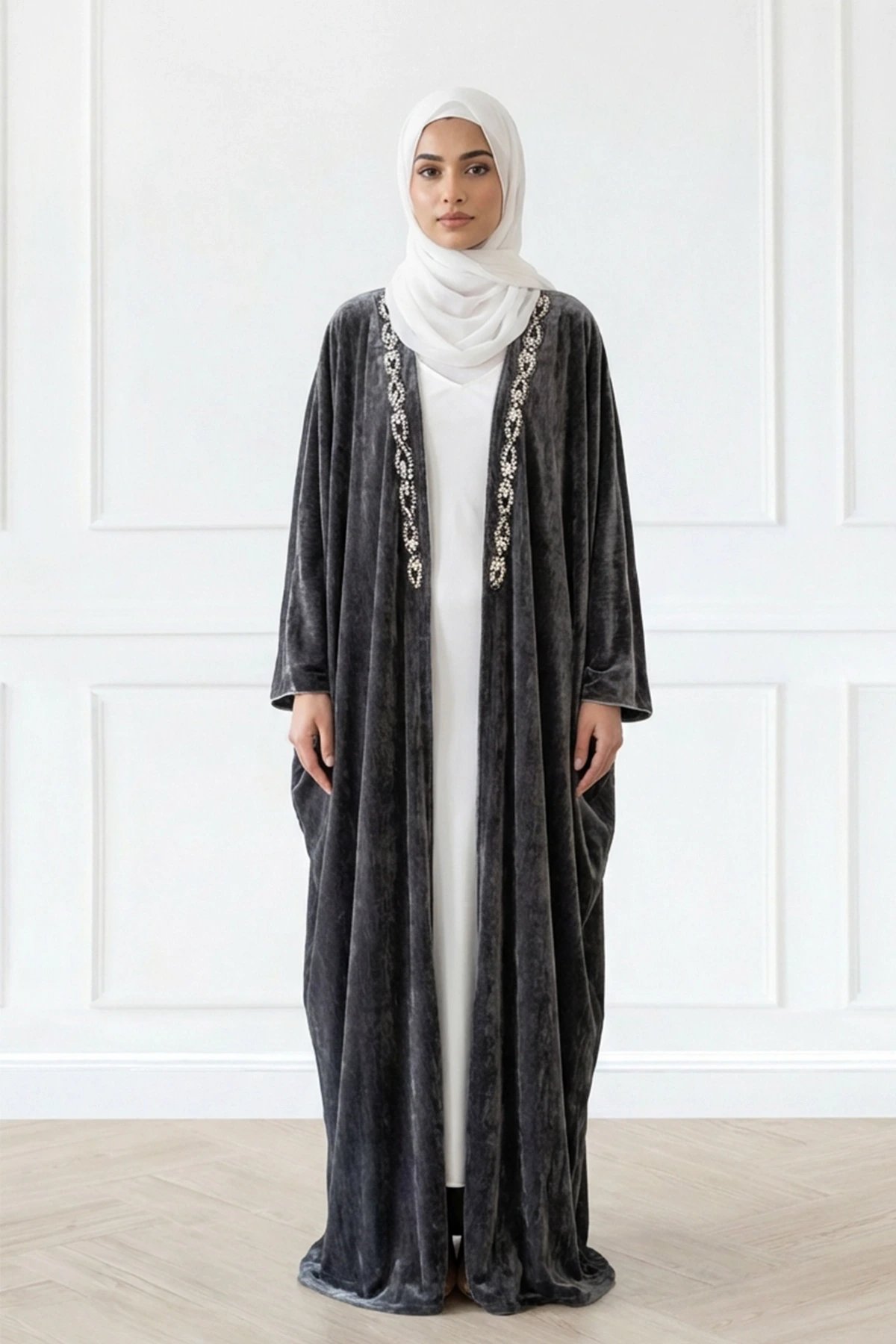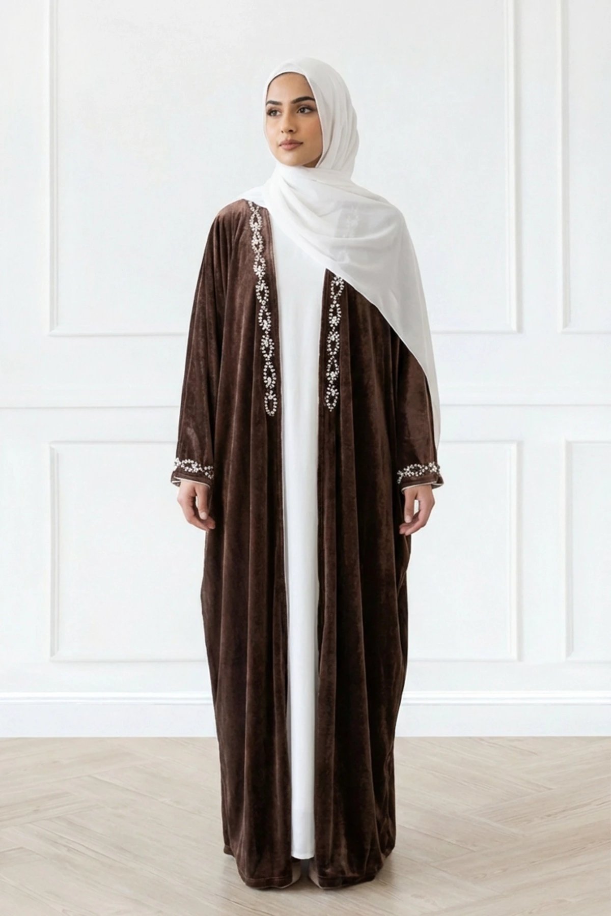 Roza collection abaya blends understated texture with delicate white embroidery running along the front panels. The vertical lines add depth to the fabric, while the open-front design pairs beautifully with the white inner garment for a balanced, sophisticated look. The look is finished with a white chiffon hijab. Ideal for everyday elegance or elevated occasions.