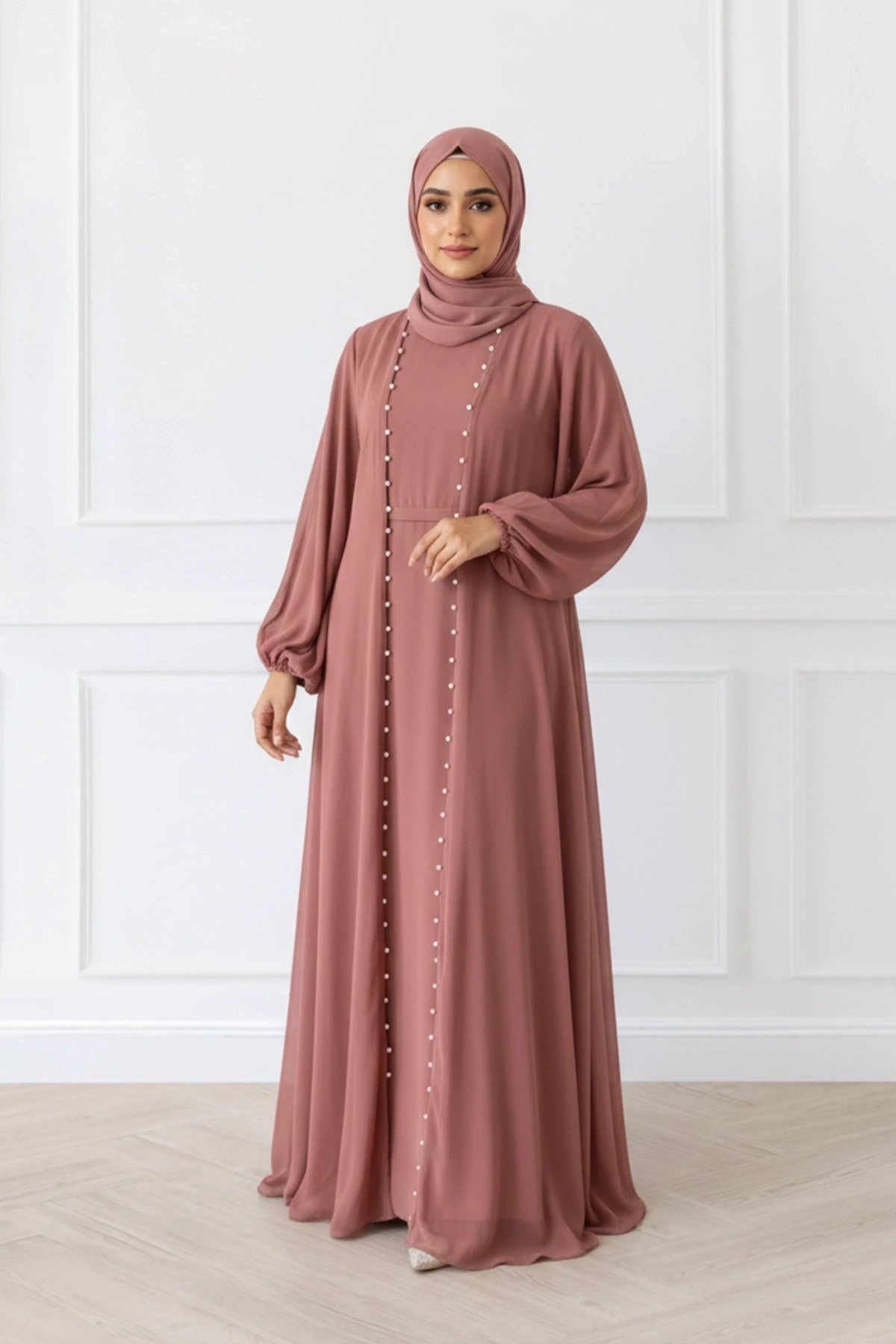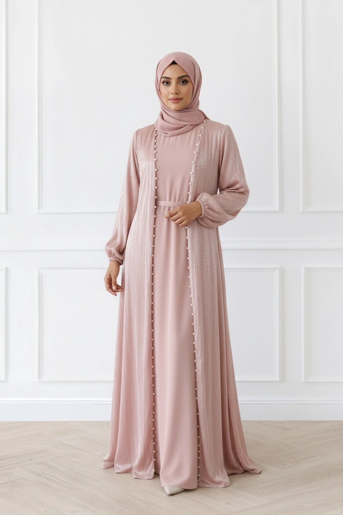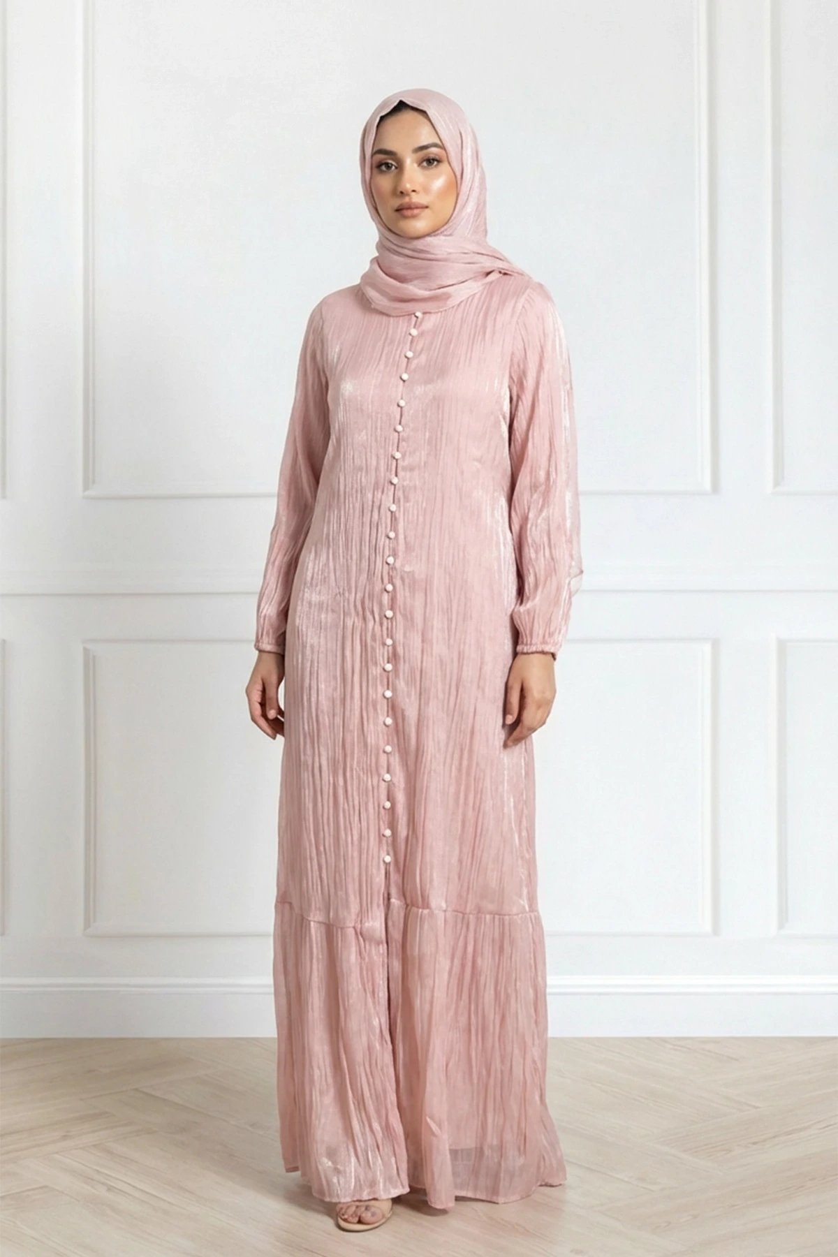 This tissue‑net abaya blends sophistication with understated charm. The fabric’s signature crinkled texture gives it a luxurious, floaty movement, complemented by a structured front placket and full length sleeves for modest coverage. Its tiered hemline adds gentle volume without overwhelming the silhouette. It comes with a matching hijab to complete the look. A beautiful choice for events, gatherings, or elevated everyday wear.