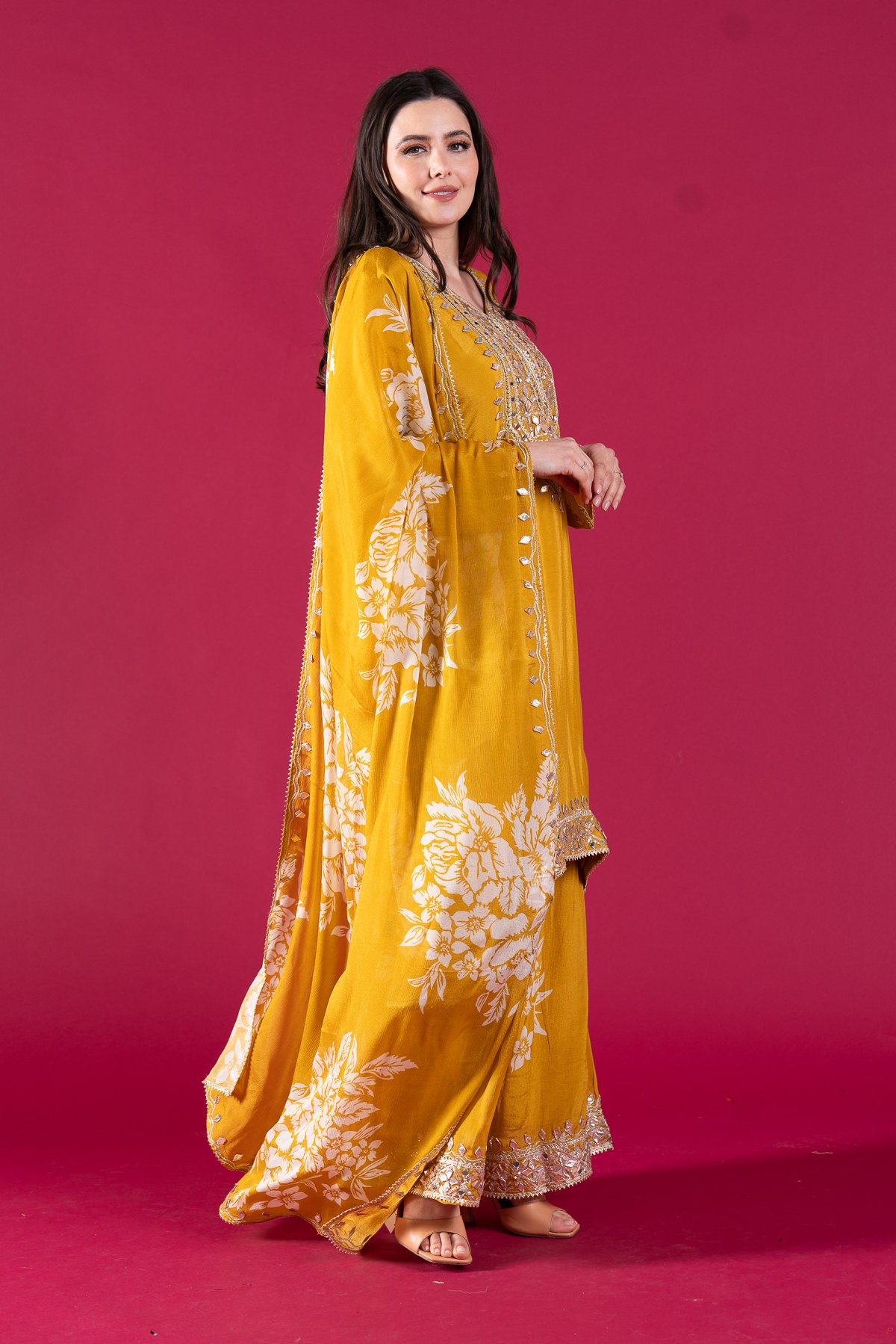 This beautiful 3 piece suit features a pure silk straight shirt with luxury thread work embroidery throughout with full length sleeves finished with embroidered cuffs. Paired with a silk printed plazo with an embroidered border and the look is finished with a contrasted silk printed dupatta with embellished borders.