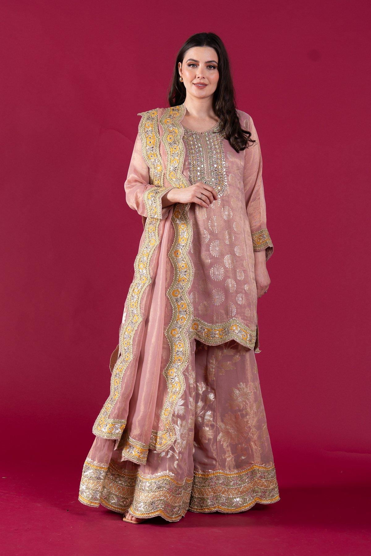 This beautiful 3 piece suit features a straight massori shirt with luxury thread and dori work embroidery with pressed mirror embellishments throught, finished with full length embroidered sleeves. Paired with a massori printed sharara with an embroidered border. The look is finished with a massori embroidered dupatta. Note: This free size suit can easily be adjusted to your size preference.