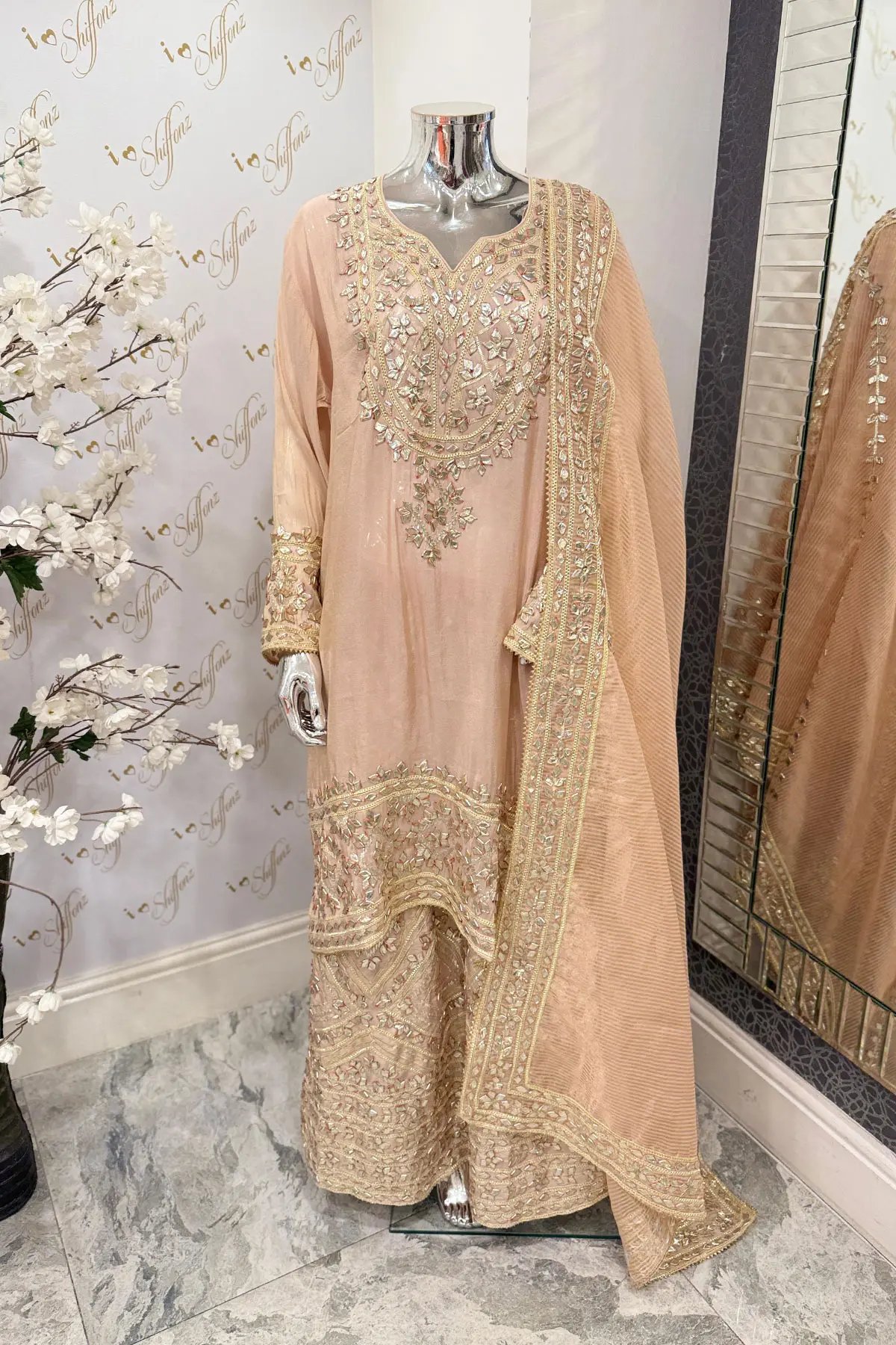 This beautiful 3 piece suit features a straight massori semi stitched shirt with luxury thread and gotta work embroidery throughout, finished with full length embroidered sleeves. Paired with a massori embroidered lengha. The look is finished with a massori embroidered dupatta. Note: This is a semi stitched design; sides need to be stitched according to your size preference.
