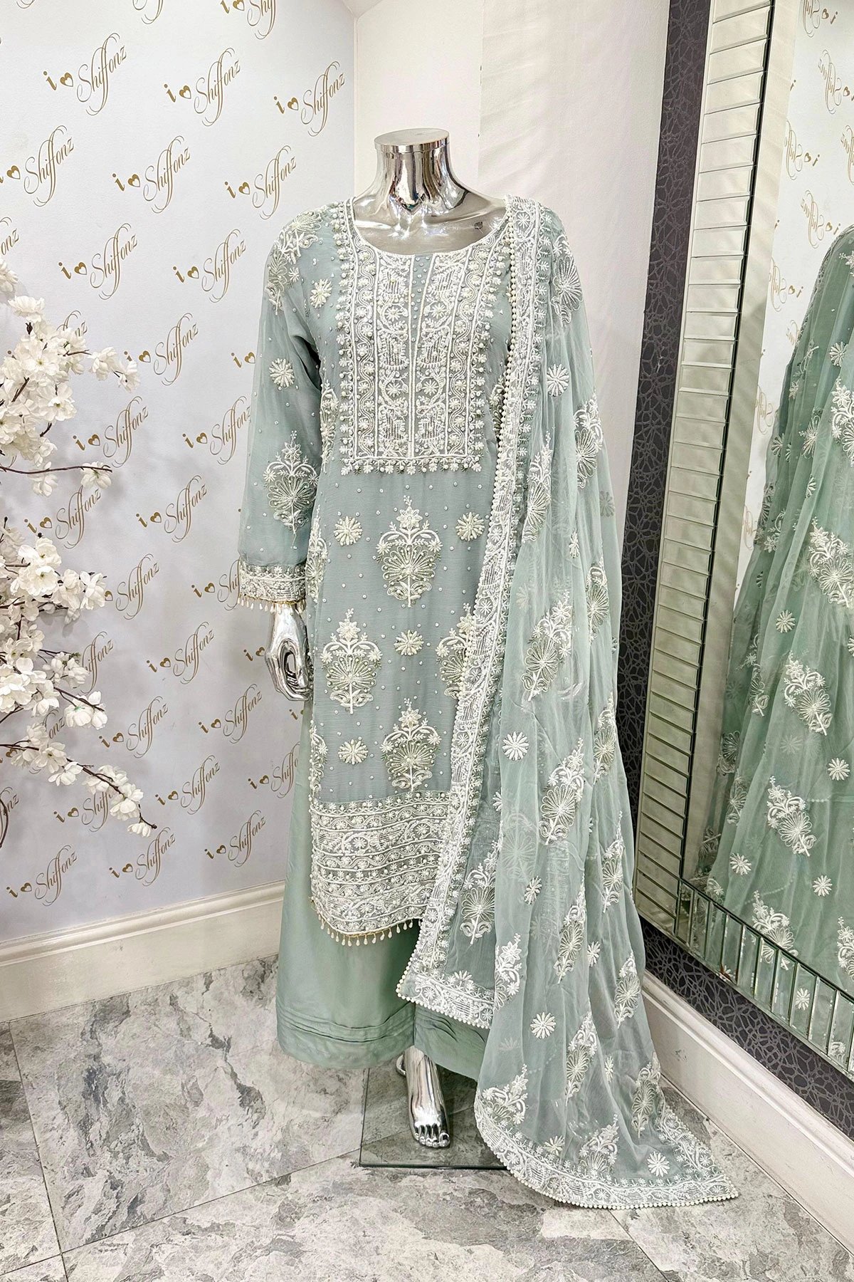 This beautiful 3 piece chiffon suit features a straight shirt with luxury thread work embroidery suit with pearl embellishments, finished with full length embroidered sleeves. Paired with wide leg plazo trousers and the look is finished with a chiffon dupatta.