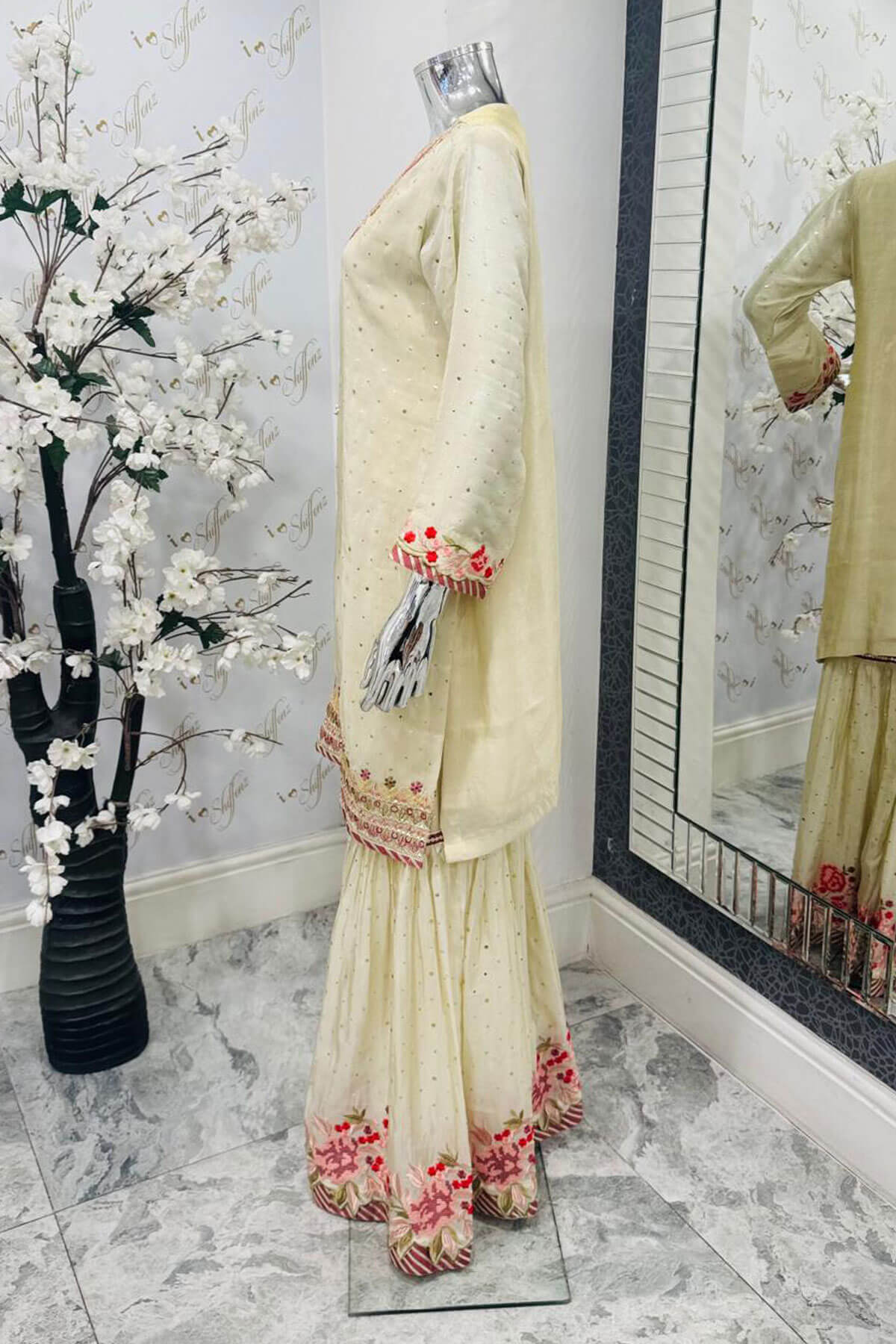 This beautiful 3 piece suit features a straight massori shirt with luxury thread work embroidery throughout with full length embroidered sleeves. Paired with an embroidered massori gharara and the look is finished with an embroidered massori dupatta. Note: This free size suit can be easily be adjusted to your size preference.